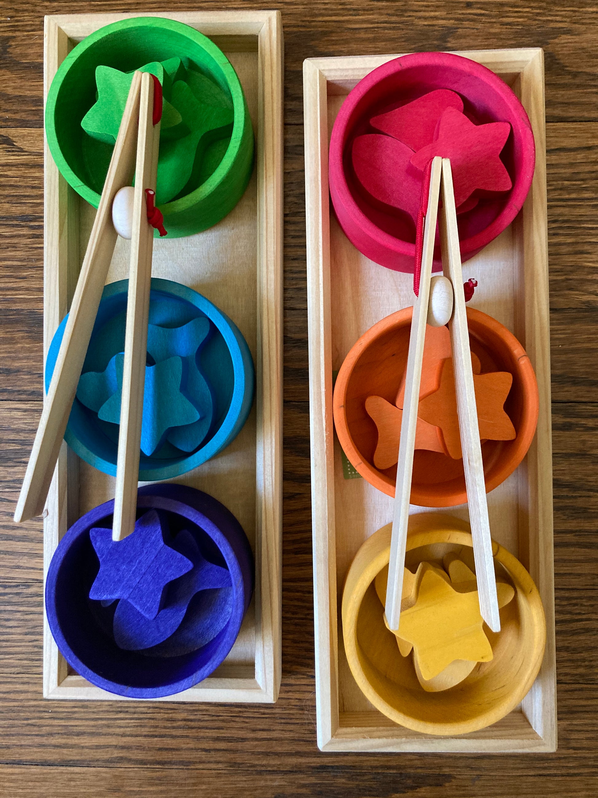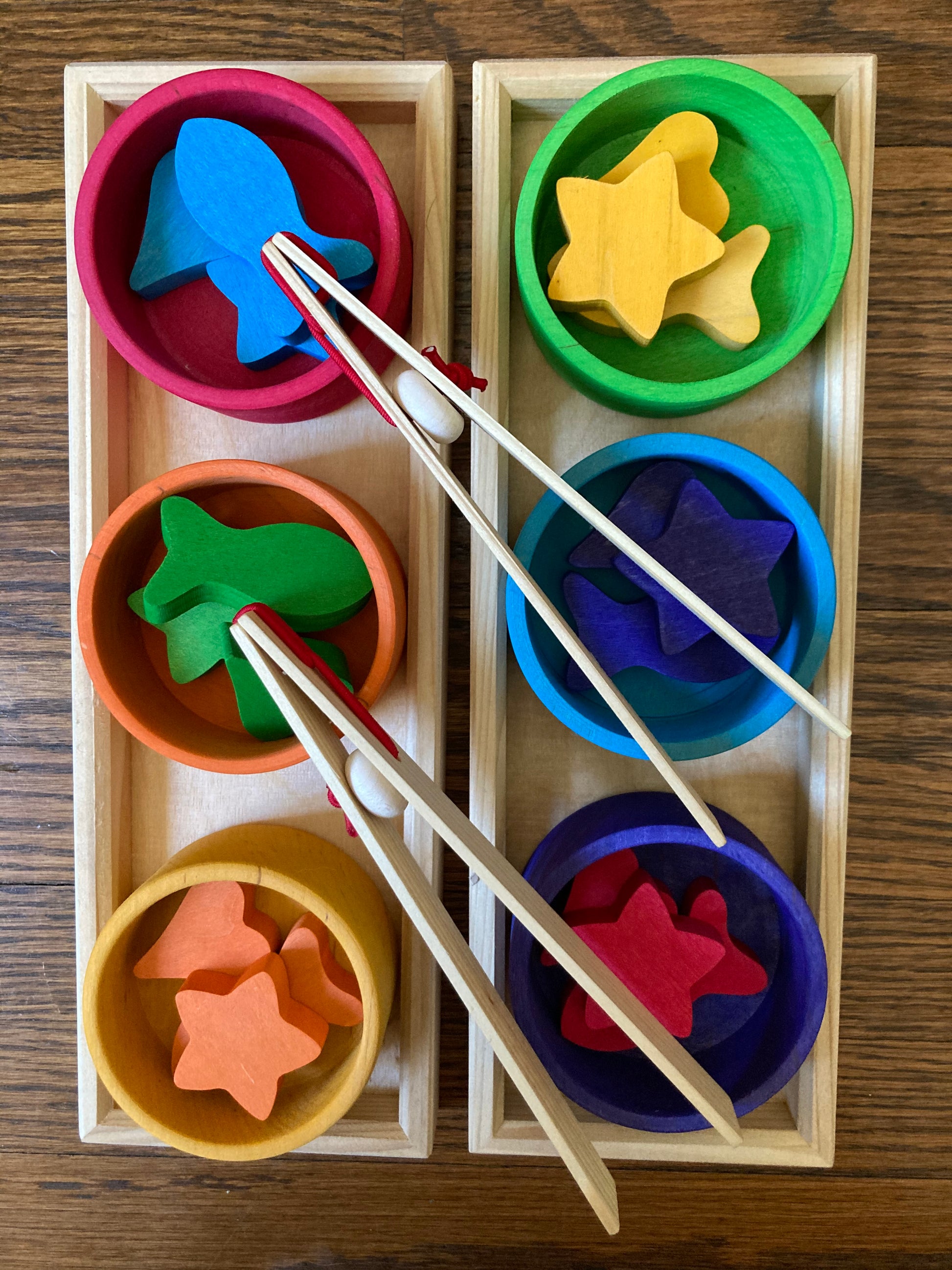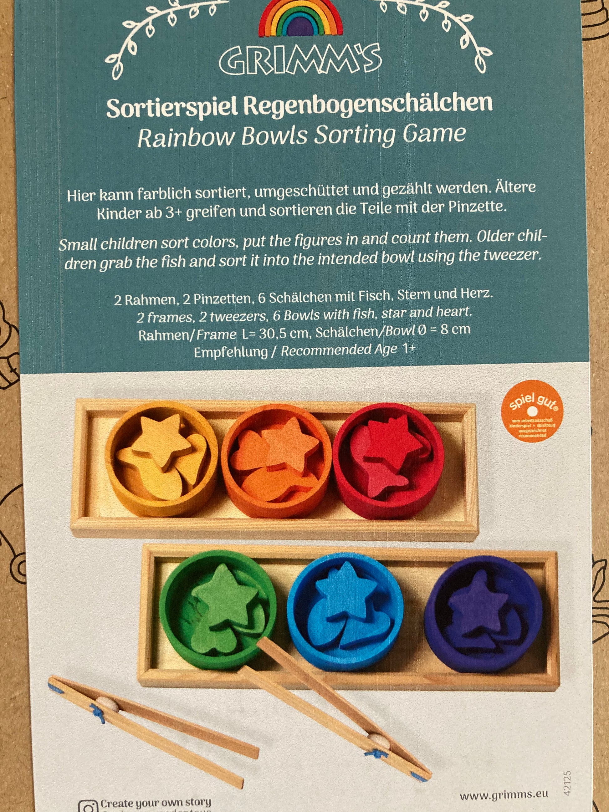 Il existe 6 formes COEUR, 6 formes POISSON et 6 formes ÉTOILE. Le tout en 6 COULEURS ! Les 2 jeux de pinces en bois et les 6 BOLS EN BOIS, un de chacun dans les 6 couleurs rouge, bleu, vert, jaune, orange et violet, complètent ce magnifique et amusant JEU DE TRI DE BOLS ARC-EN-CIEL de l'atelier de menuiserie Grimm's, en Allemagne. Les pinces mesurent 18 cm (7 pouces). Les bols mesurent 8 cm (3 pouces) de diamètre. Chaque pièce en bois mesure 4 à 6 cm (1,5 à 2 pouces).