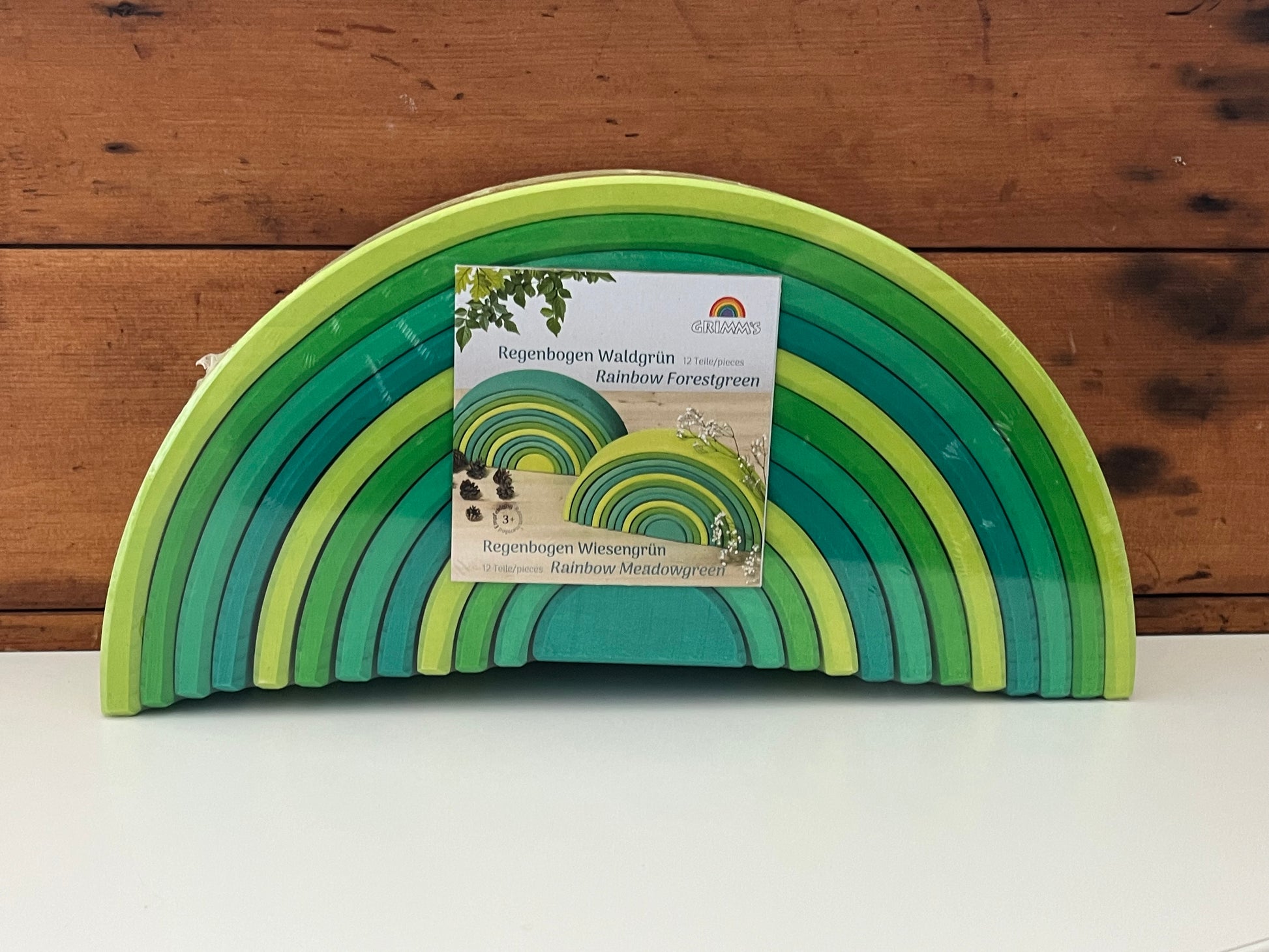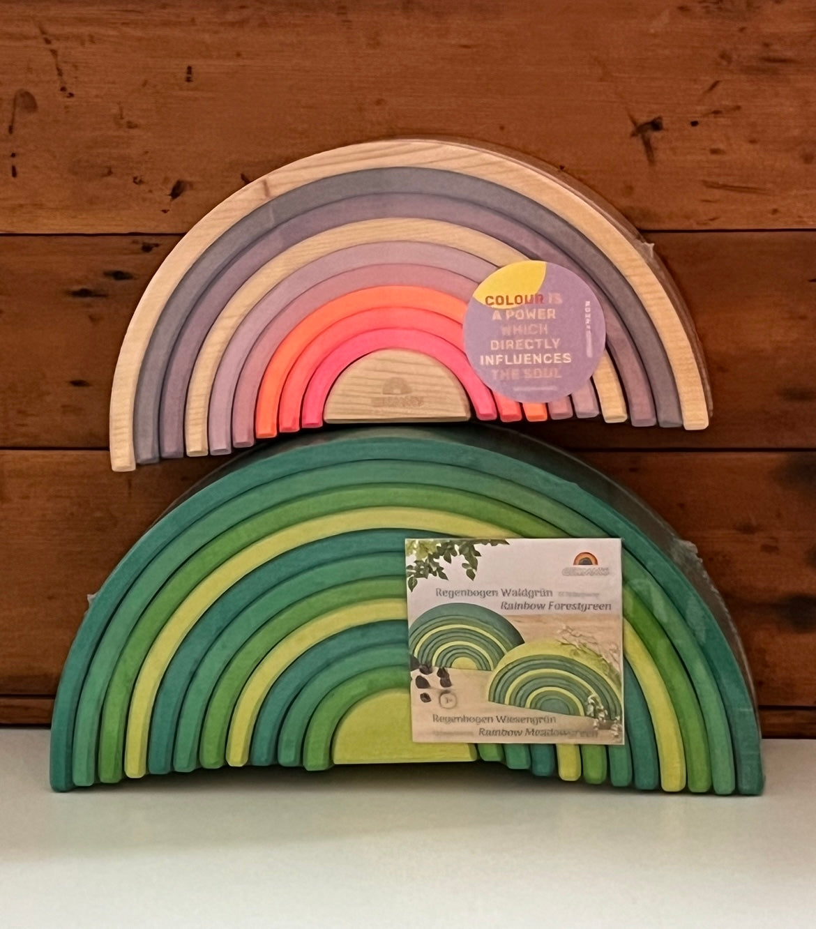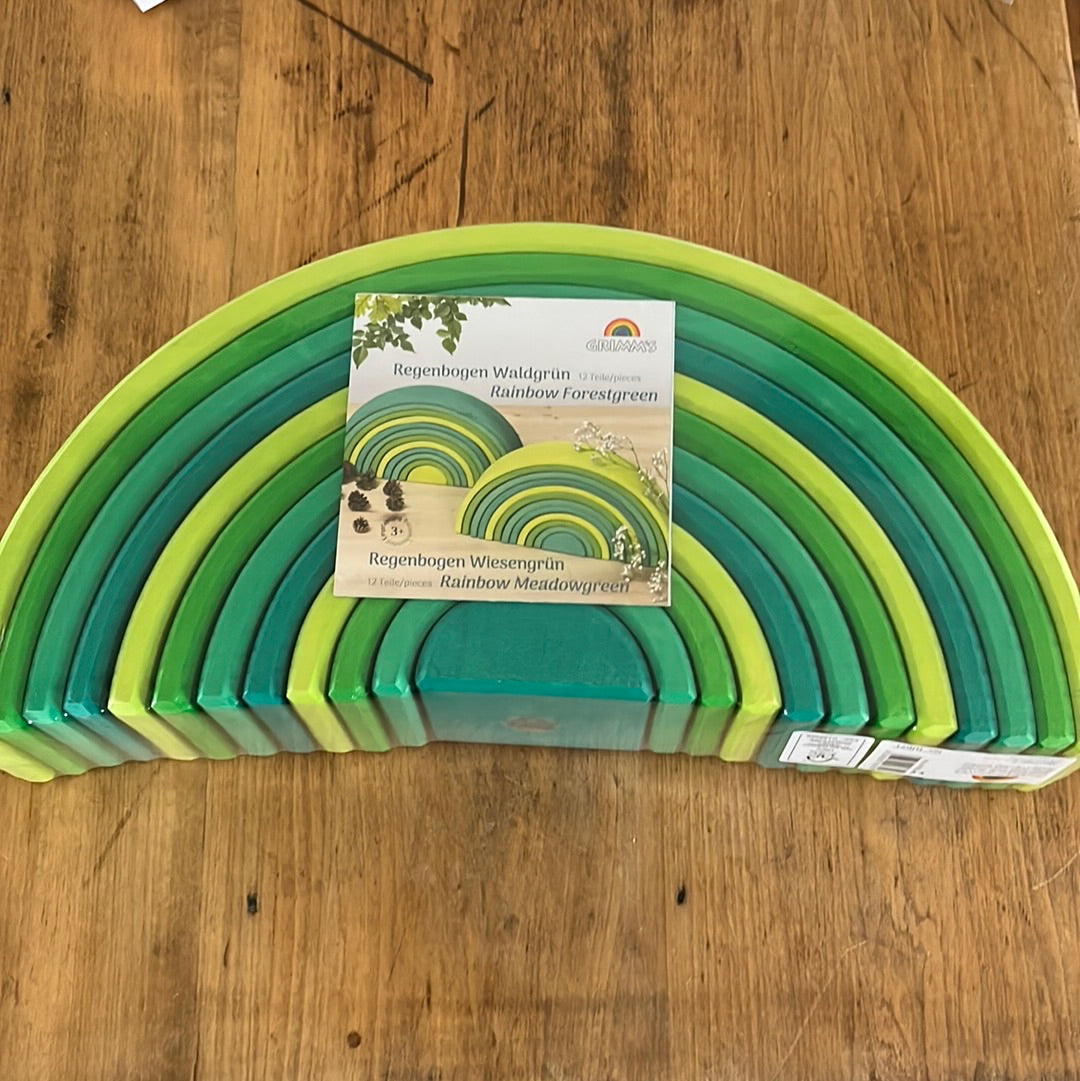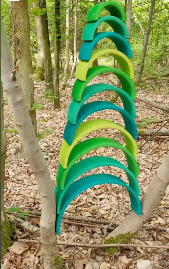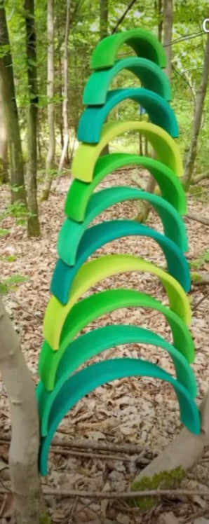 GRANDE ARCHE DE TUNNEL EMPILABLE VERT faite à la main de Grimm en deux choix de séquences de couleurs. Les deux ont 12 arches empilables ! Le plus grand mesure 30 cm (12 pouces) de long ! En ordre croissant, empilable jusqu'au plus petit arc de 8 cm (3 pouces).
