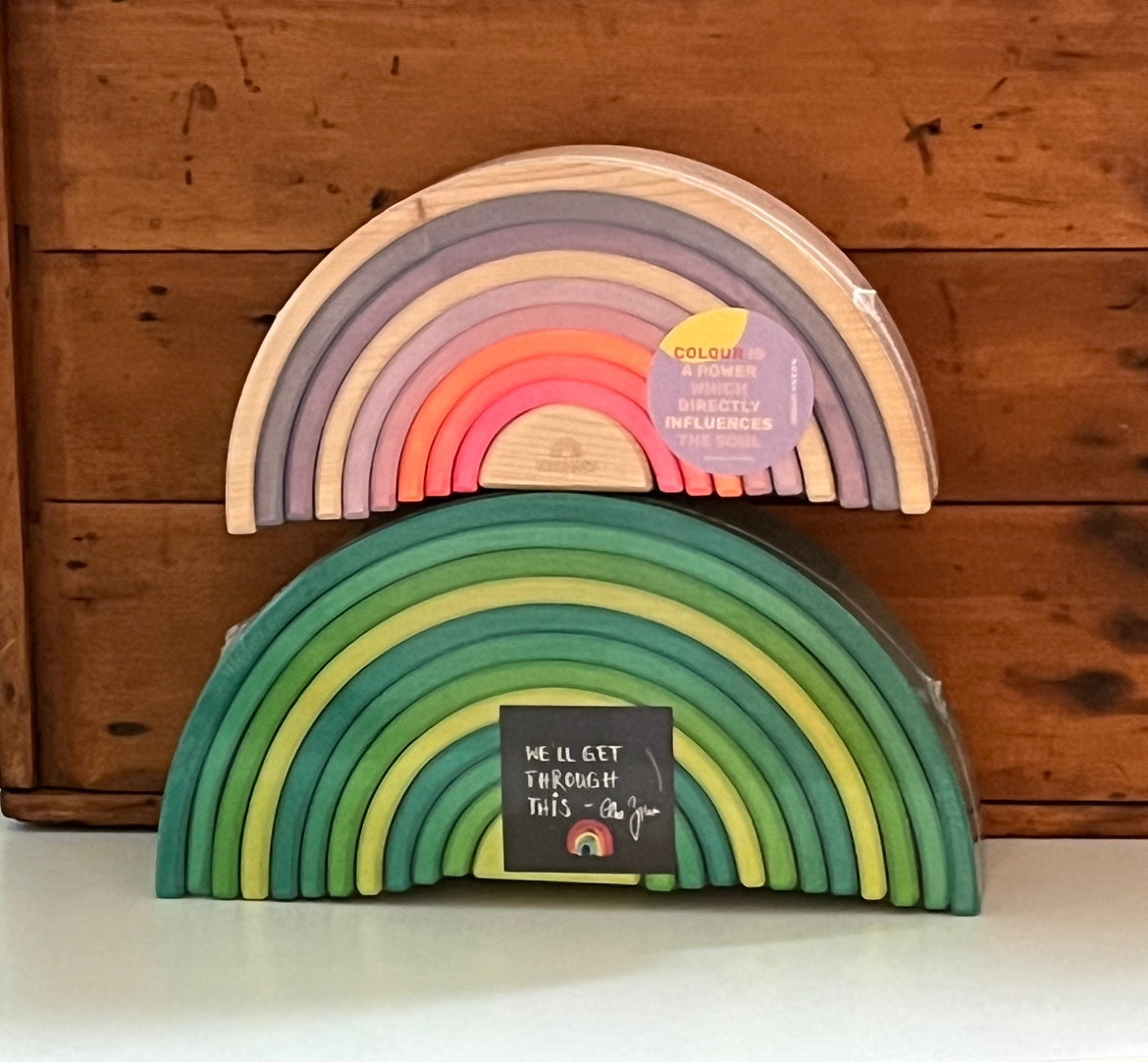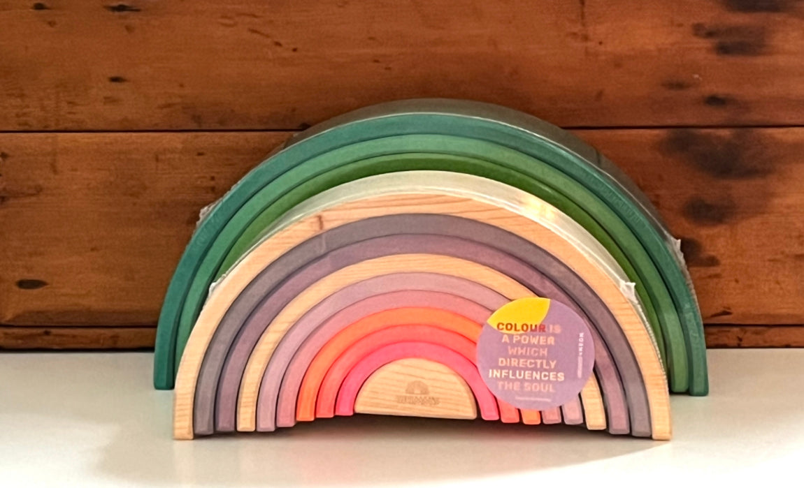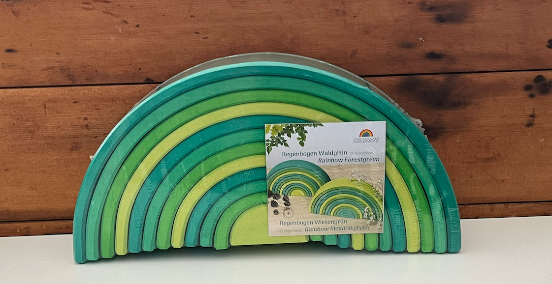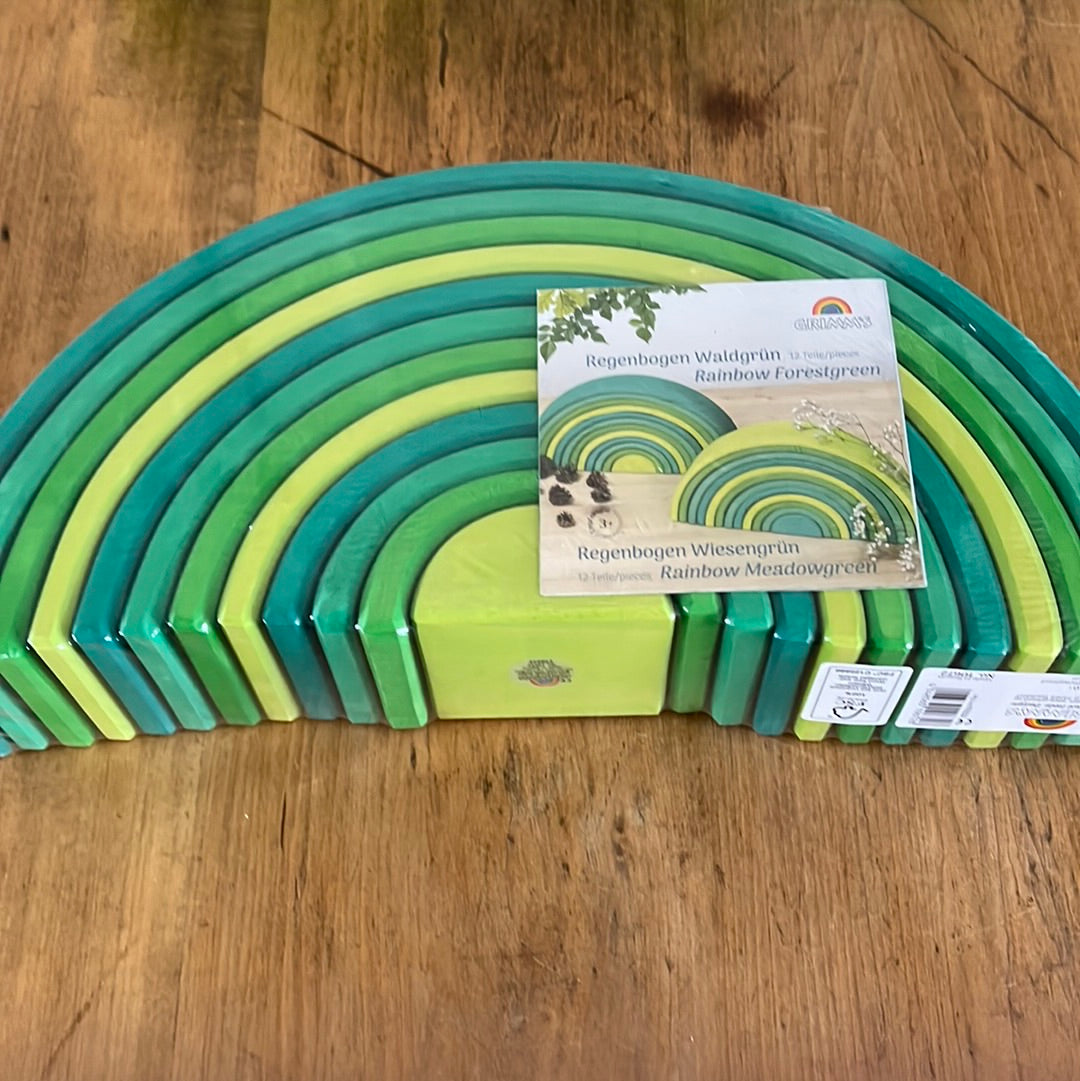 GRANDE ARCHE DE TUNNEL EMPILABLE VERT faite à la main de Grimm en deux choix de séquences de couleurs. Les deux ont 12 arches empilables ! Le plus grand mesure 30 cm (12 pouces) de long ! En ordre croissant, empilable jusqu'au plus petit arc de 8 cm (3 pouces).