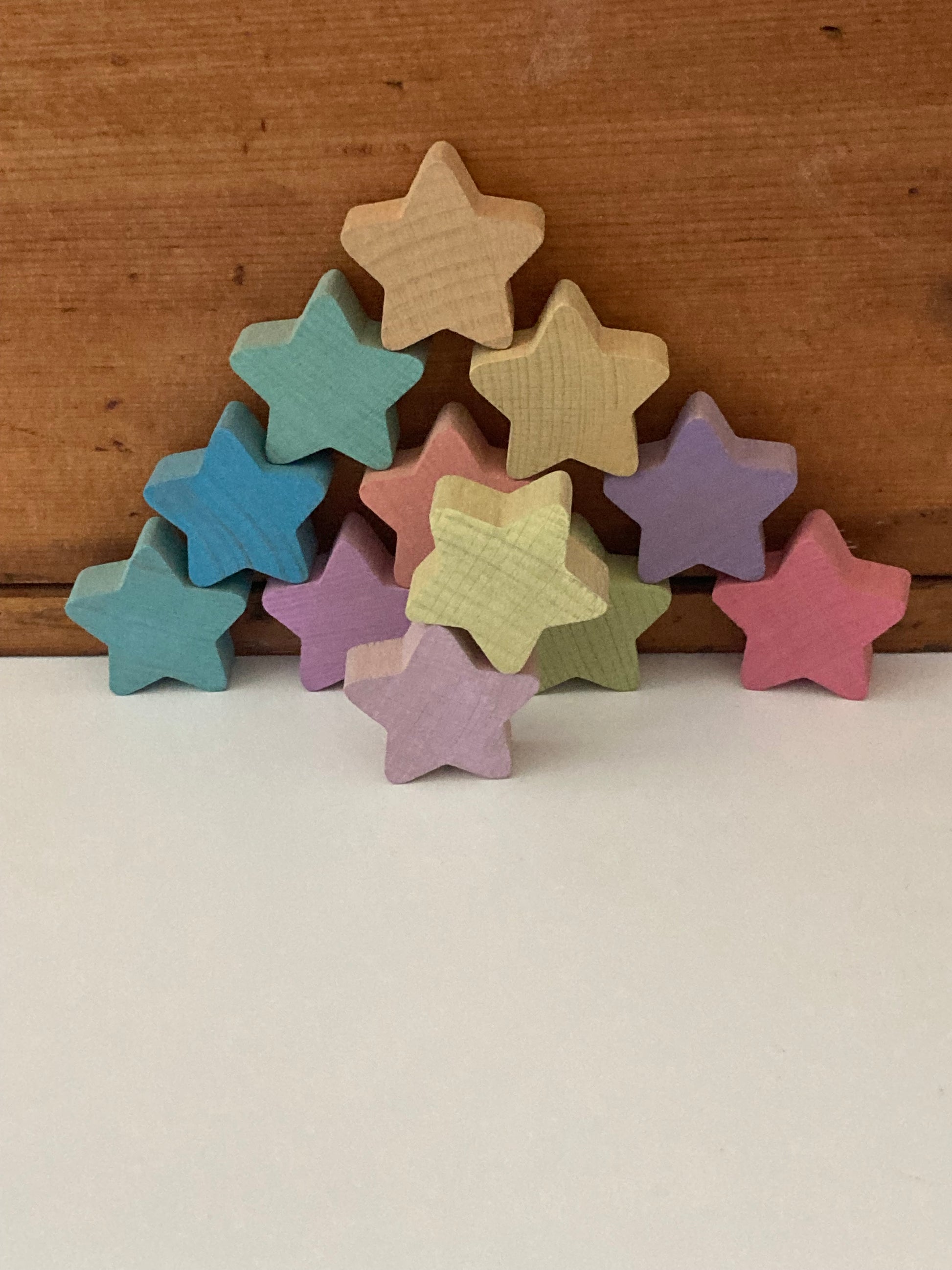 Juste parce que ! DOUZE ÉTOILES EN BOIS dans 12 NUANCES PASTELES d’une belle teinture de couleur pastel durable. Empilable ! Emboîtable ! Du plaisir sucré !