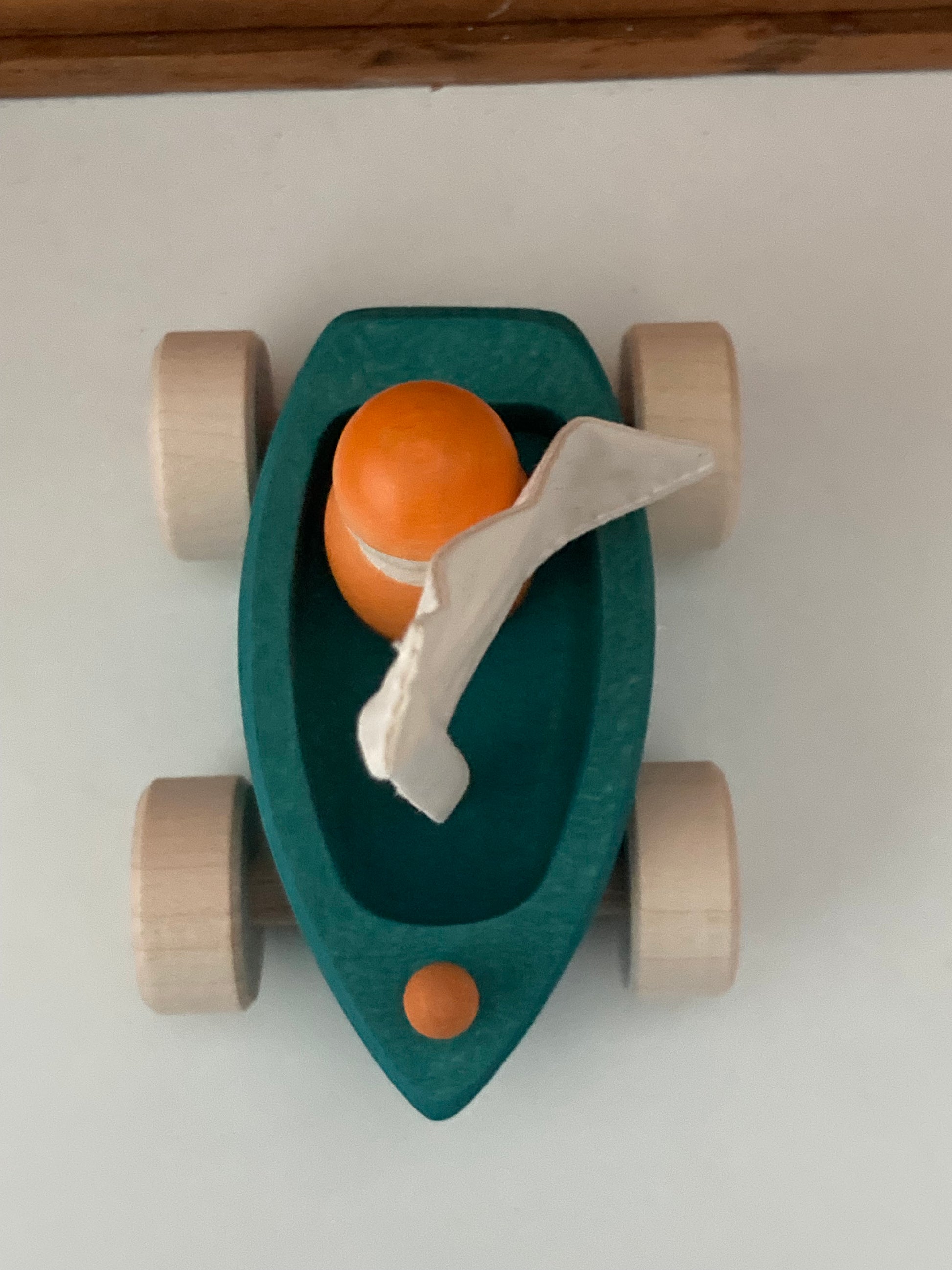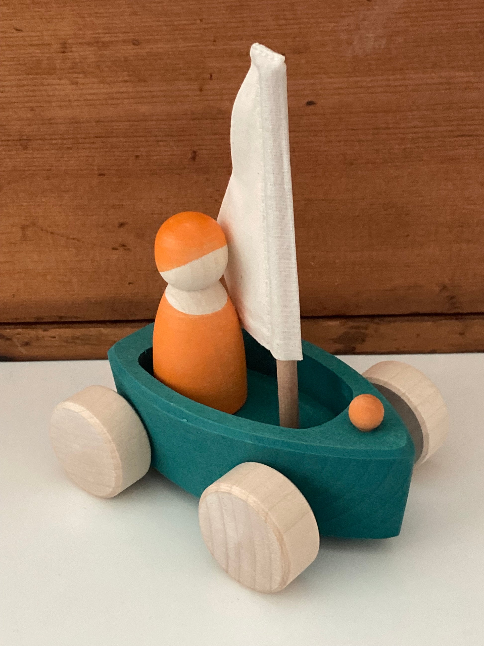 Jouet en bois - VOILIER en EVERGREEN et SKIPPER en ORANGE… sur roues !