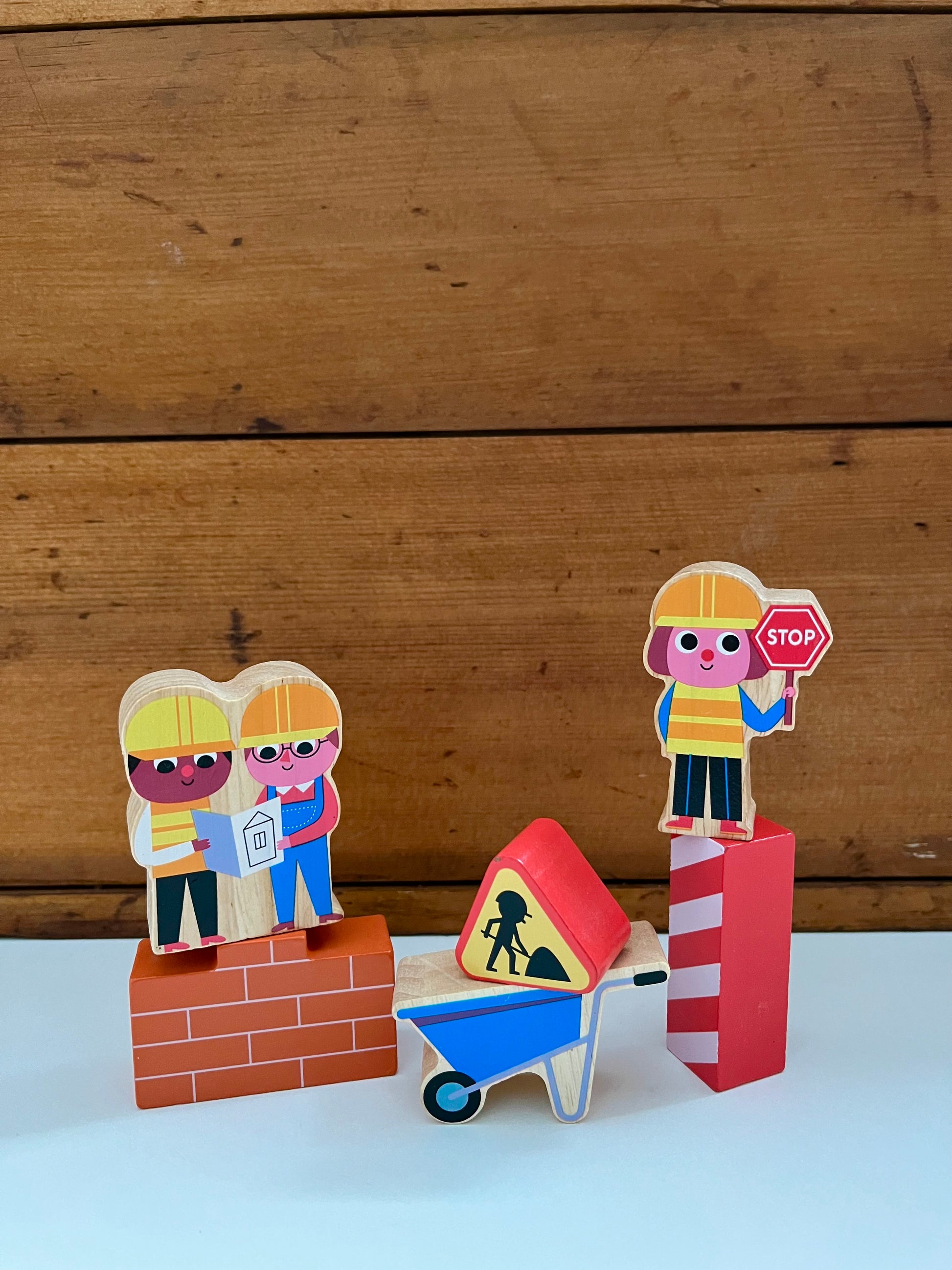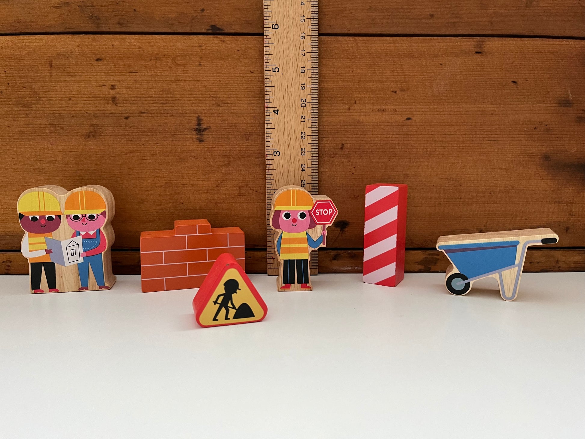 Les ouvriers du bâtiment sont des hommes et des femmes... ce qui est agréable à voir... et les pièces d'équilibrage en bois comprennent également : de nombreuses poutres, des murs en briques, une brouette, des panneaux et des poteaux de sécurité et d'avertissement. 27 pièces au total.