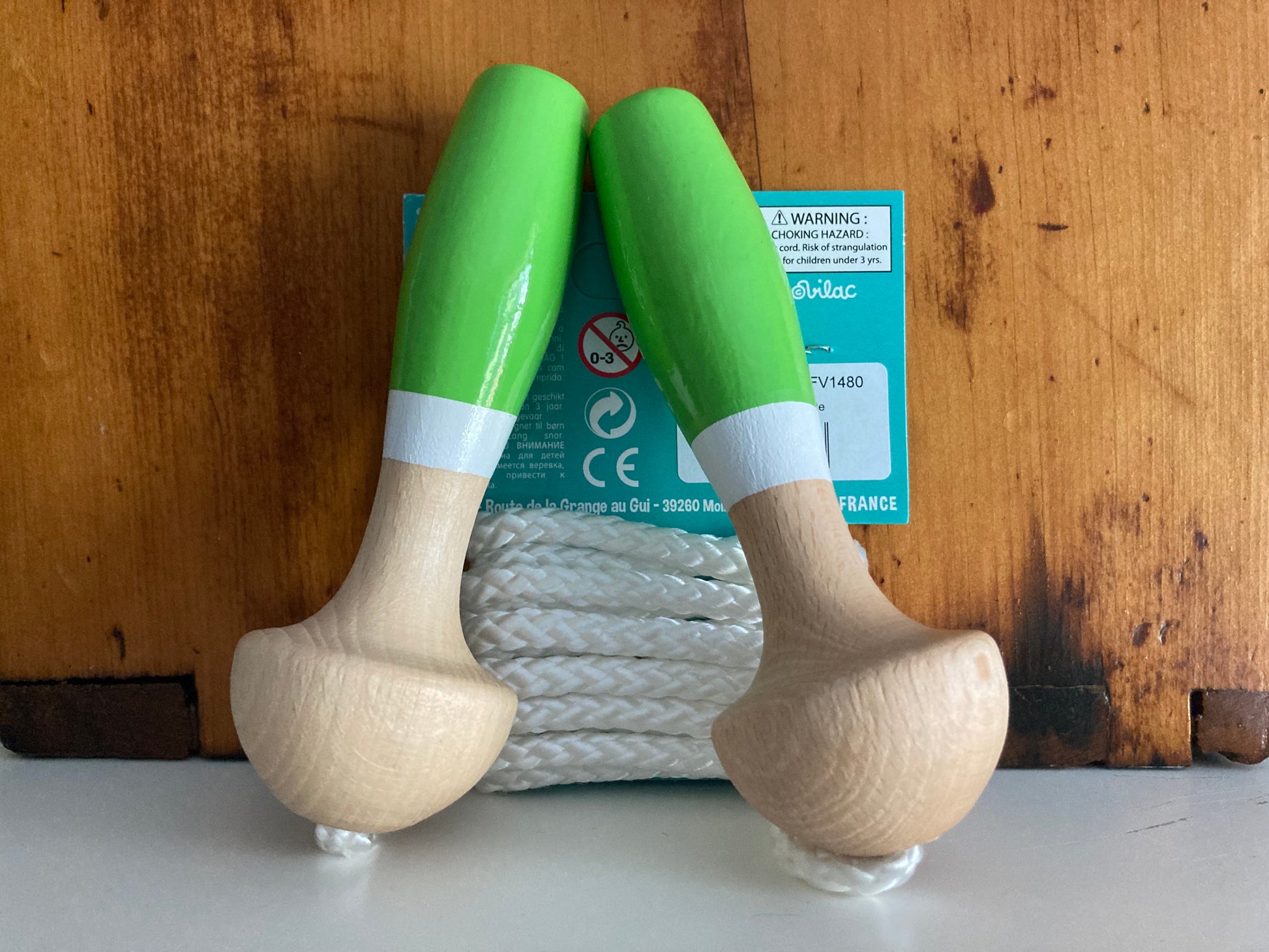 Poignées en bois massif, peintes d'un vert vif brillant, attachées à une corde de bateau en nylon de qualité supérieure. Parfait pour jouer à l’intérieur ou à l’extérieur.