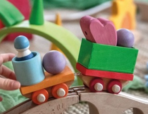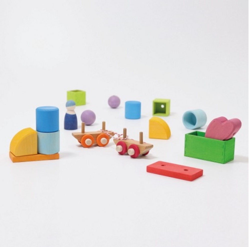 De l'atelier de menuiserie de qualité Grimm's, voici leur TRAIN JOUET EN BOIS et leur ENSEMBLE DE BLOCS À CONSTRUIRE.