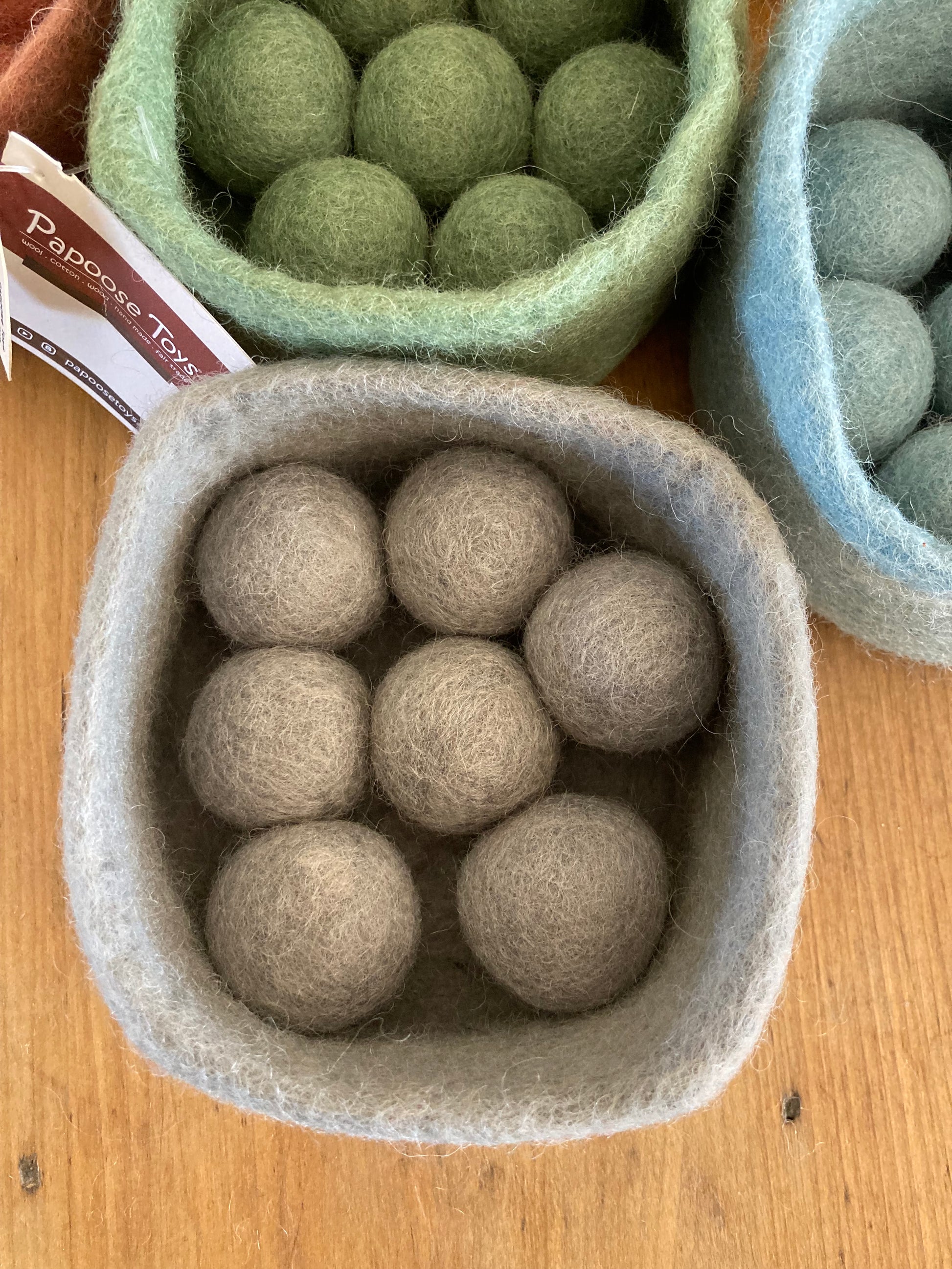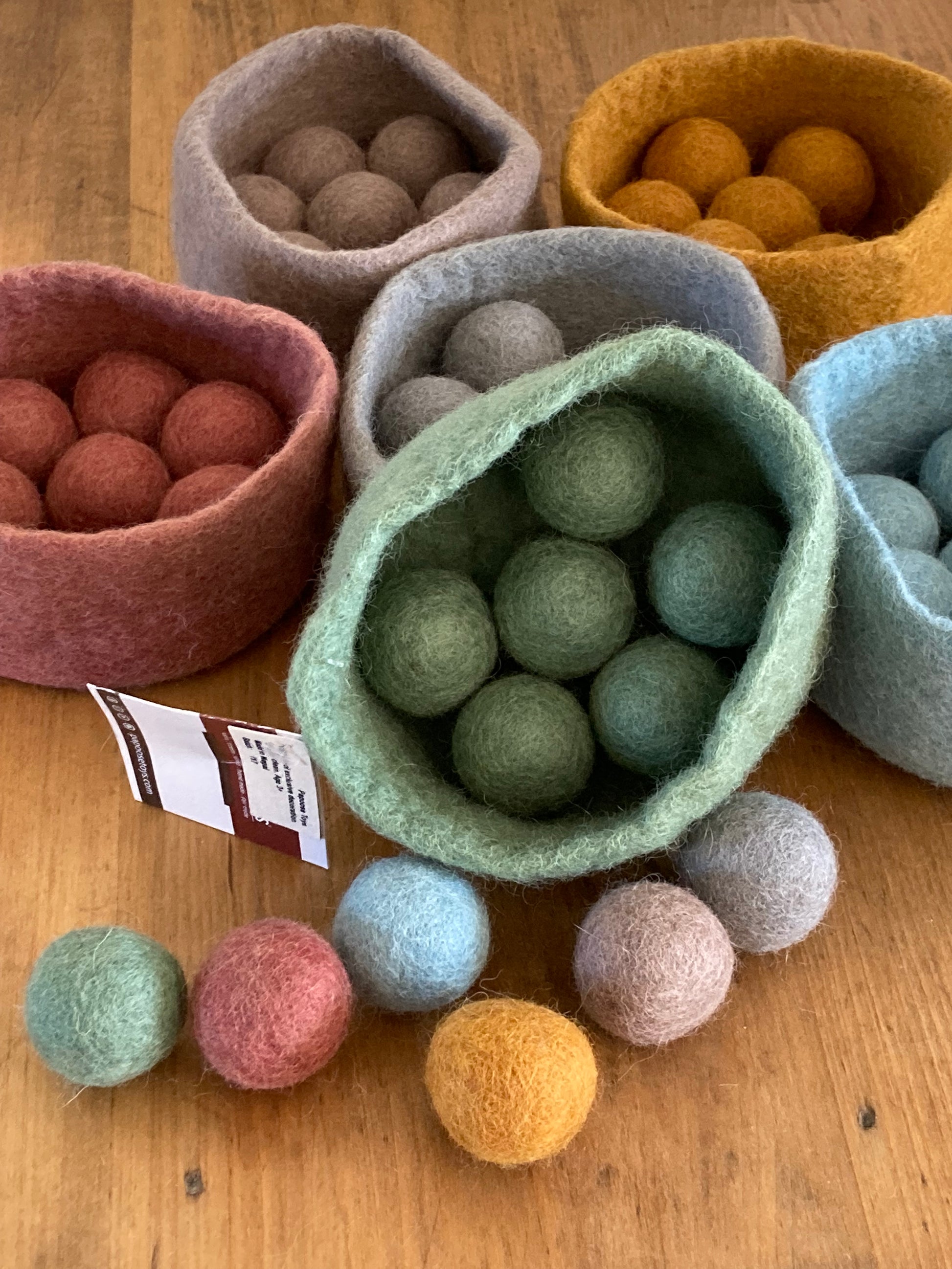 ENSEMBLE DE BOULES ET DE BOLS EN LAINE FEUTRE TERRE - les 48 pièces ! Par Papoose Toys.