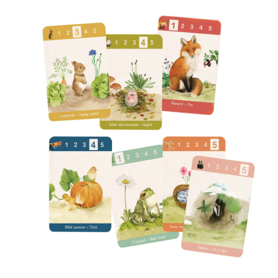 The RABBIT FAMILY. The HEDGEHOG FAMILY. The CAT FAMILY. The FOX FAMILY. The BADGER FAMILY. The TOAD FAMILY. The CHICKEN FAMILY. Each card has the name in both FRENCH and ENGLISH.