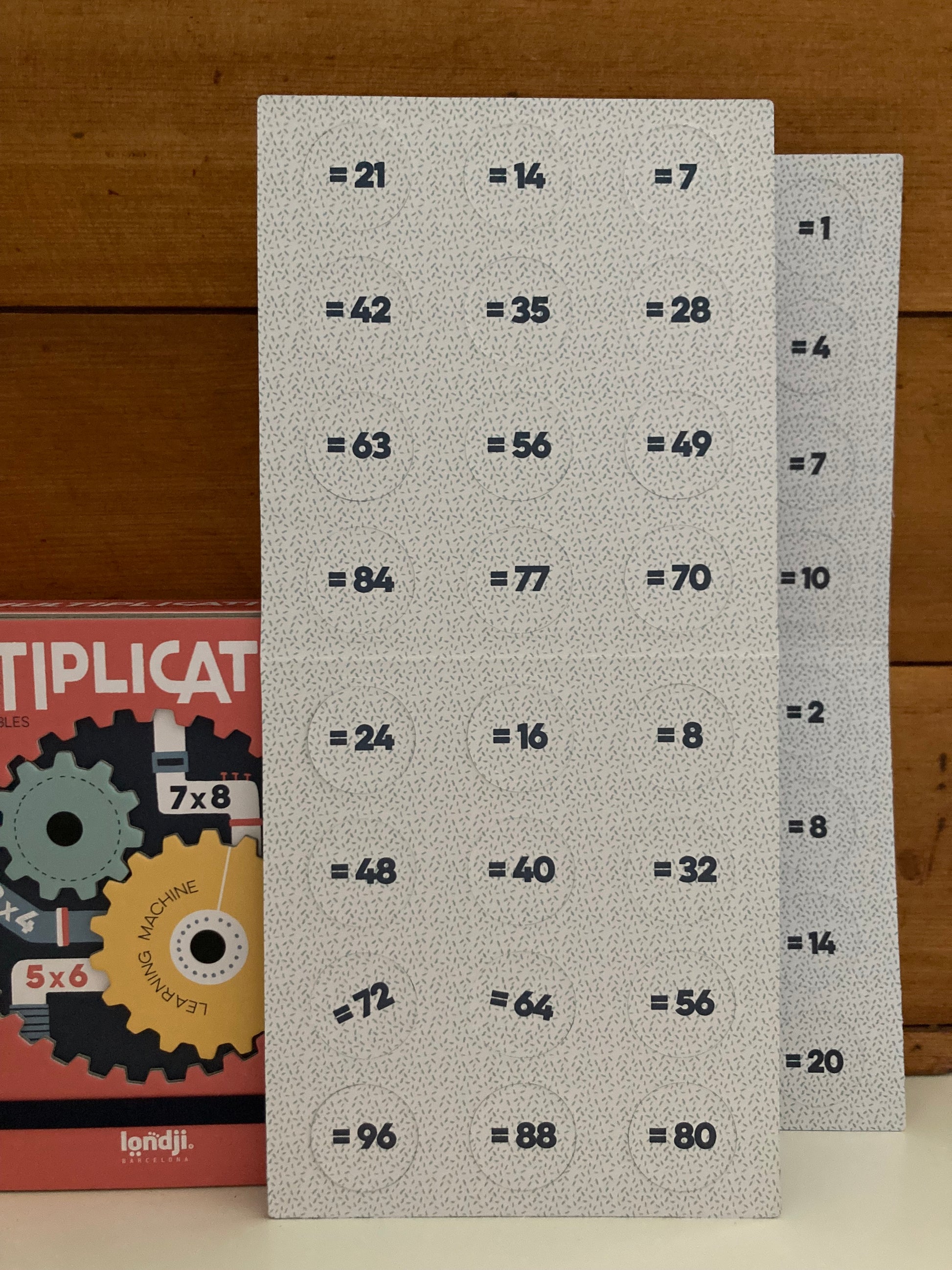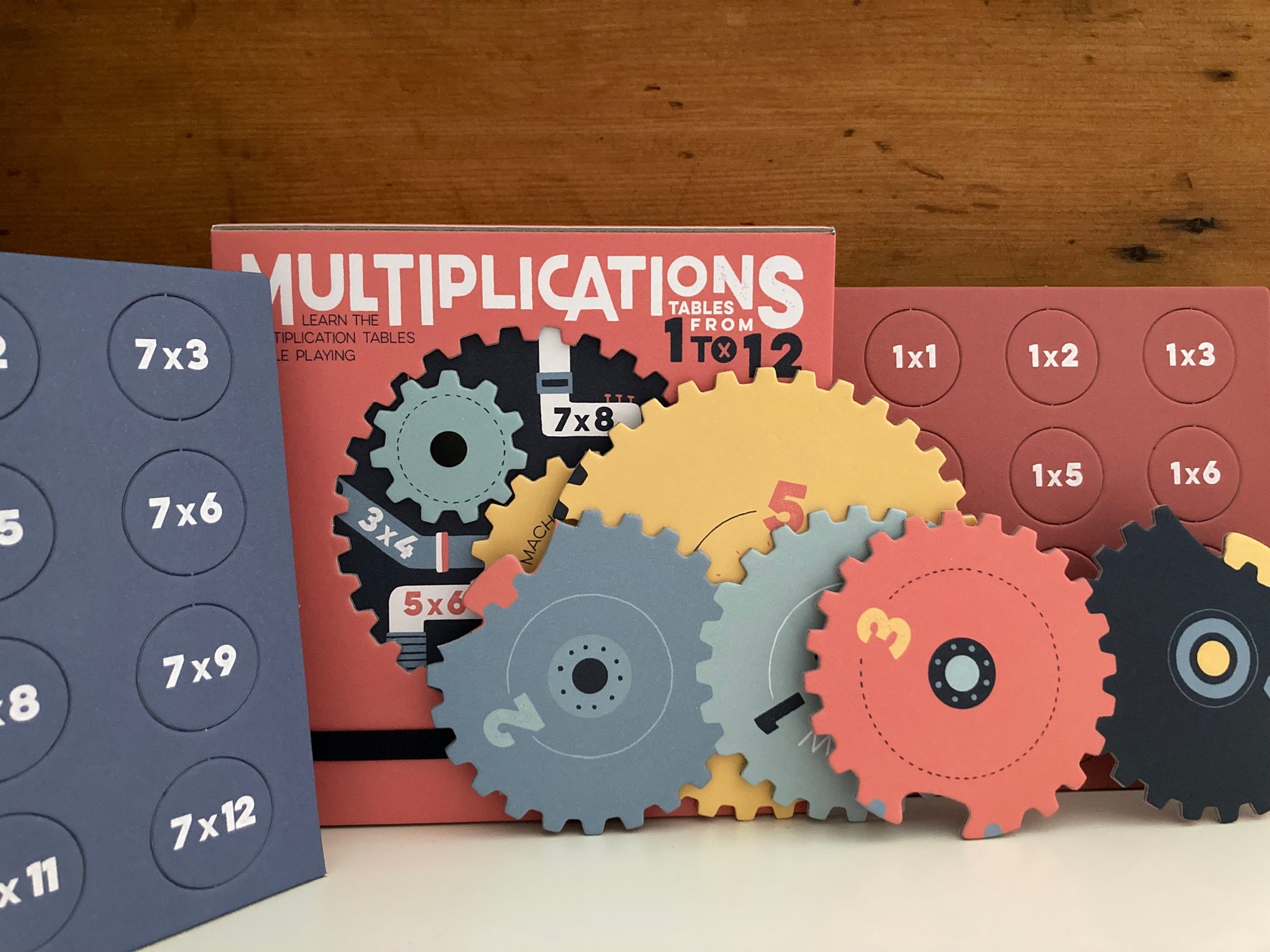 This MULTIPLICATIONS TABLES GAME will be a great help. Once all the disks have been punched out, they can be stored very neatly in the cloth bag. The larger discs act like learning machine parts as they are rotated around each other so children can work out the correct multiplication formula, and answer.