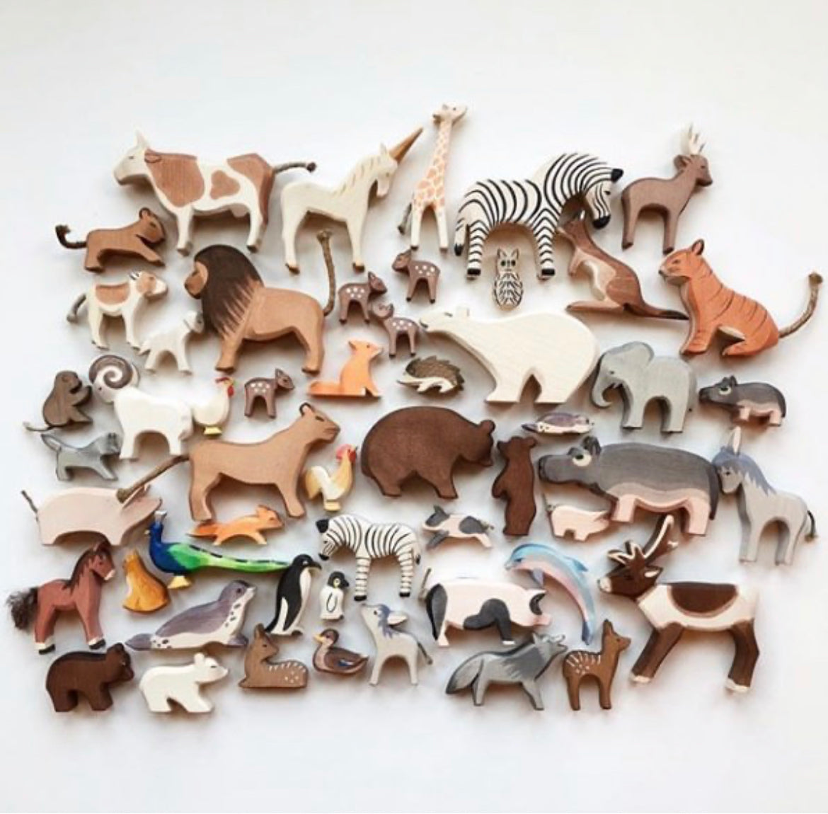 Hand painted WOODEN ANIMALS and WOODEN PEOPLE from Ostheimer in Germany. Unparalleled, quality workmanship. Stand alone. Perfect for imaginative play, dollhouse play, decorative Nature tables, farm, jungle or woodland scenes.