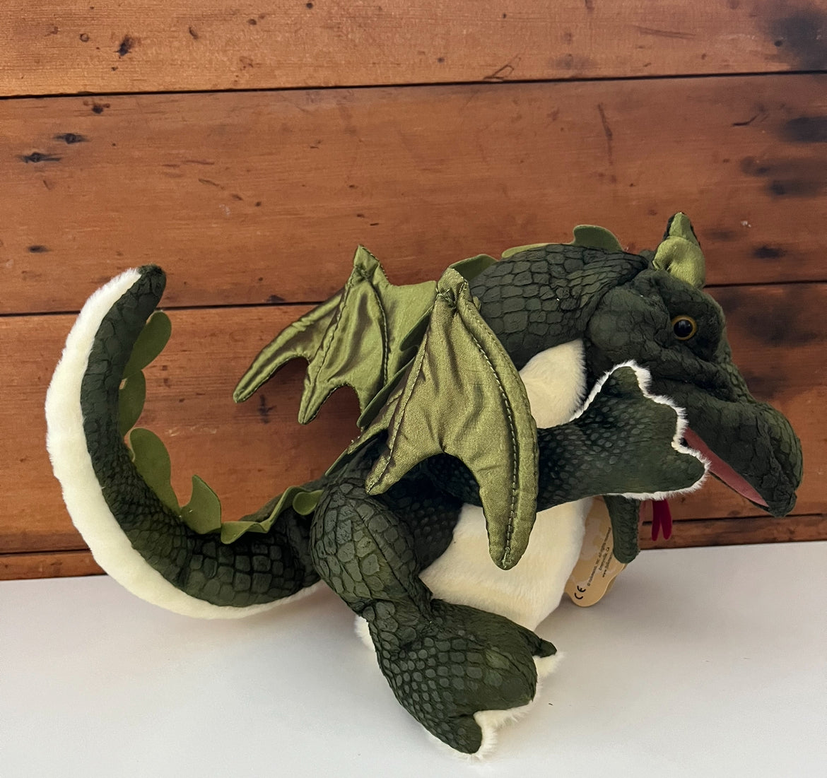 Sitting on his rump, tail curled and looking out for his mother. Cute now, the BABY DRAGON will grow to be a fierce creature! Children can make the arms and mouth move from the underside of the plush belly. Fashioned in scaly textured fabric with satiny wings