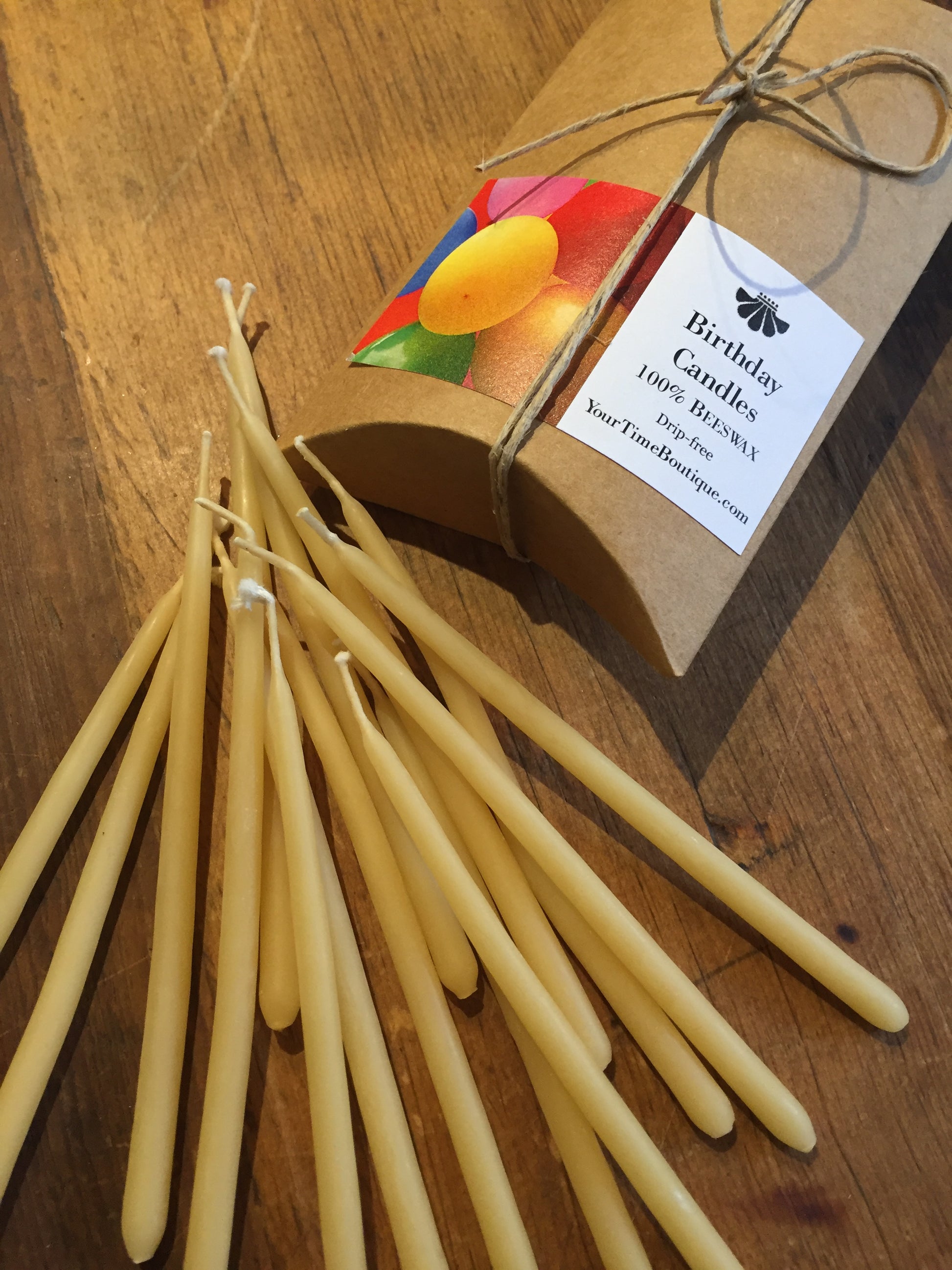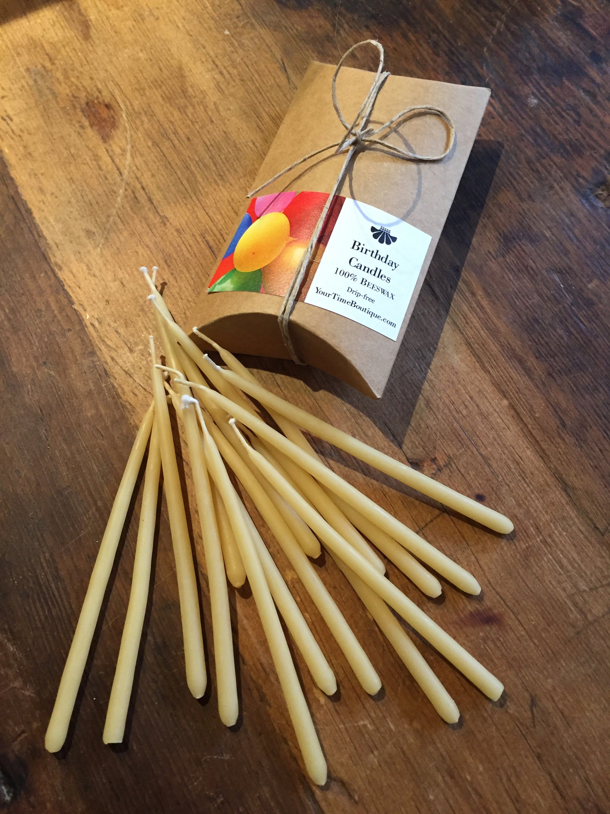Pure Beeswax Birthday Candles! 12 delicate BIRTHDAY BEESWAX CANDLES from Your Time Boutique in Ontario, Canada. They smell like honey, they burn beautifully. Sold in a cardboard sleeve.
