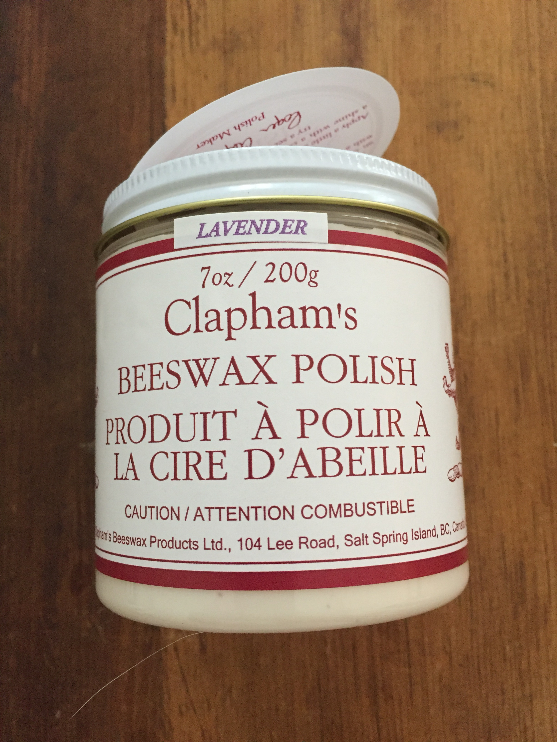 Clapham's BEESWAX FURNITURE POLISH does the job! Your wood furniture will appreciate the attention, and thank you! This is a hard working product for antiques and fine furniture.