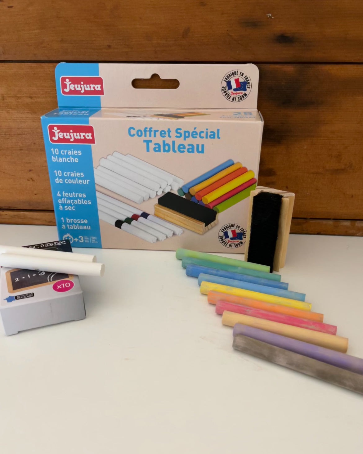 BLACKBOARD SET includes: 10 white chalk pieces, 10 coloured chalk pieces, 4 dry-board erase markers, 1 child-sized chalkboard wooden eraser. Cardboard box measures 17x15x4 cm (7x6x1,5 inches).