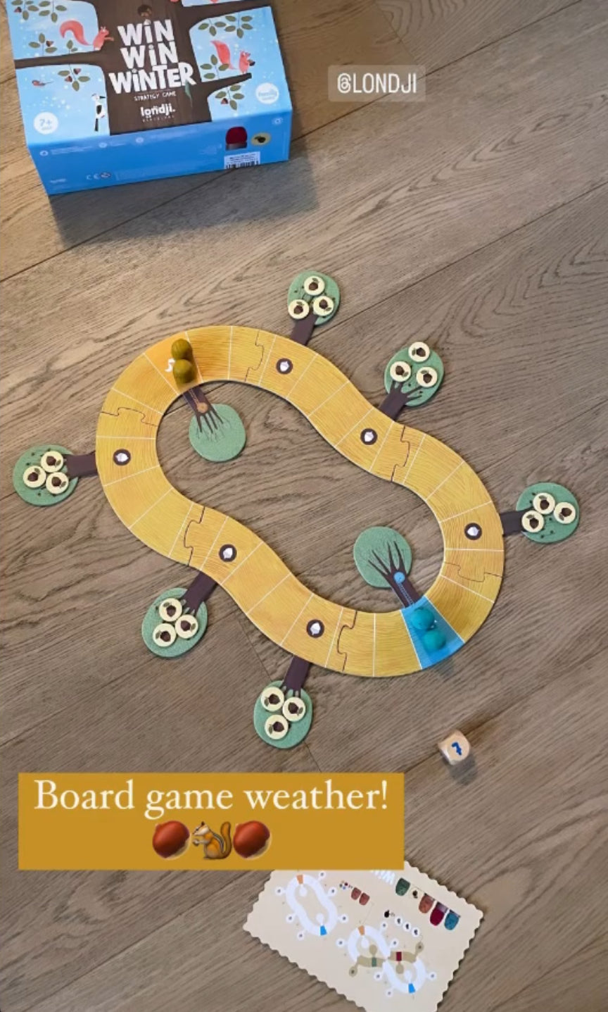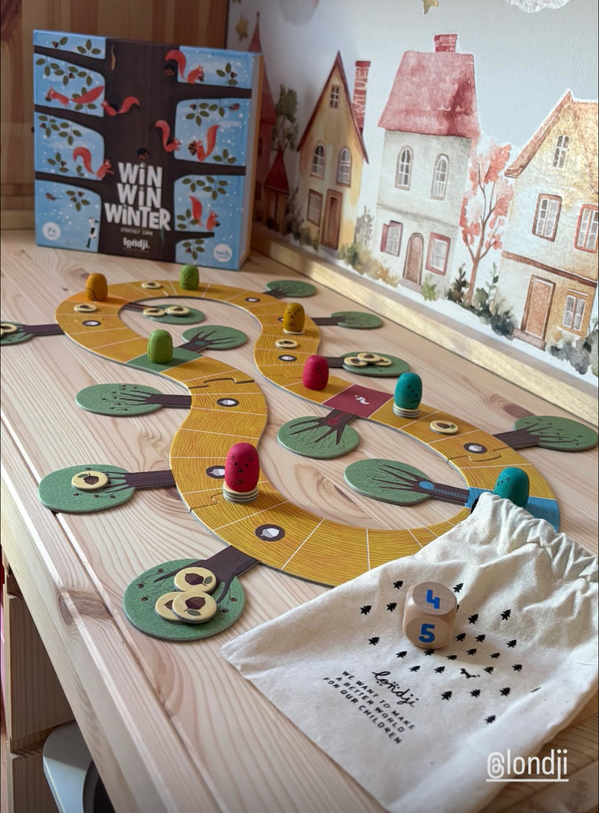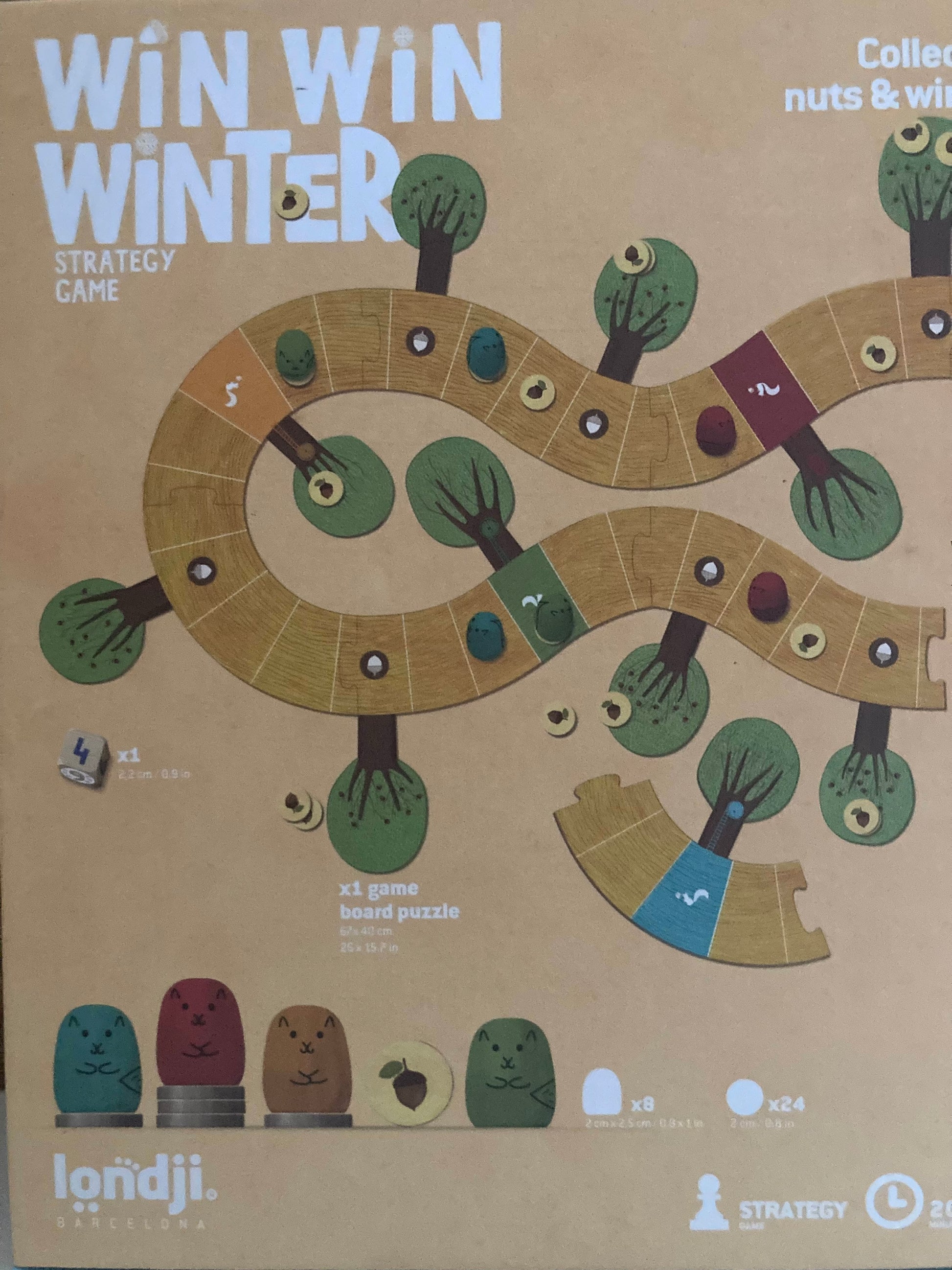 WIN WIN WINTER has the coolest board set-up...a weaving path, through trees covered with nuts... with 8 of the cutest, little moving pieces...24 acorn nuts to collect... a large wooden die... and a lovely cloth bag to keep your game pieces in when the fun is done!