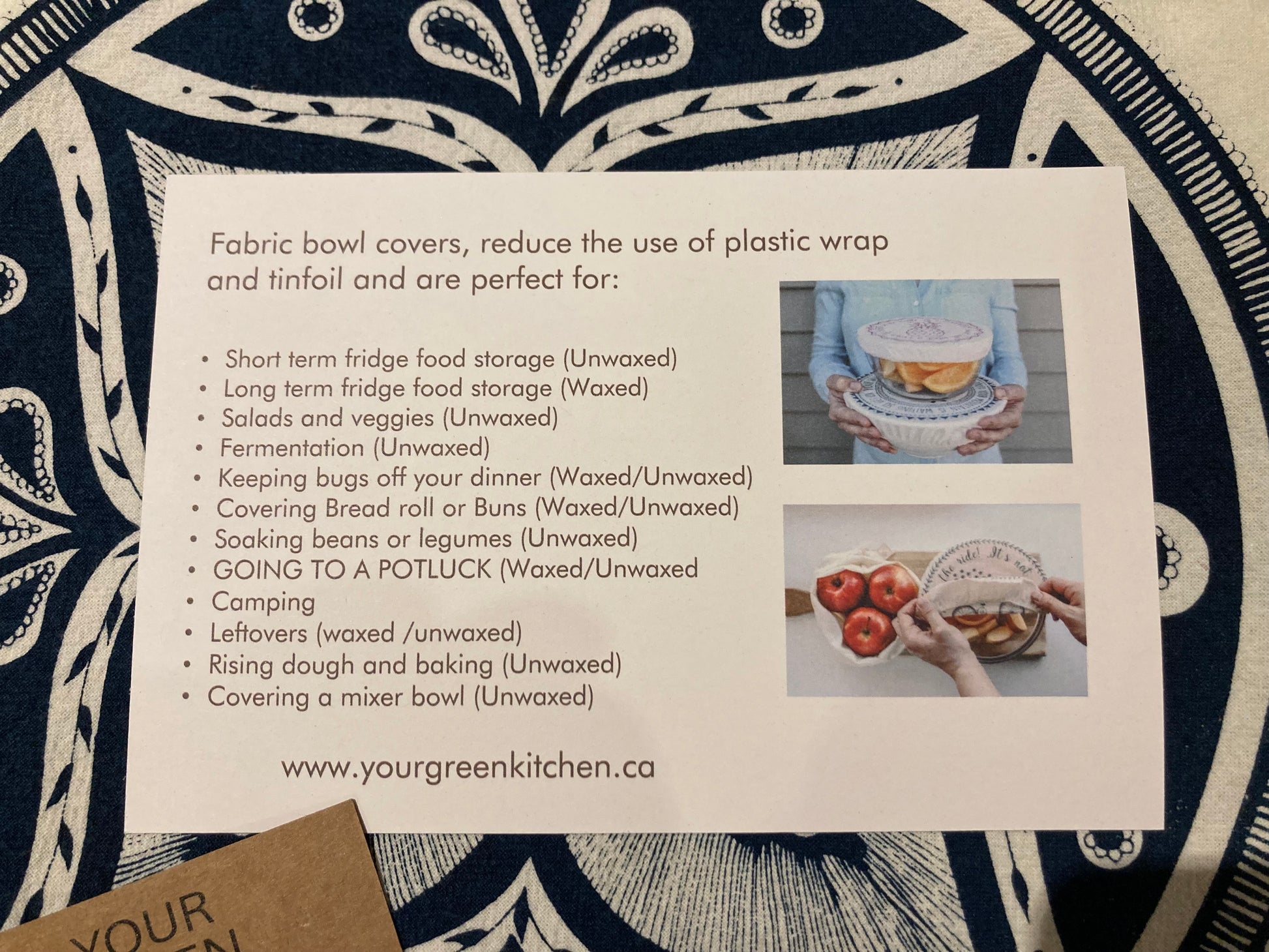 From Your Green Kitchen in beautiful British Columbia. REUSABLE CLOTH BOWL COVERS are more than beautiful, they eliminate single-use plastic wrap! Made from 100% Organic Cotton, and printed with designs using plant-based ink.