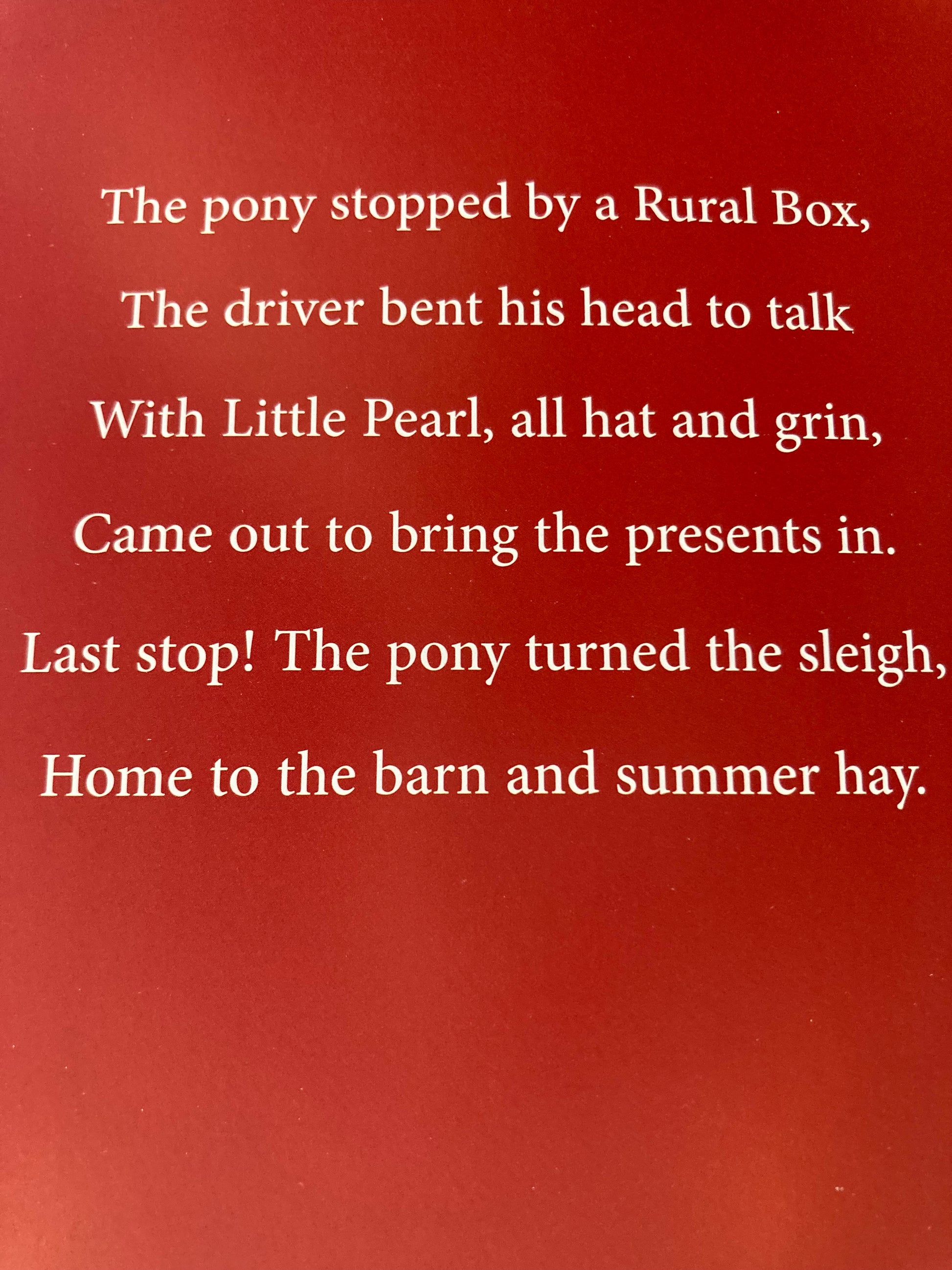 Fifteen paintings, one on each page, illustrate the lyrical poem of a baby's first Christmas morning and the excitement of following the journey of the presents arriving by the rural mail.