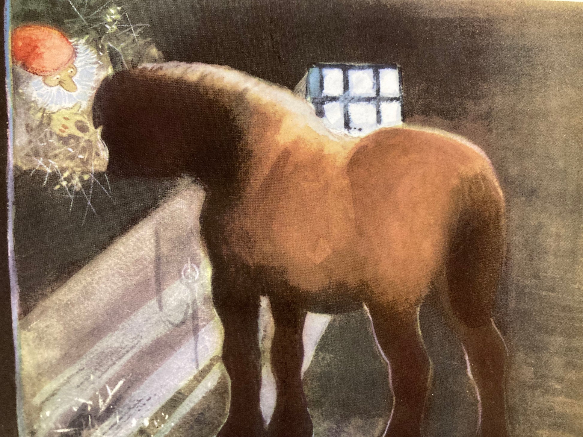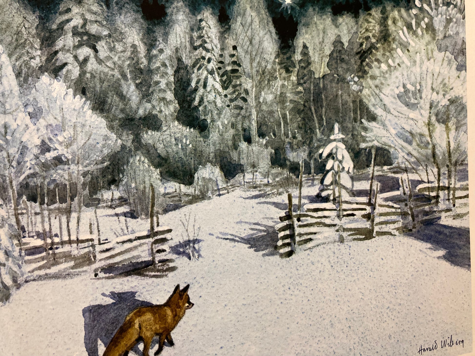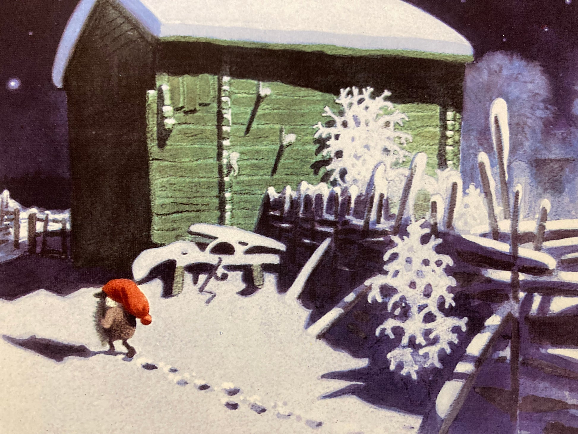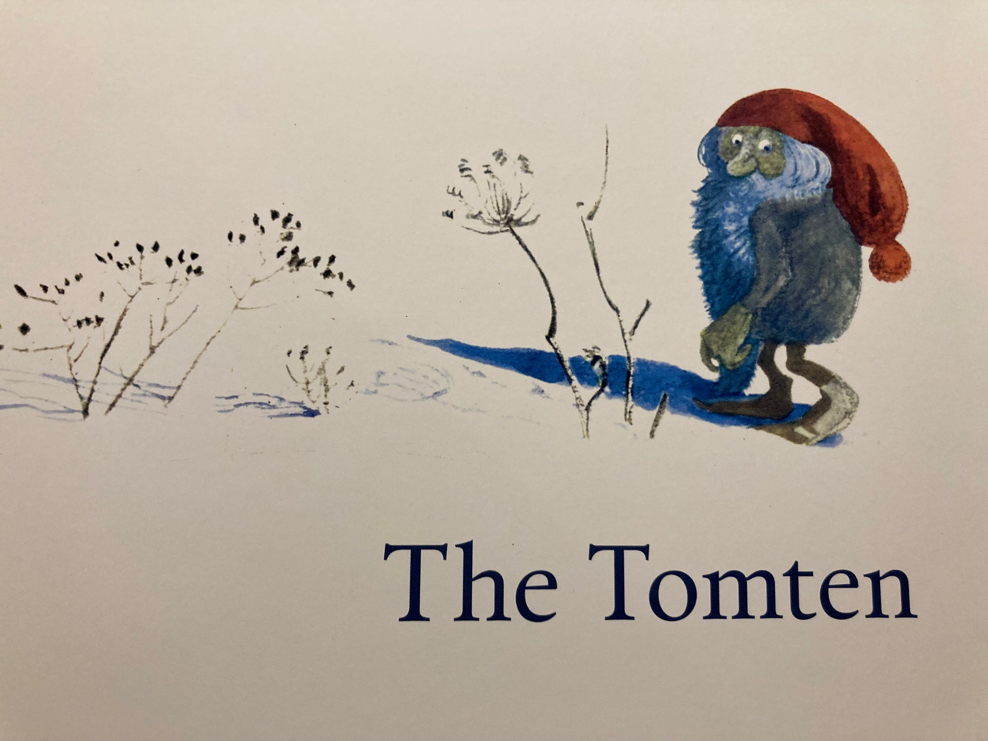 "On small silent feet the old Tomten tiptoes through the snow, keeping watch over the farm on this chilly winter night."