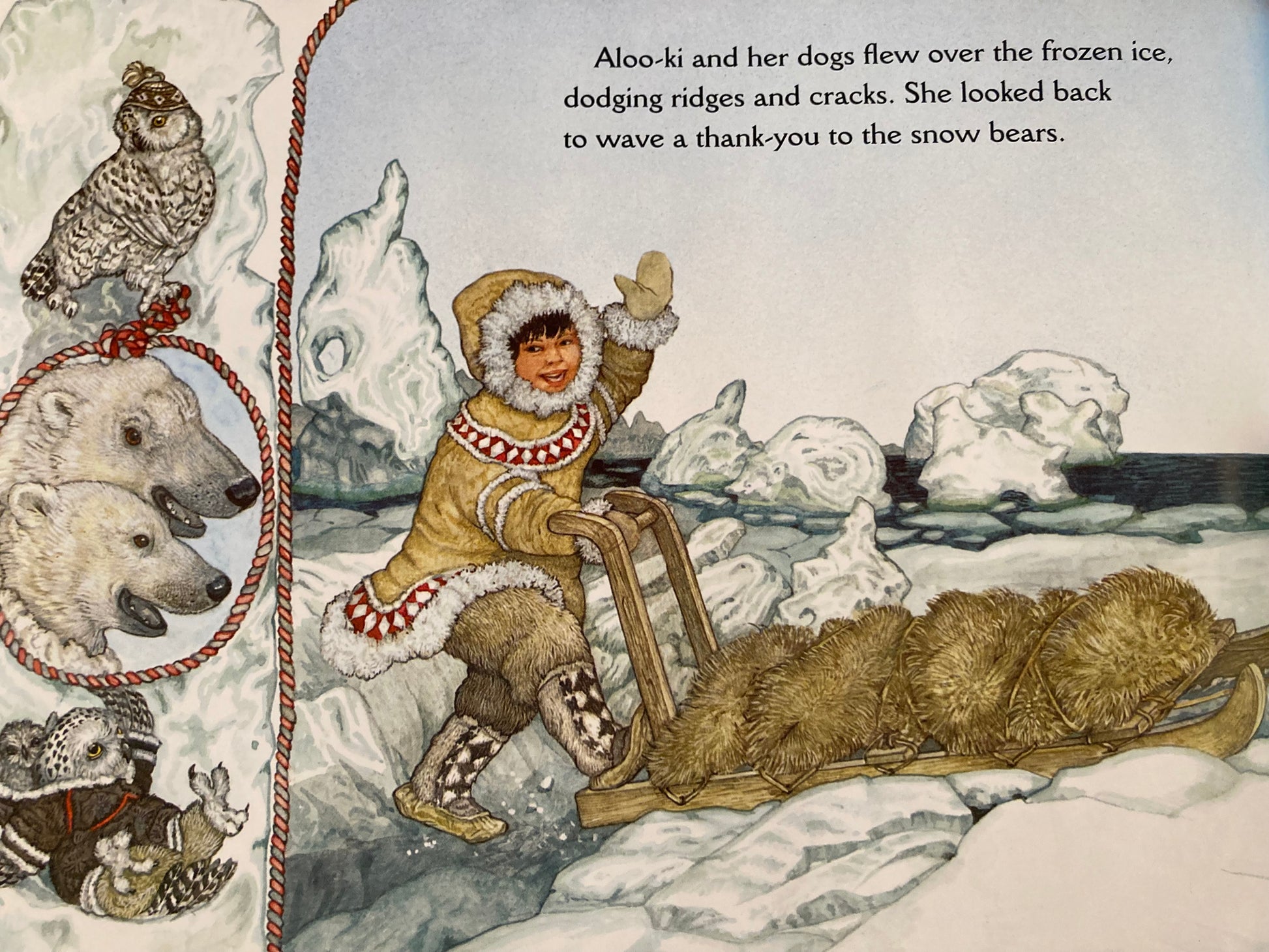 THE THREE SNOW BEARS is the result! With her trademark beautifully detailed borders on every page, and her colourful imagination of animal life, she has brought Goldilocks and the Three Bears to life in Canada's Arctic. Children will love to meet Aloo-ki and laugh as she tries out the bowls of porridge, the beautiful Inuit winter boots, and falls asleep in a pile of warm furs inside the Snow Bears' Igloo home.