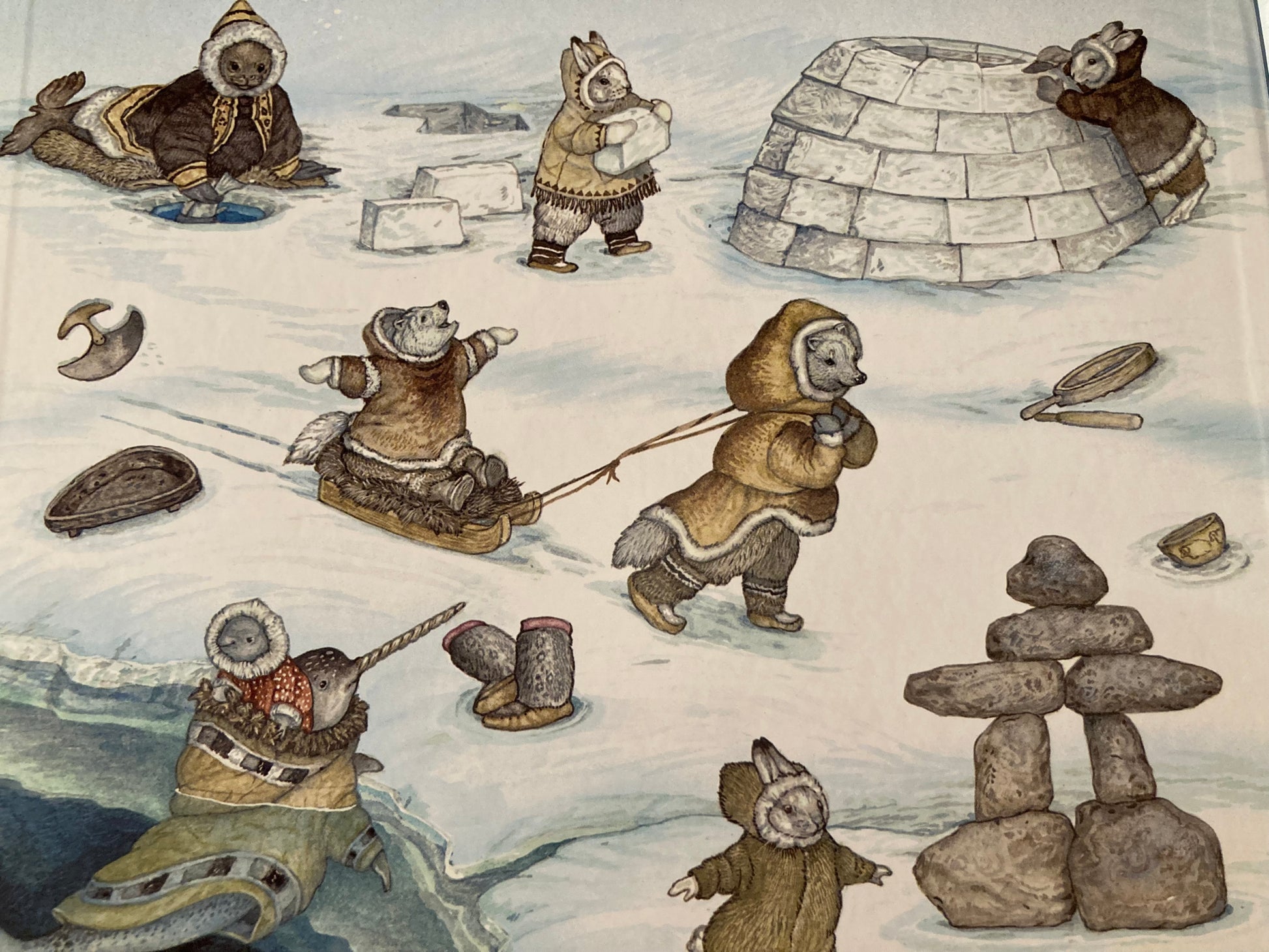 Beloved author/illustrator Jan Brett travelled to Iquluit, capital of Nunavut Territory, in northern Canada, to meet the Inuit people. She has created a re-telling of Goldilocks and the Three Bears based on images she saw in the town of Pangnirtung, of arctic animals in Inuit clothes. She slept in igloos, and travelled by dog sled, and was inspired by all she saw and the friendly welcoming people she met.