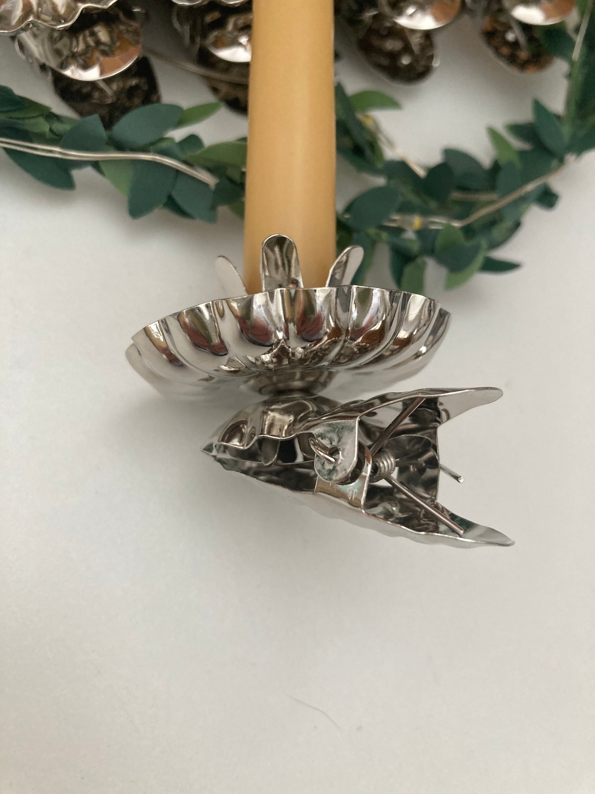 The christmas tree candle holders are made of metal and will fit small christmas tree candles made for them perfectly.