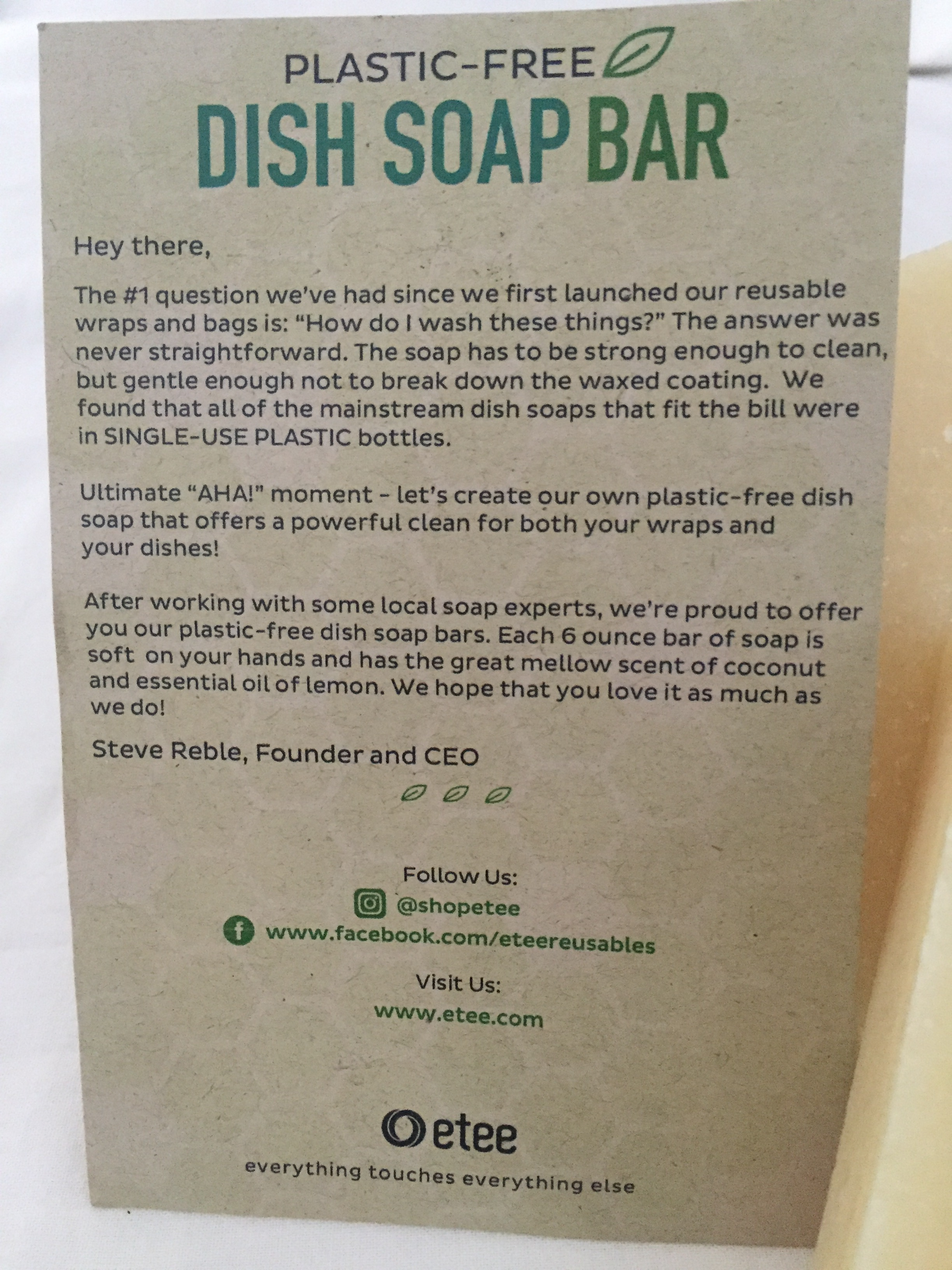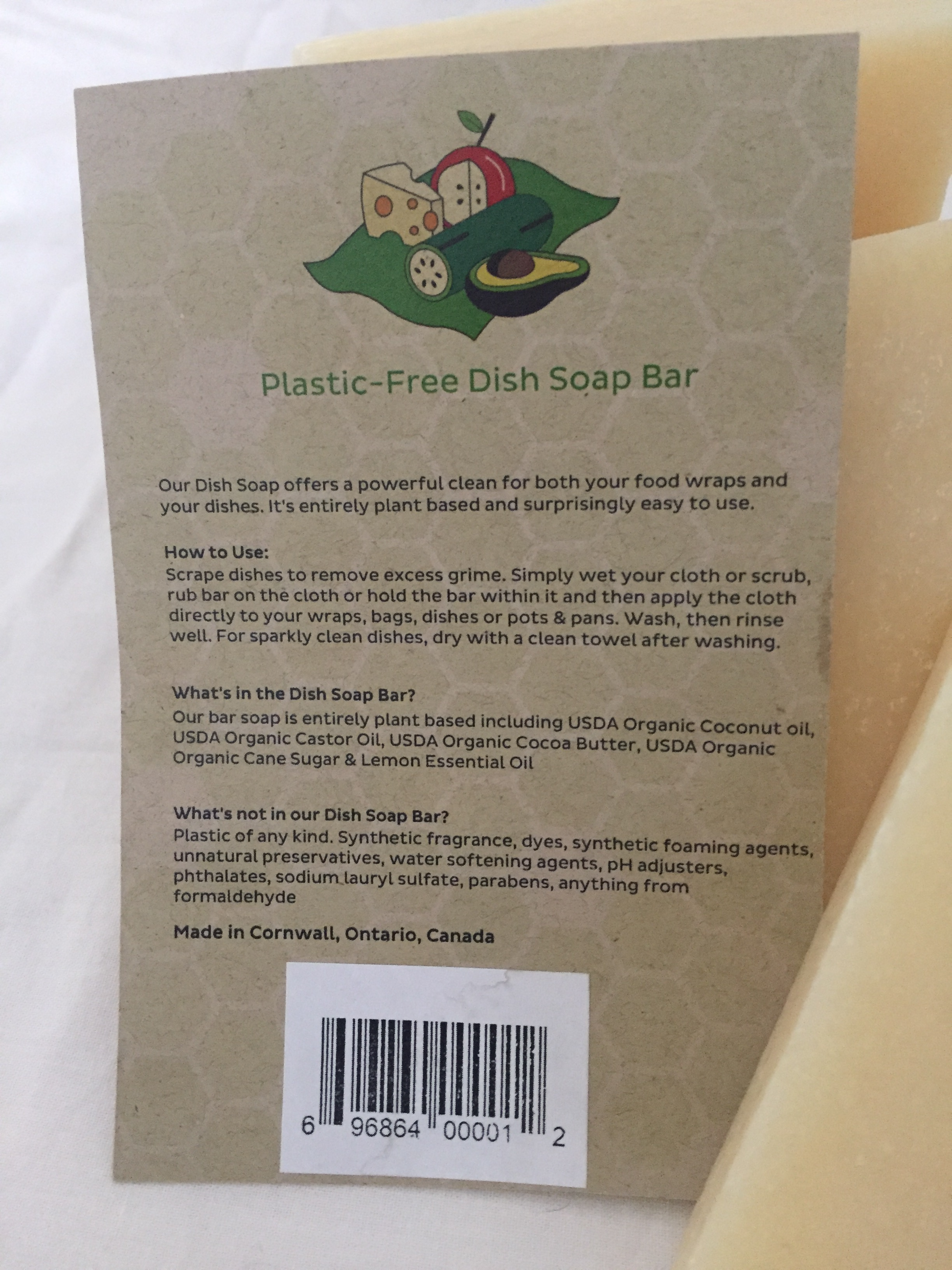 New from Toronto company, ETEE, a plastic-free KITCHEN DISH SOAP BAR! Each 6 ounce bar of soap is soft on your hands and has a lovely light scent from Essential Oil of Lemon. But, most importantly, it works with a powerful clean. Safe for beeswax based food wraps, and tough on dirty dishes. Completely plastic-free.