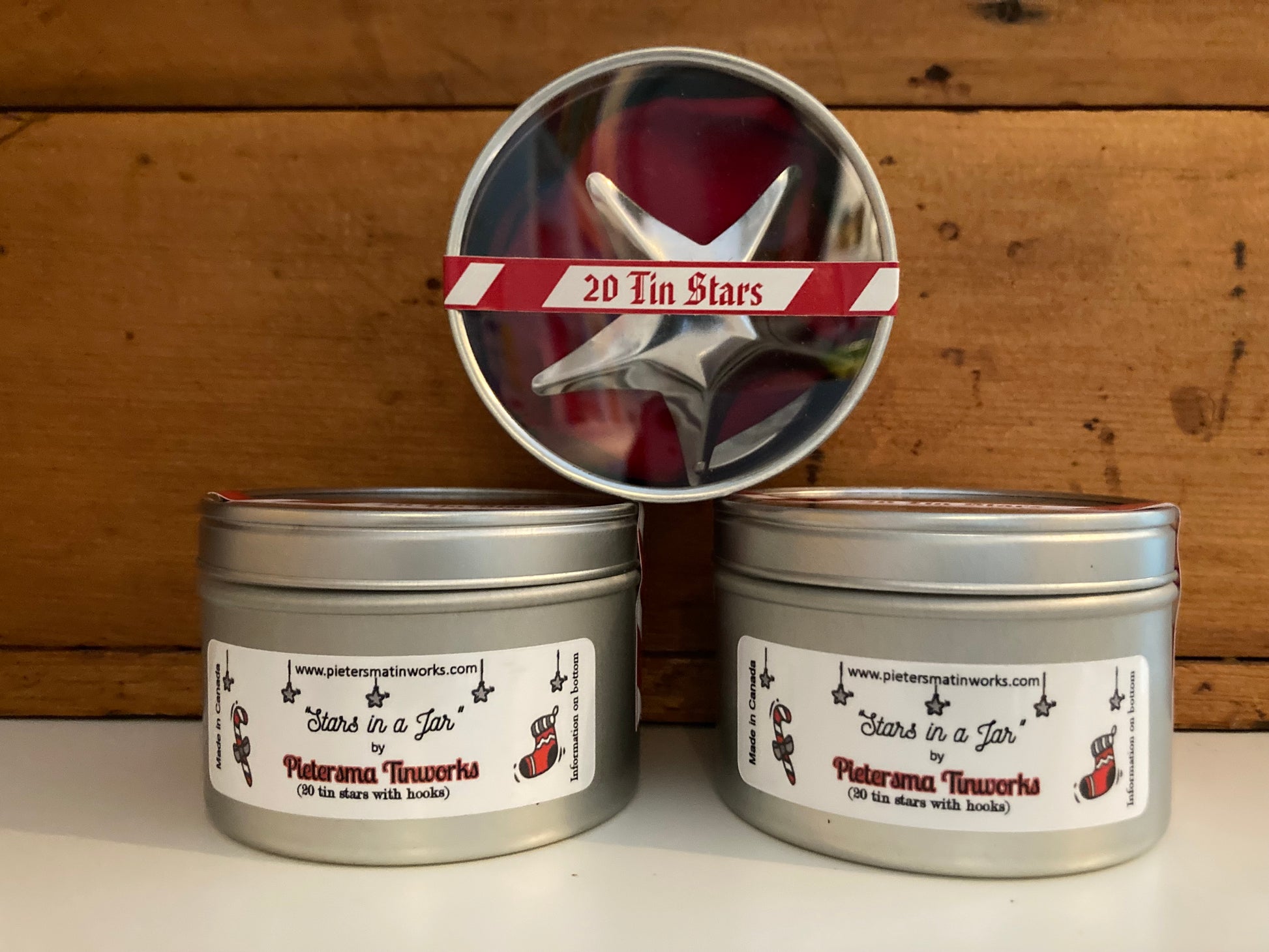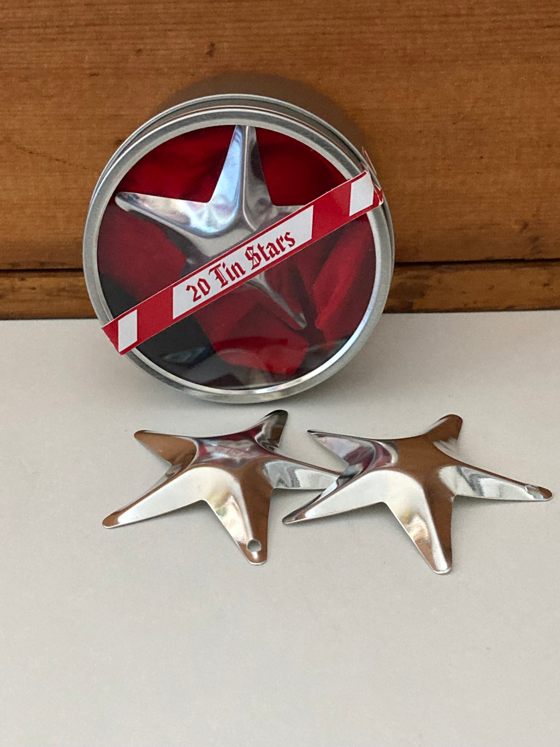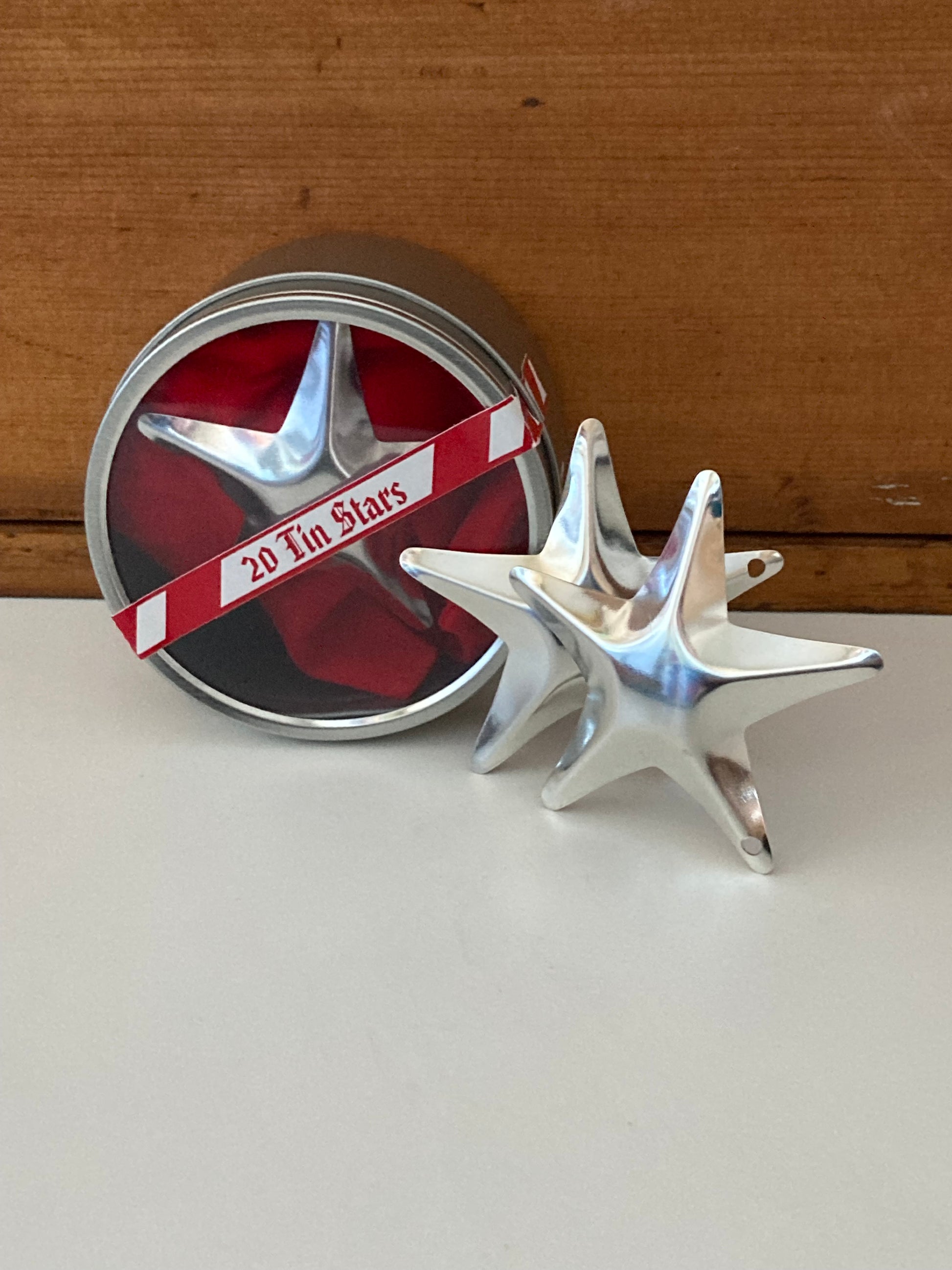 Here are their 20 CHRISTMAS TREE TIN STARS, including 20 hooks for hanging, packaged in a handy tin, to store your Tin Stars from year to year. All packaged up with festive red accents. Children will love helping to hang the stars, and everyone will appreciate the special effect of the Christmas lights reflecting off of the TIN STARS!