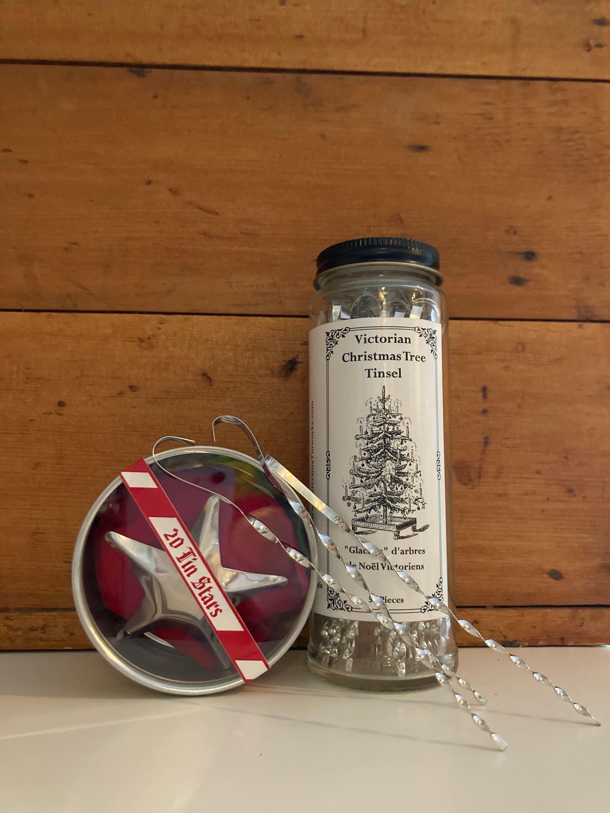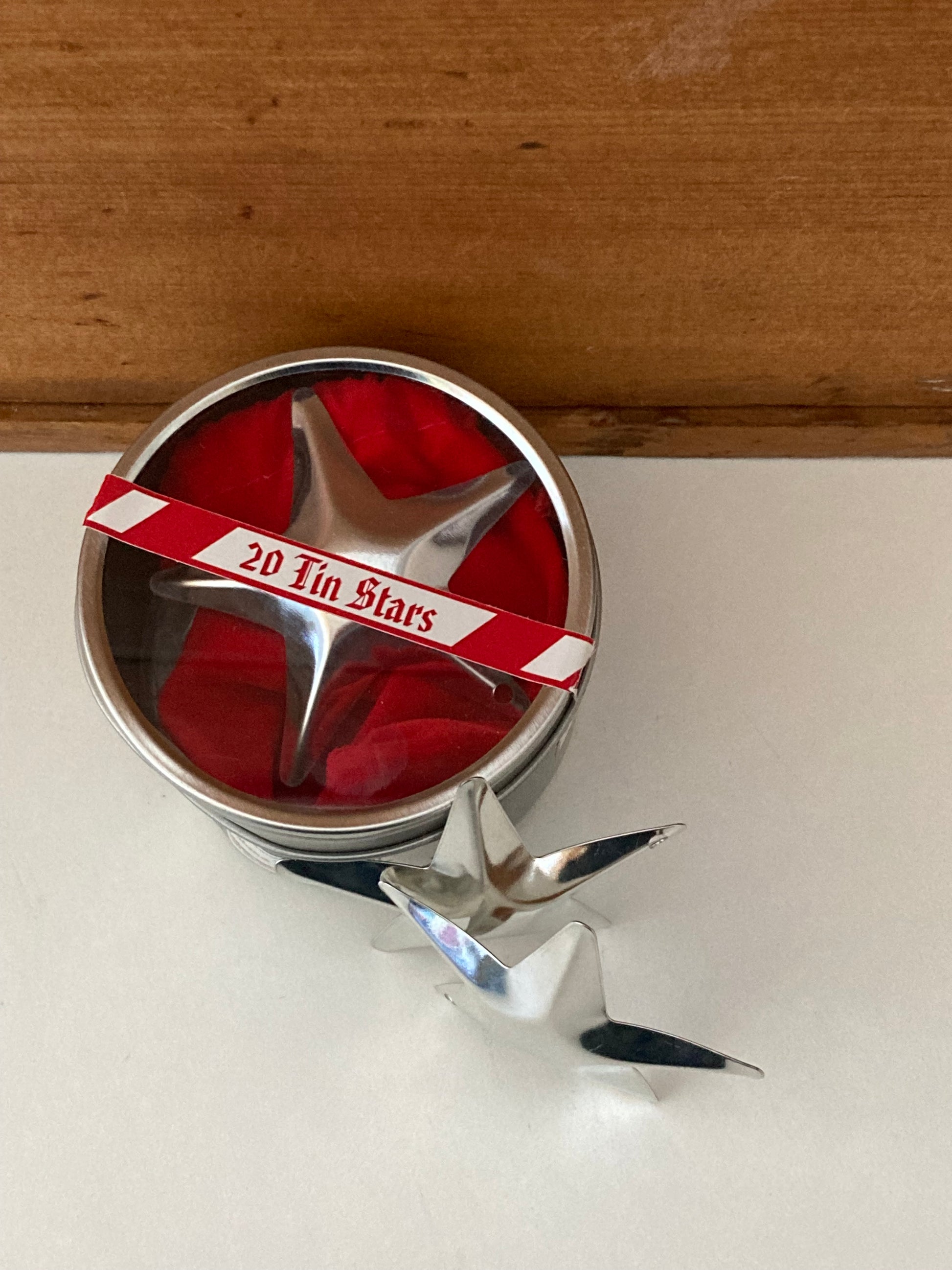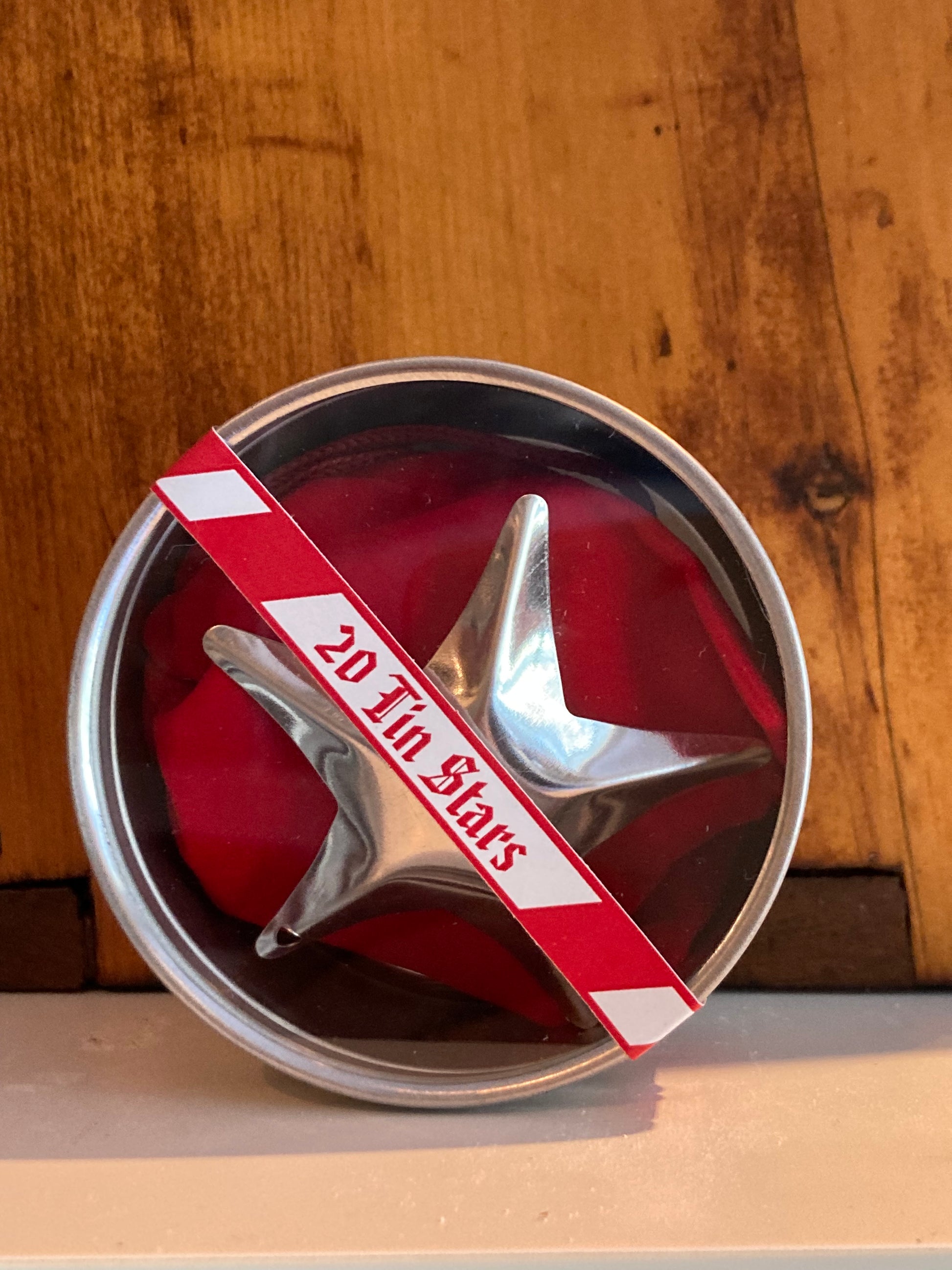 Here are their 20 CHRISTMAS TREE TIN STARS, including 20 hooks for hanging, packaged in a handy tin, to store your Tin Stars from year to year. All packaged up with festive red accents. Children will love helping to hang the stars, and everyone will appreciate the special effect of the Christmas lights reflecting off of the TIN STARS!