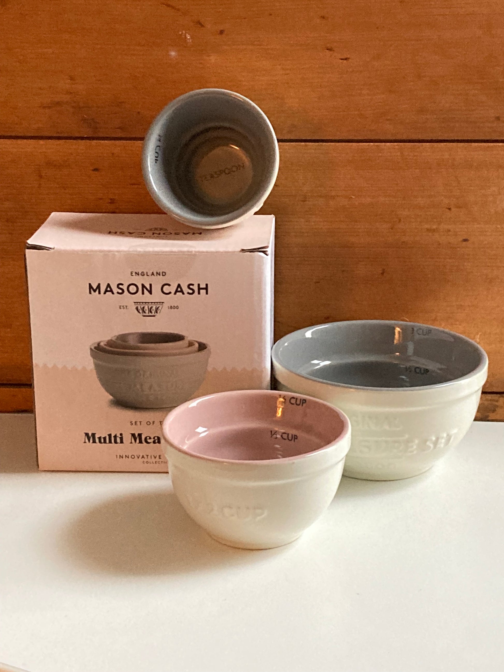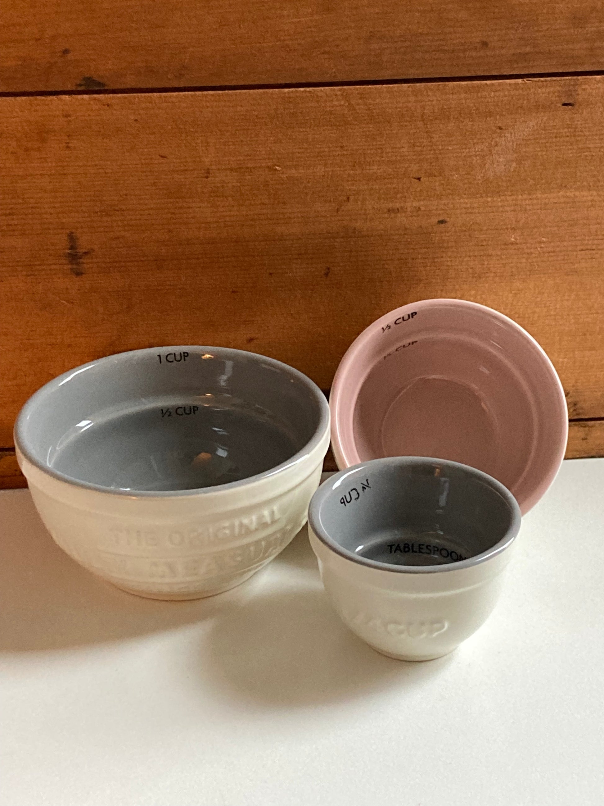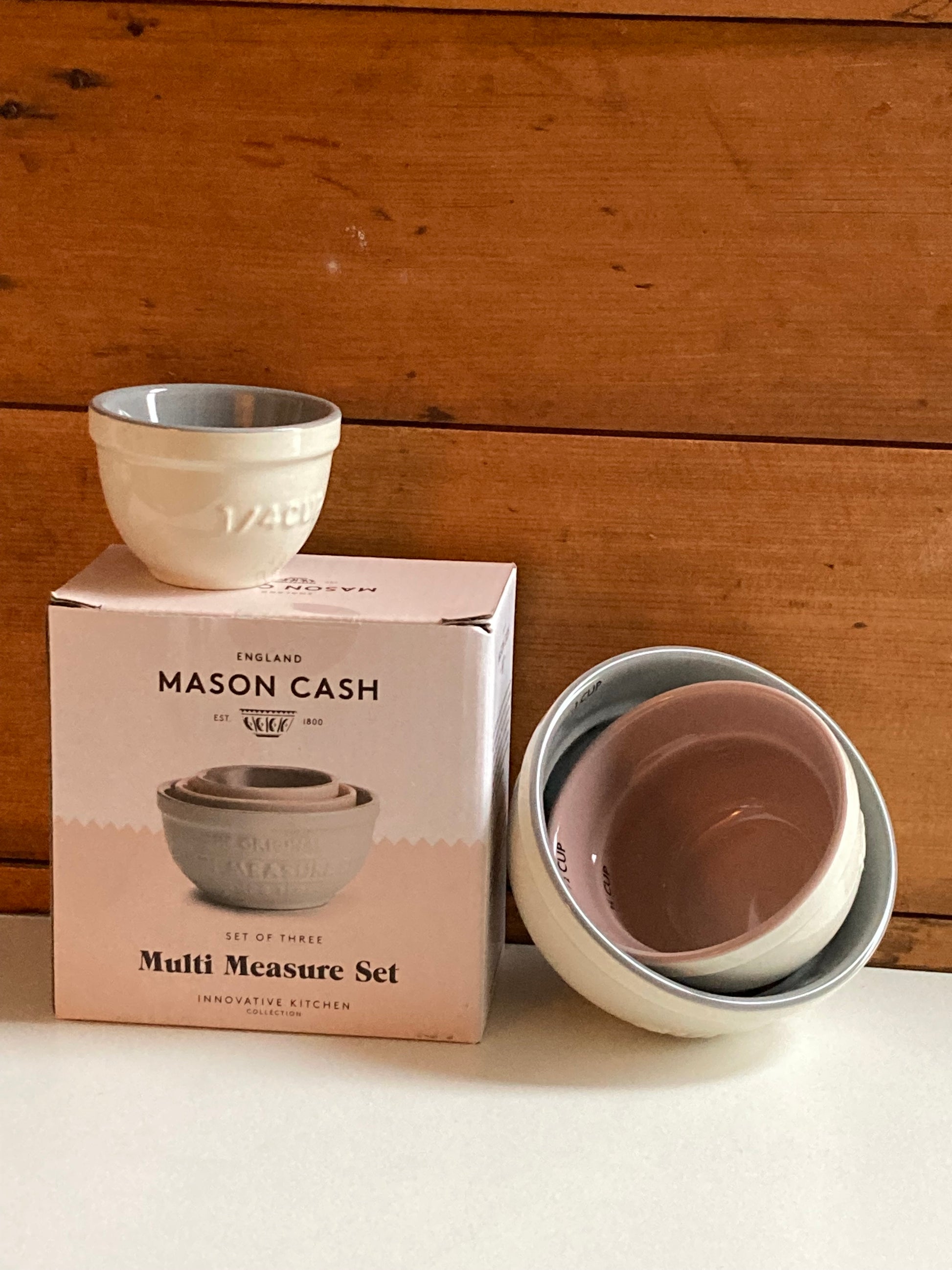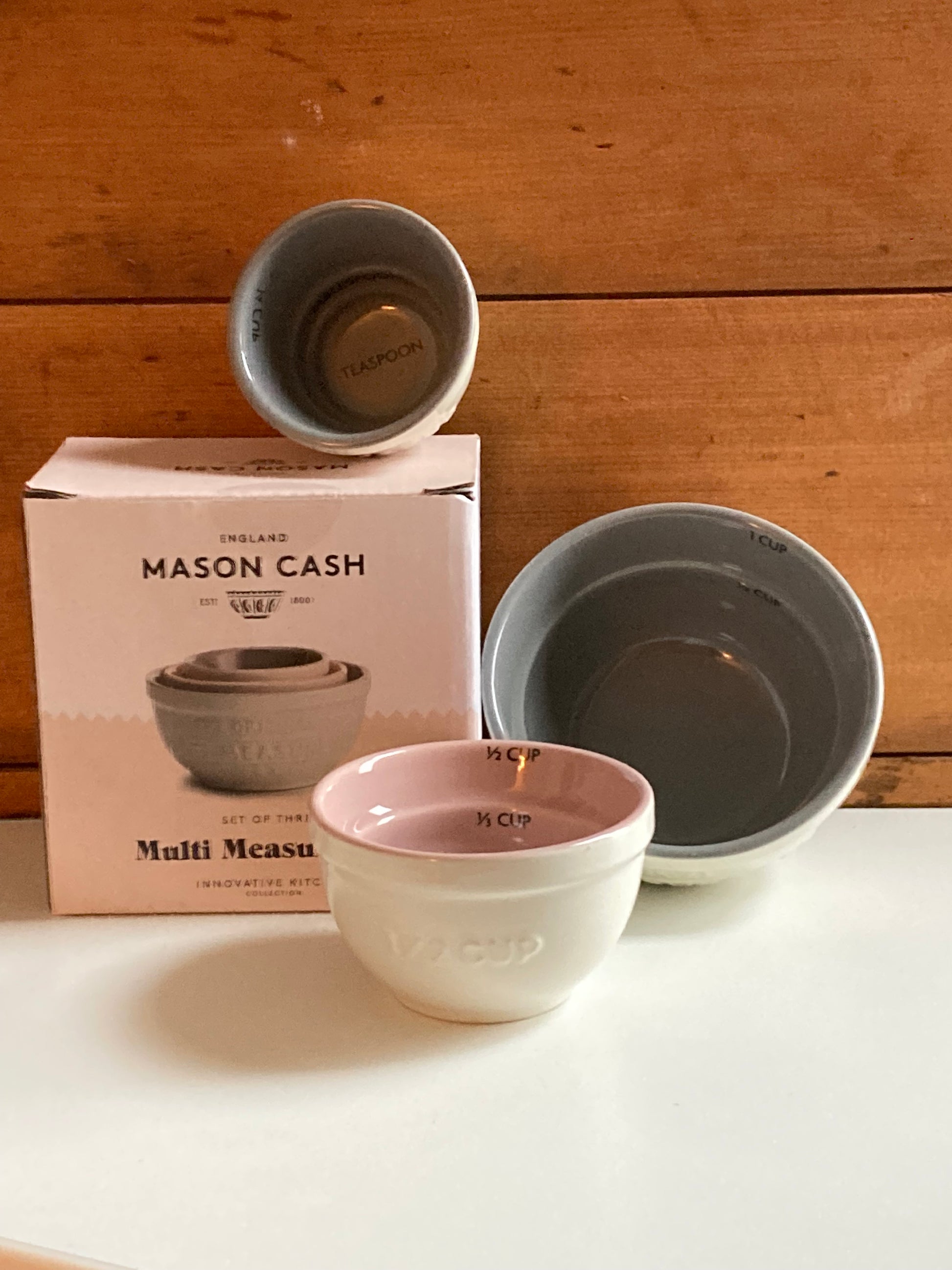 Since 1800, Mason Cash has made kitchenware to last. Delivering smart, eco-friendly solutions for day-to-day kitchen needs. This is their beautiful set of THREE CERAMIC MEASURING BOWL CUPS.