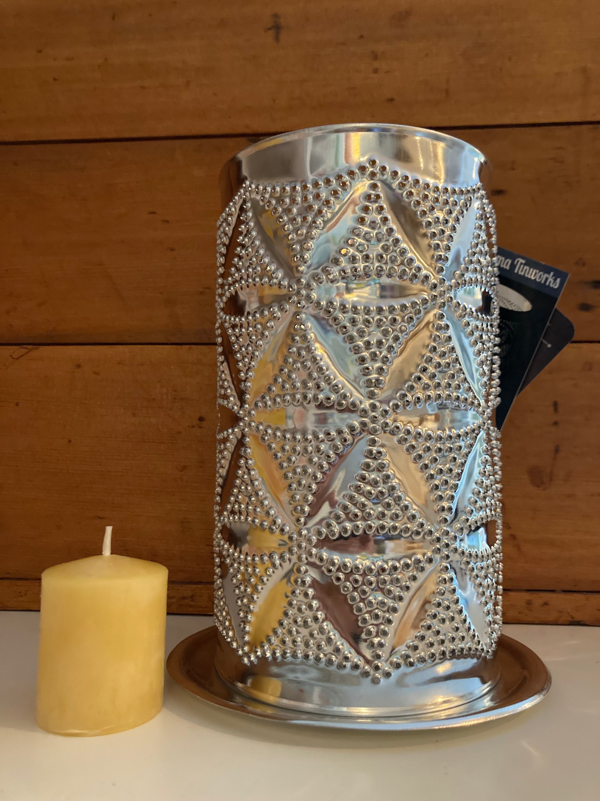 These pierced-tin LARGE CANDLE SHADES are perfect for inside your home and will beautifully light a special corner with their intricate pierced-tin designs. Large enough to use outside as well. Please, dry if tin gets wet to prevent rust. As each is hand-crafted, there will be some variation. Truly a special Gift.