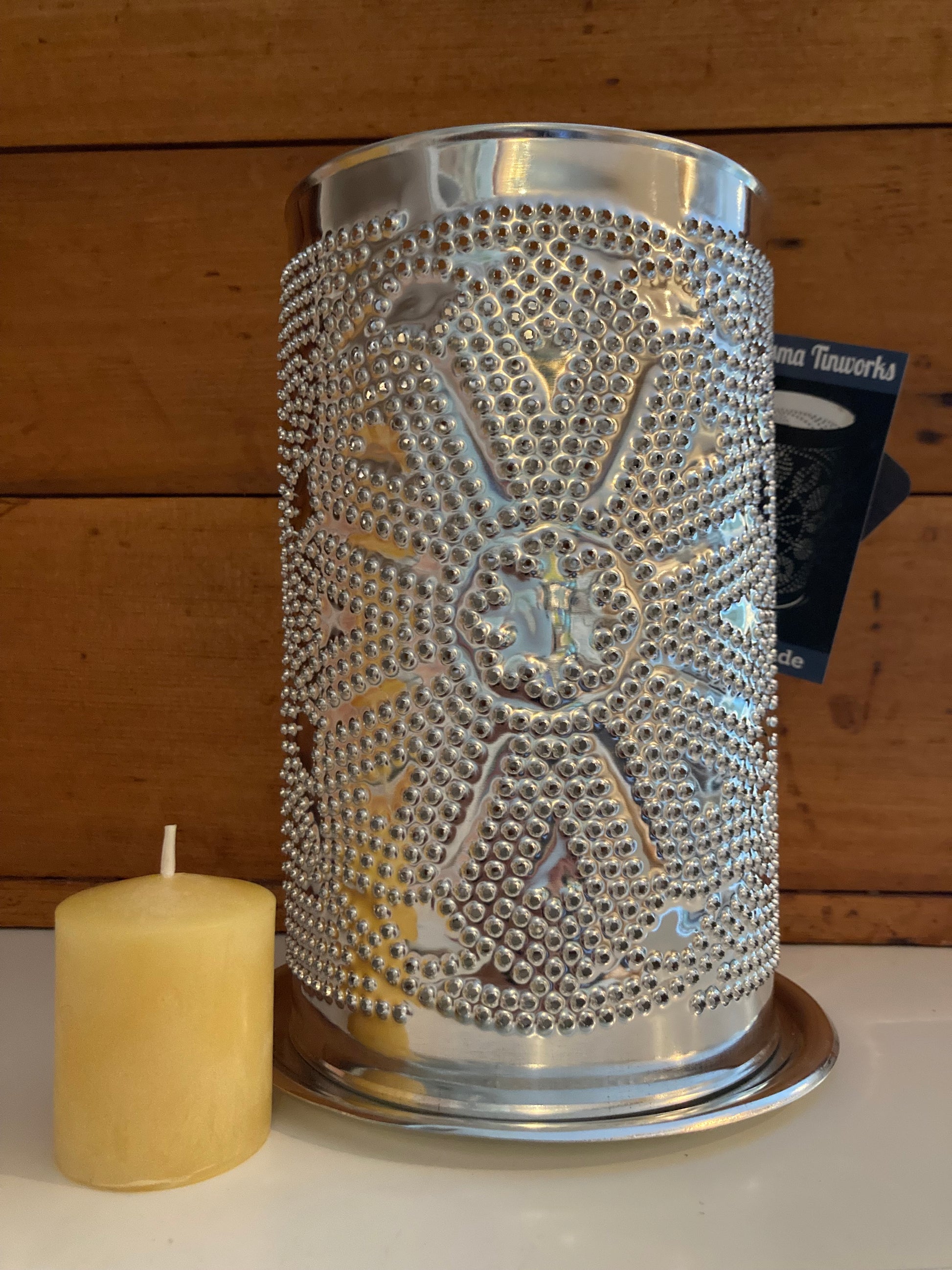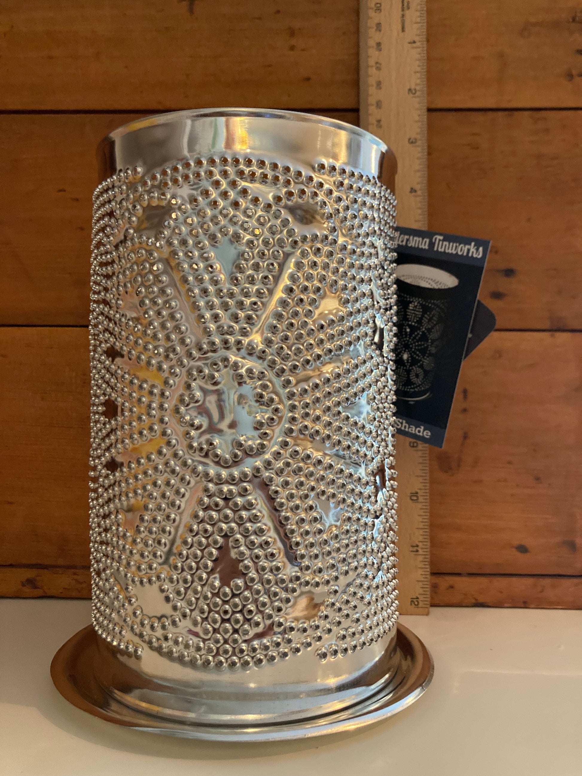 These pierced-tin LARGE CANDLE SHADES are perfect for inside your home and will beautifully light a special corner with their intricate pierced-tin designs. Large enough to use outside as well. Please, dry if tin gets wet to prevent rust. As each is hand-crafted, there will be some variation. Truly a special Gift.