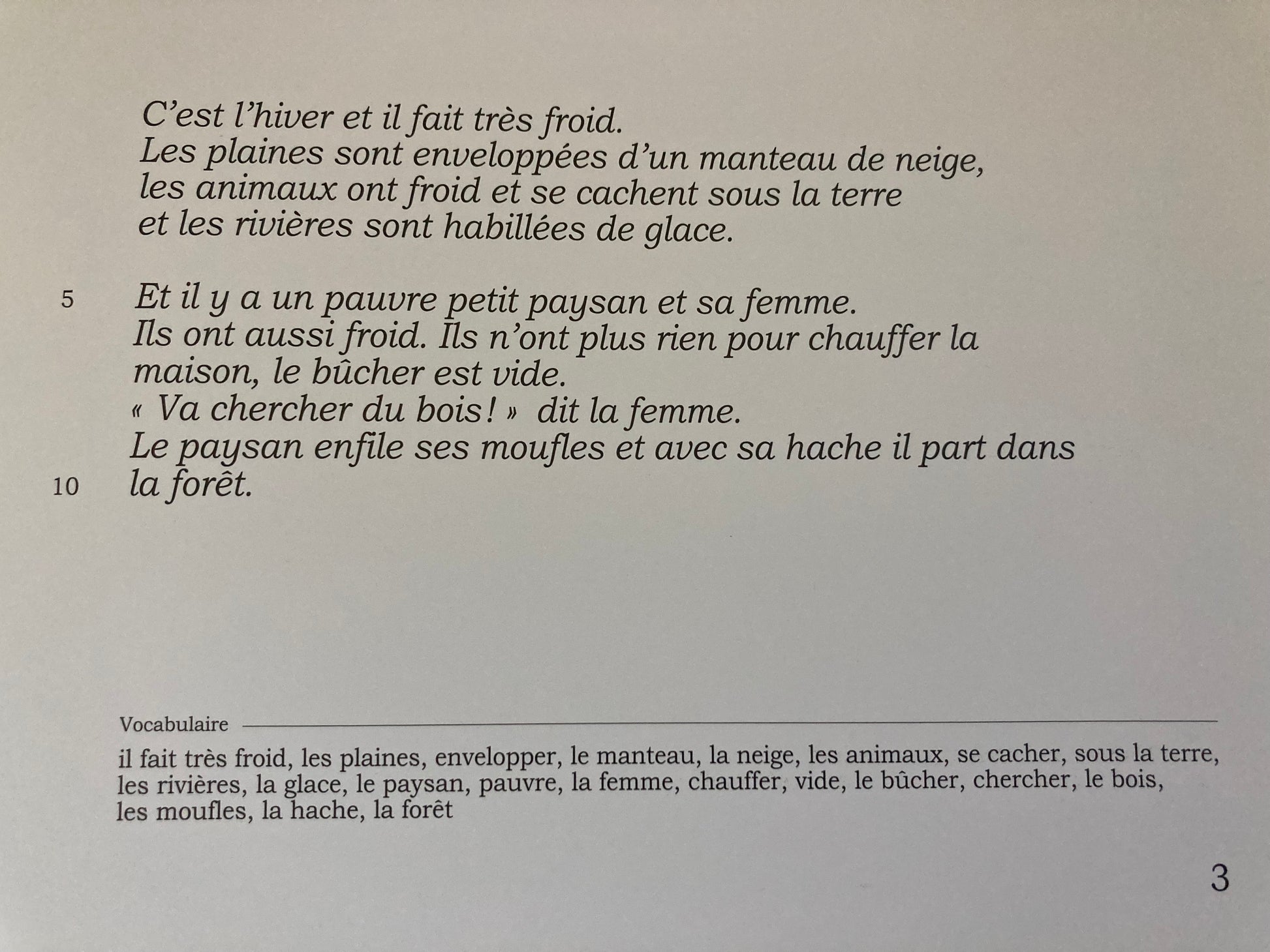 This is the funny, little children's story of THE MITTEN, written completely in French by Andrea Schroder.