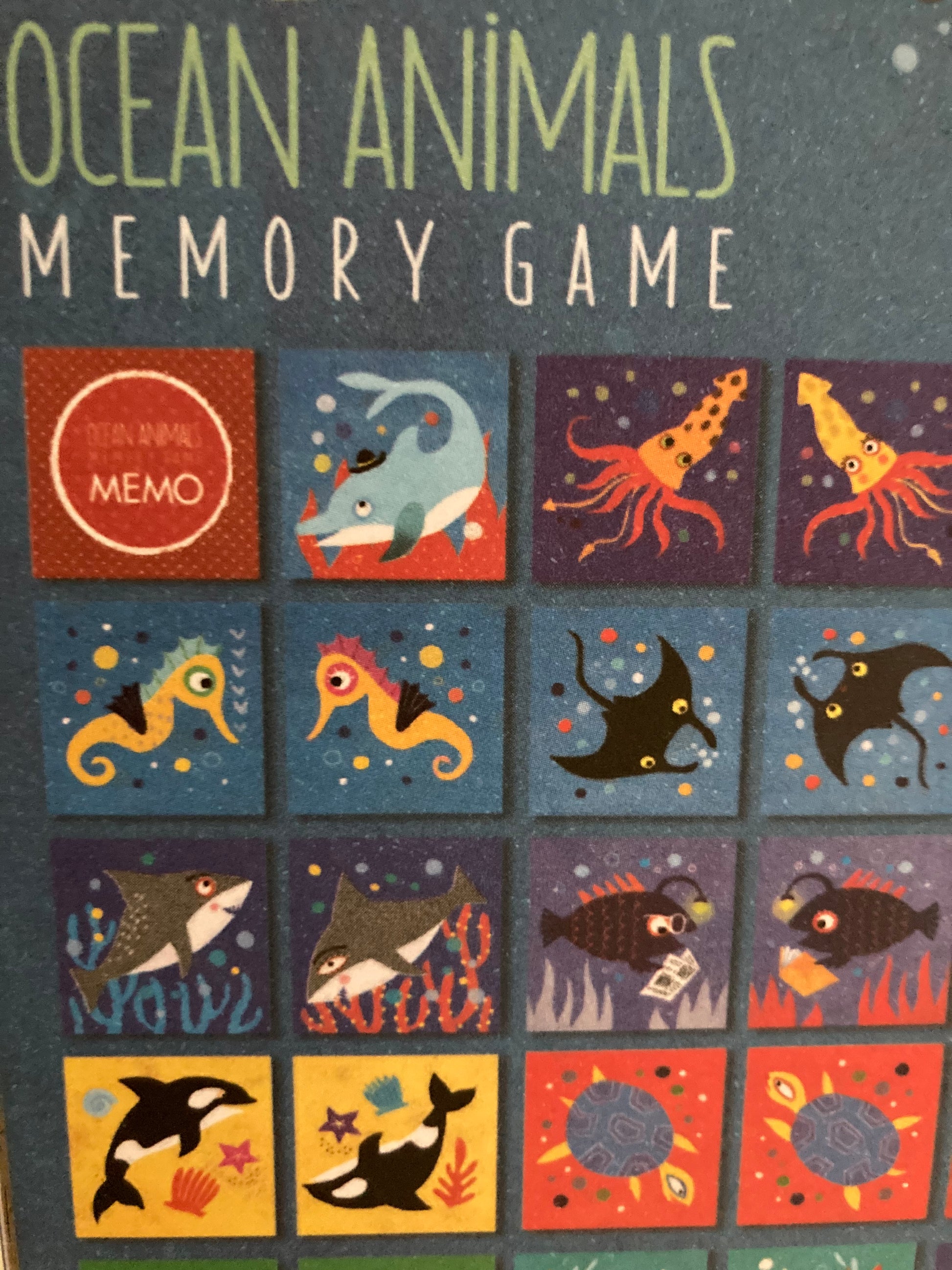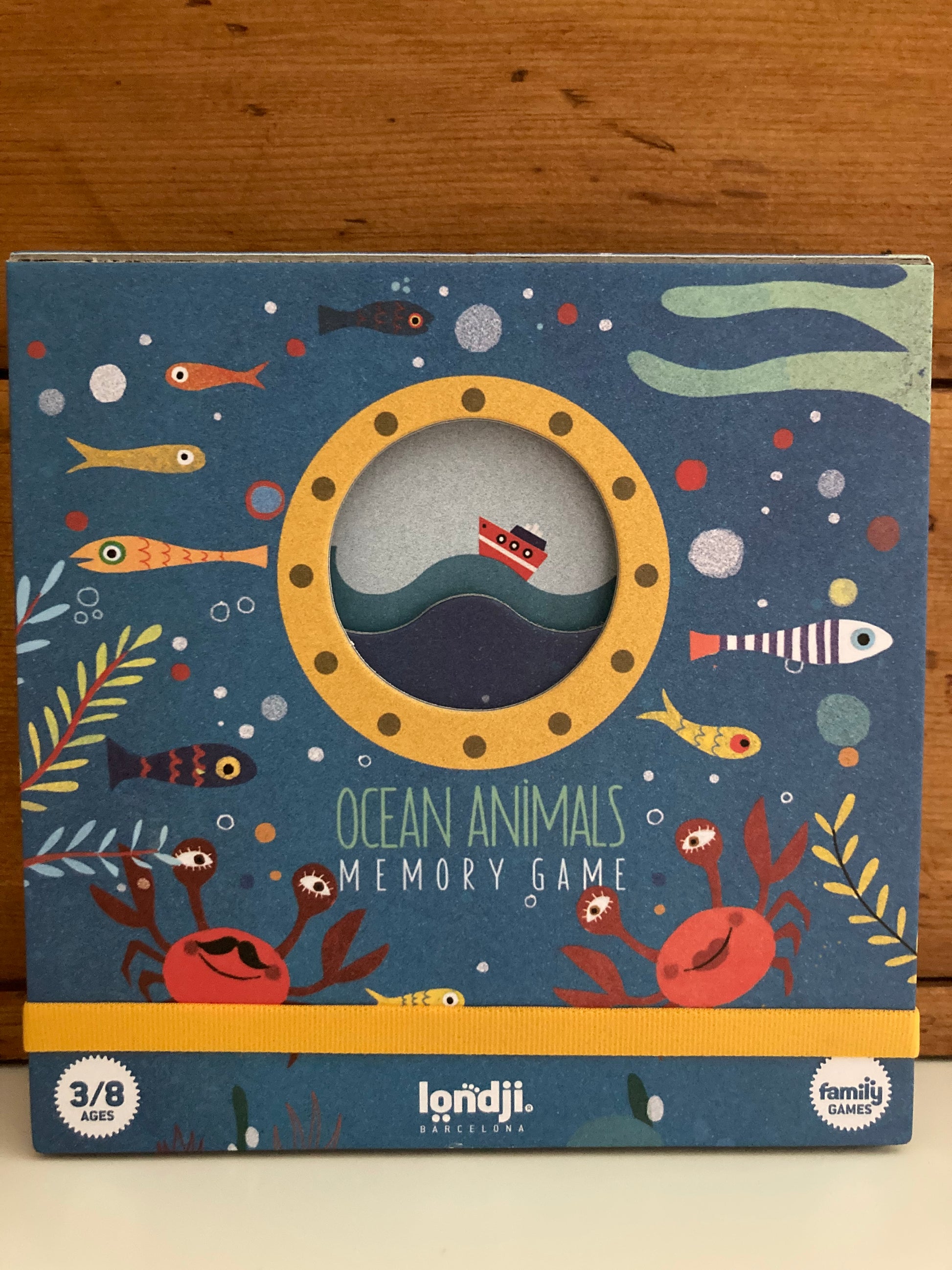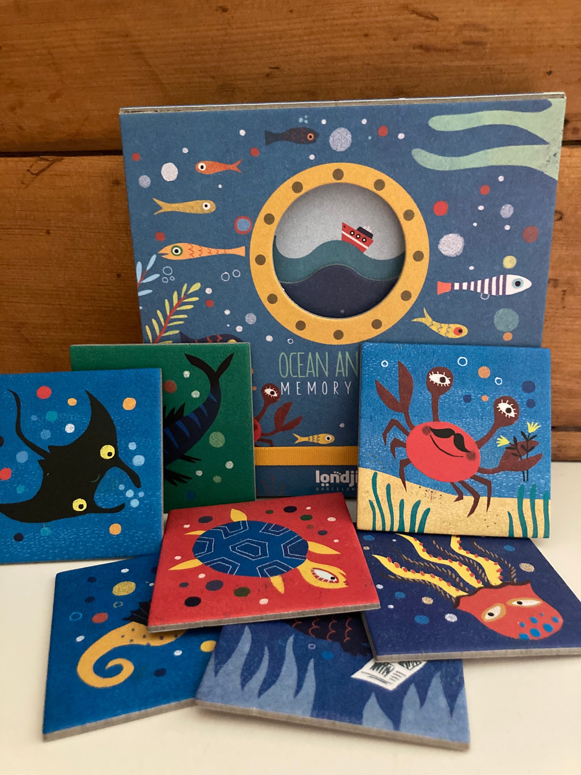 From Londji, Barcelona, OCEAN ANIMALS MEMORY GAME. Another great family game especially enjoyed by the youngest child. Large, heavy grade, cardboard colourful tiles are easy to match-up...and fun to stimulate educational talk about life under the ocean waves!