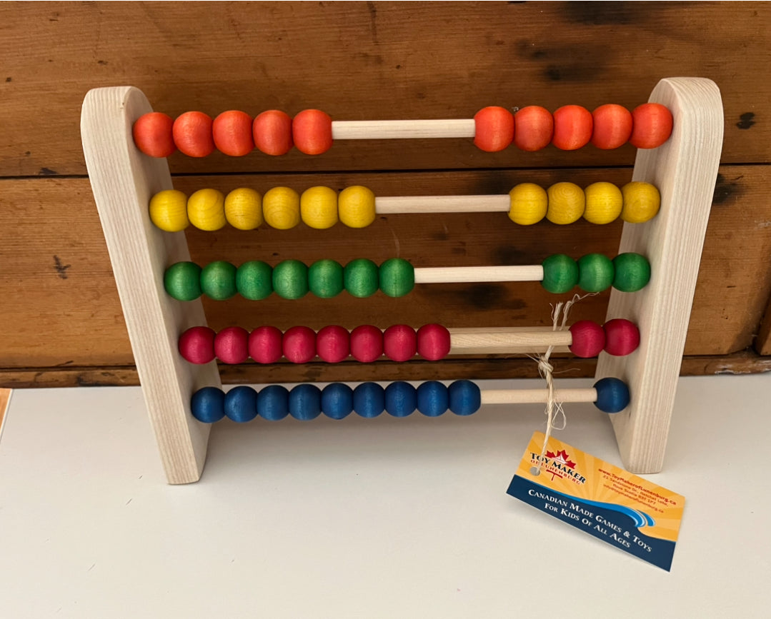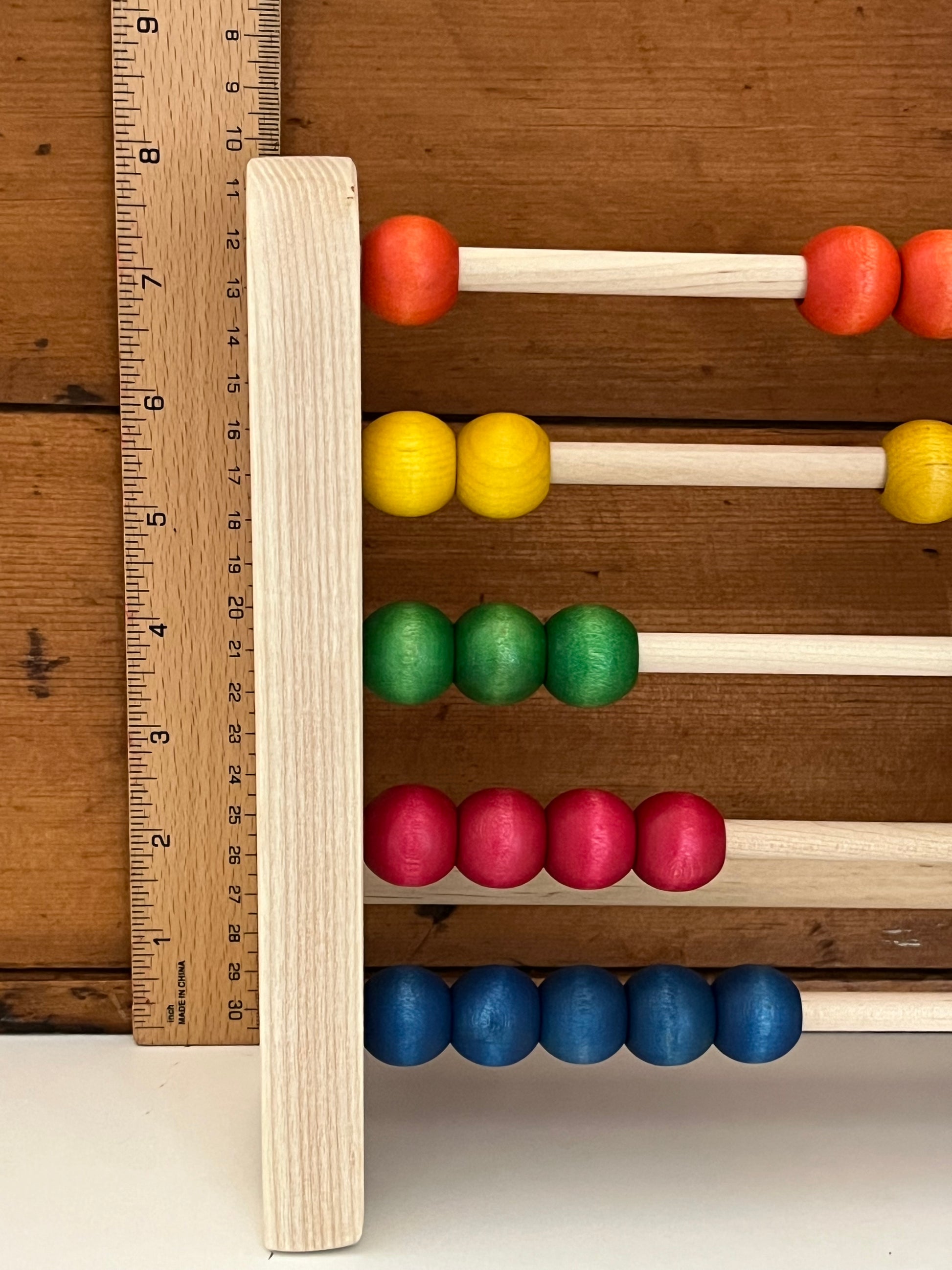 This 50 bead ABACUS FOR COUNTING is great for learning traditional base 10 math. Each of the 5 wooden dowels has 10 wooden beads in five primary colours. A different colour bead set on each dowel.