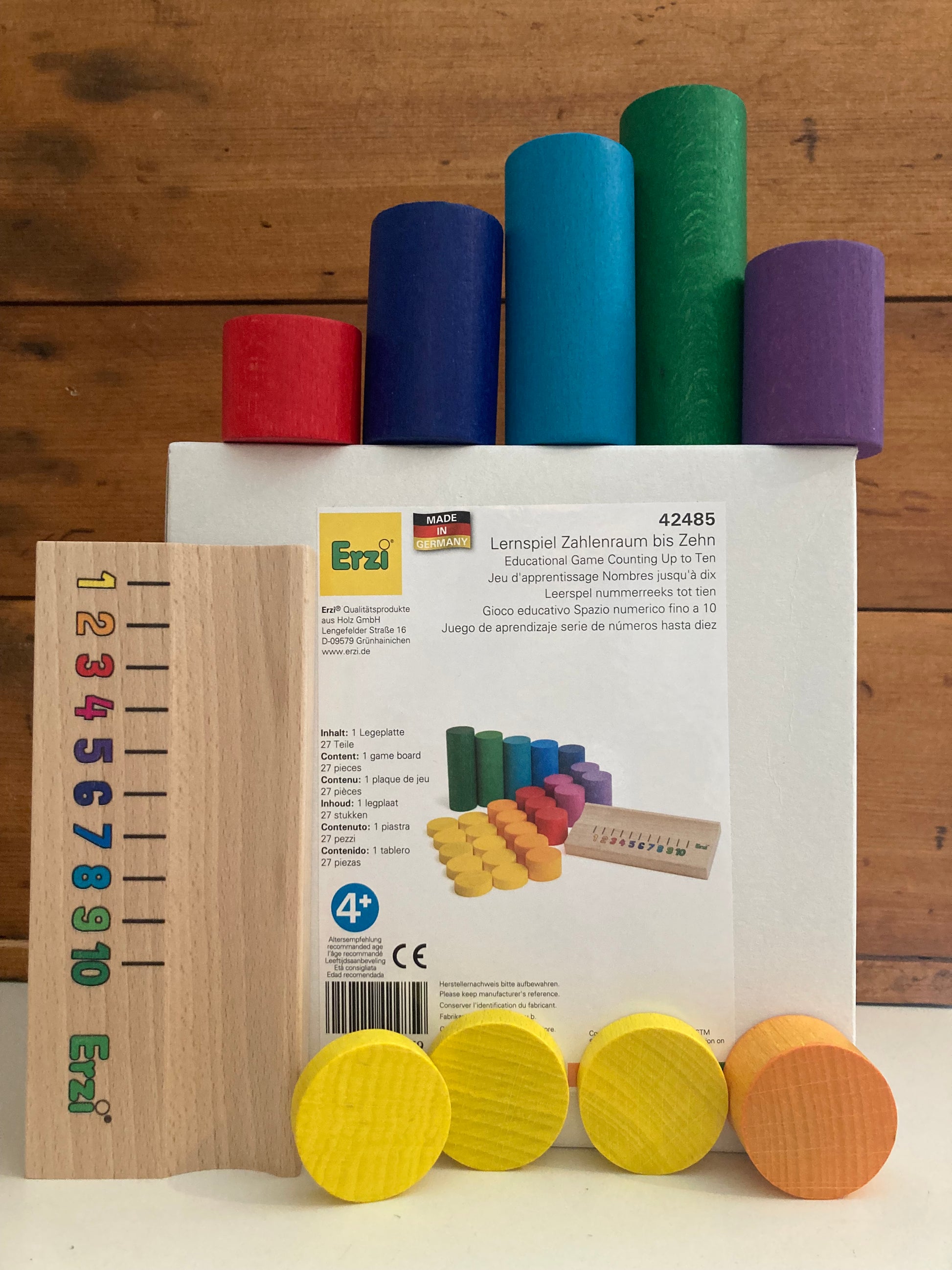The COUNTING UP TO TEN! SET includes 28 wooden pieces: 1 COUNTING TRAY BOARD. 27 WOODEN ROUNDS in 10 different sizes: 10x1 in YELLOW. 5x2 in ORANGE. 3x3 in RED. 2x4 in LIGHT PURPLE. 2x4 in DARK PURPLE. 1 each in 5 different colours, each solid wood pillar getting bigger from DARK BLUE, to LIGHT BLUE, to SKY BLUE, to LIGHT GREEN, to DARK GREEN. Includes an instruction booklet with suggested ideas for simple mathematical exercises. View our WOODEN SCALE for weighing the rounds. Sold separately.