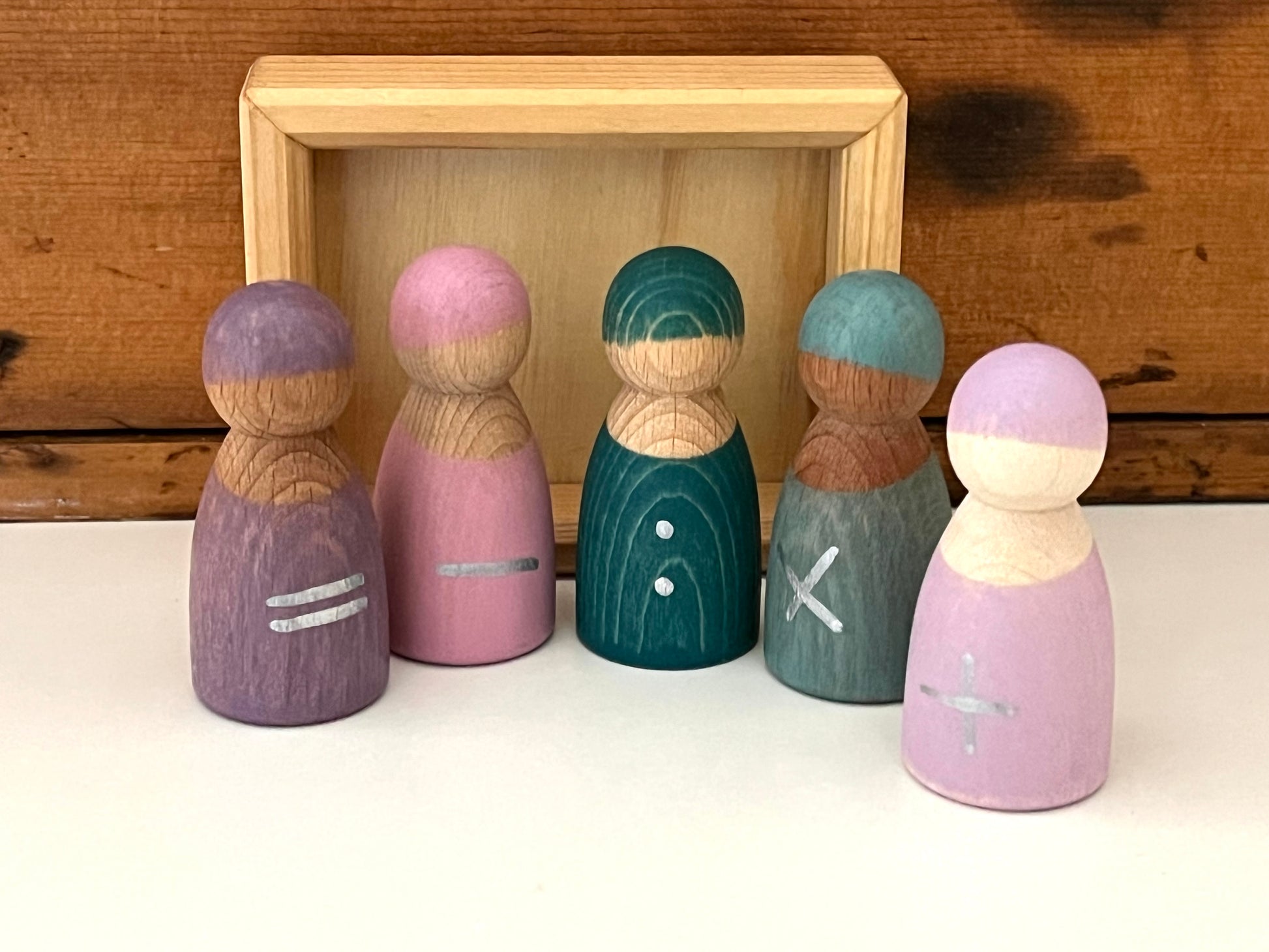 6 pieces: The 5 MATH FRIENDS (+ - : x =) in a wooden frame. Three different types of wood from sustainable forestry, depending on availability (maple wood, beech wood, cherry wood or alder wood), non-toxic water based colour stain, and non-toxic plant based oil finish.