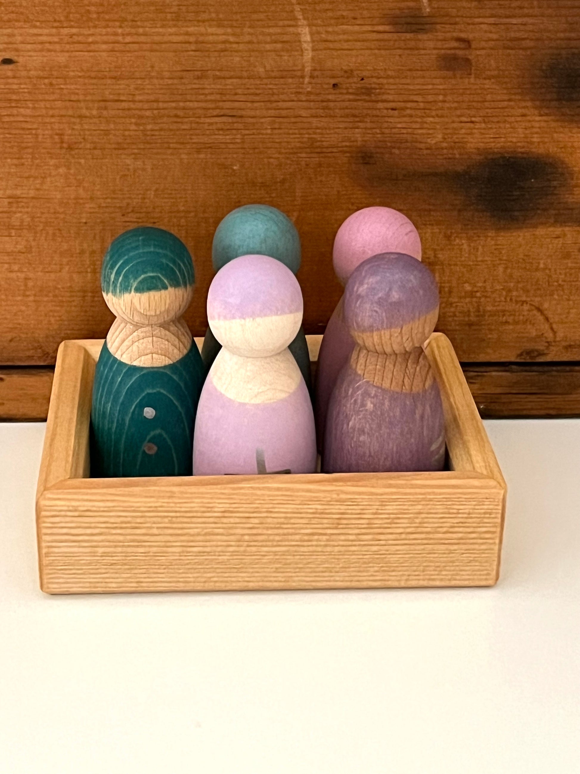 Each one of the little hand-painted wooden figures has a different look and individual wood grain. These happy little wooden figures, made from different types of wood from trees indigenous to central Europe, are gender neutral. With no specific facial expression, they can be either sad or happy.