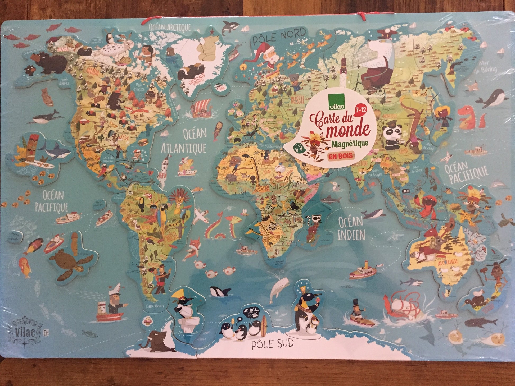 Educational WOODEN WORLD MAP - In French, or English