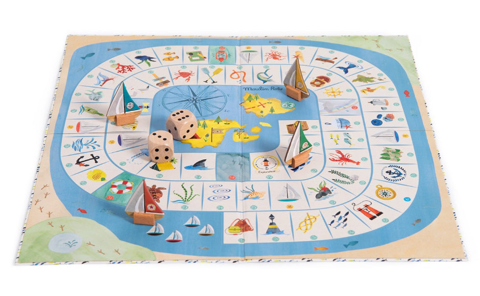 2 beautiful wooden dice are included, with instructions on how to move your boat playing piece around the beautifully illustrated playing board. The object of the game is to sail your boat to Treasure Island in the middle of the board.