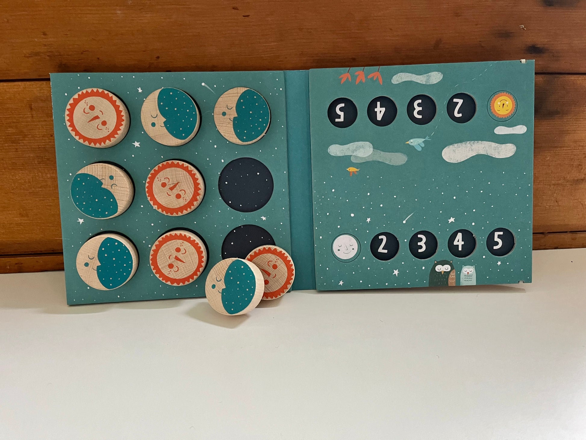 Playing counters are made from wood, and the game comes in a sturdy cardboard box. Each counter measures 4 cm in diameter and the box size is 16 x 16 x 2.5 cm.