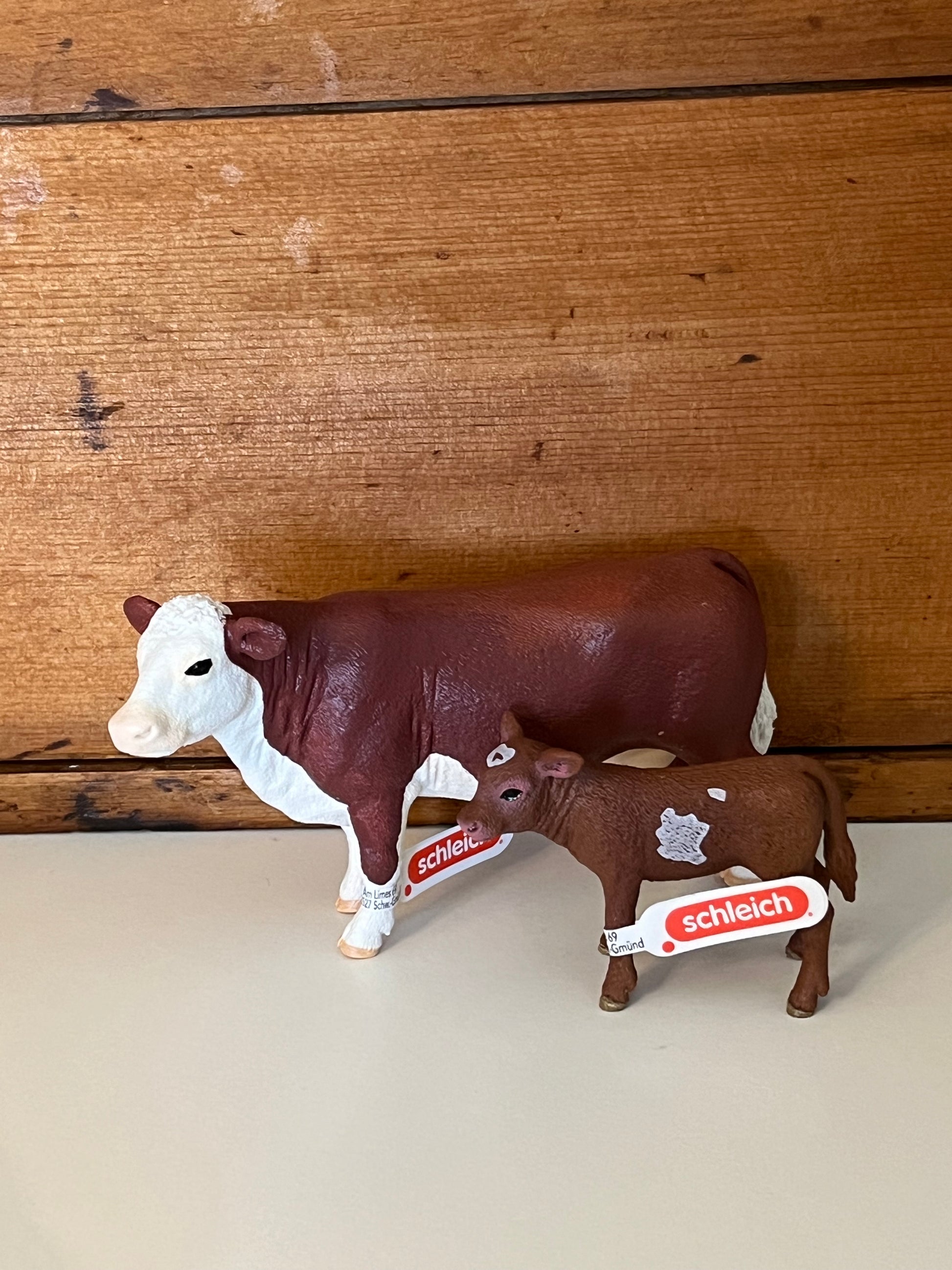 This is the Schleich HEREFORD CALF. Sweet and gentle now...and tiny, calves need their mother's protection now. Soon they can be as big and large as a HEREFORD COW.