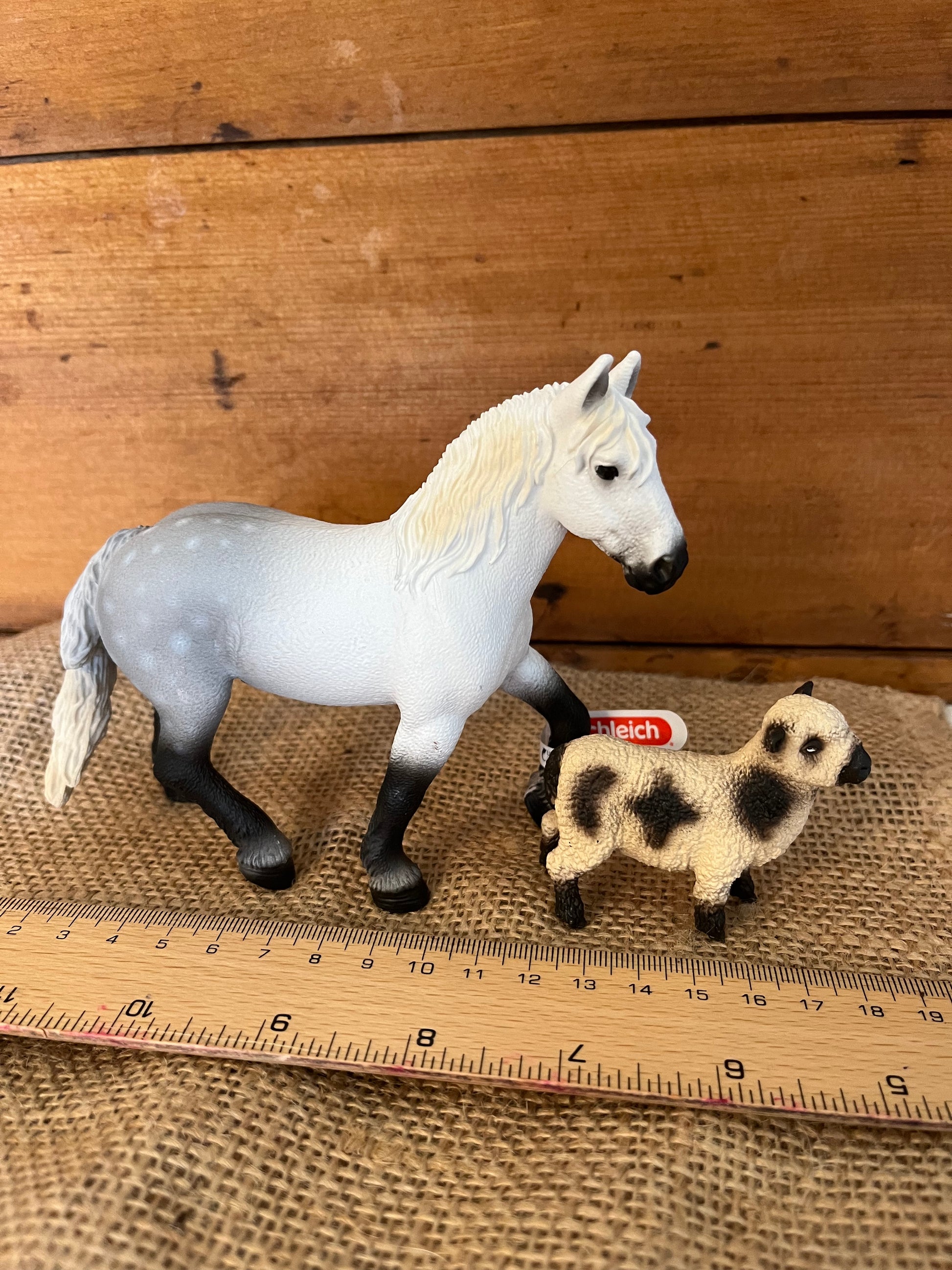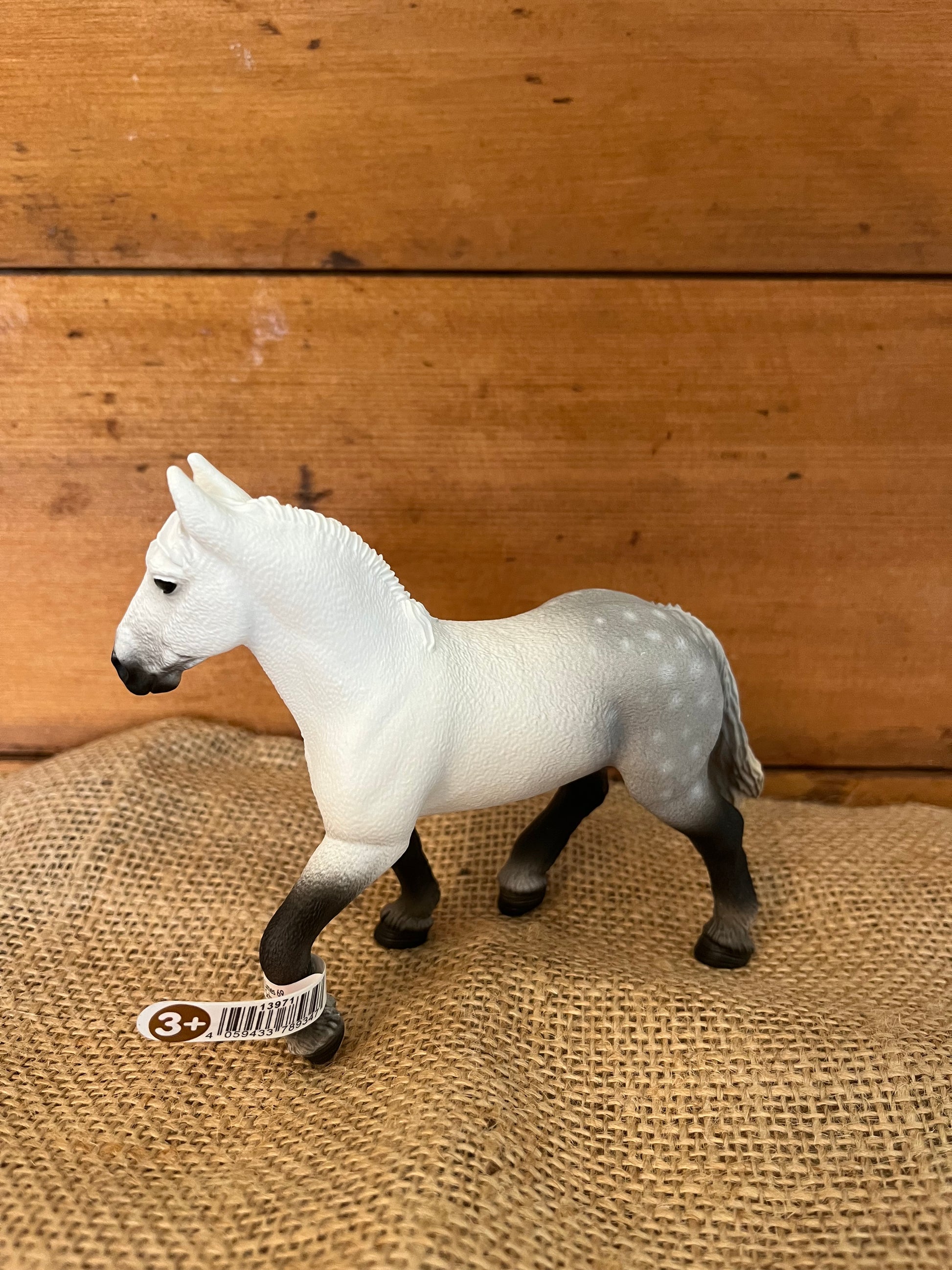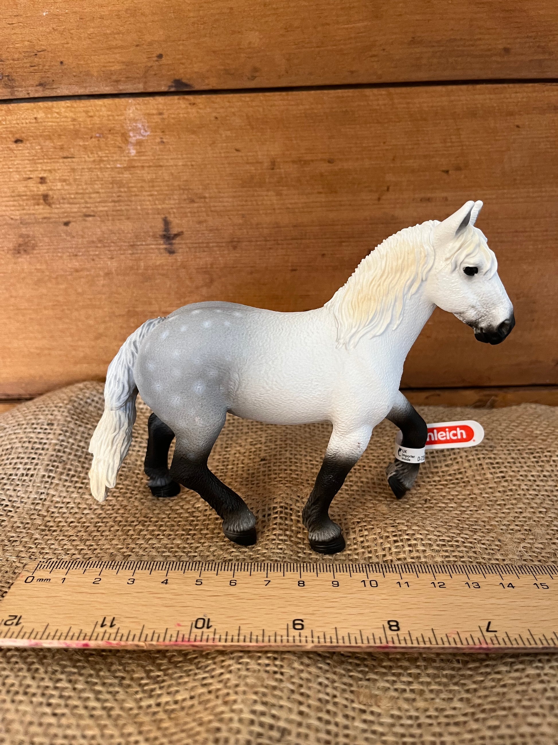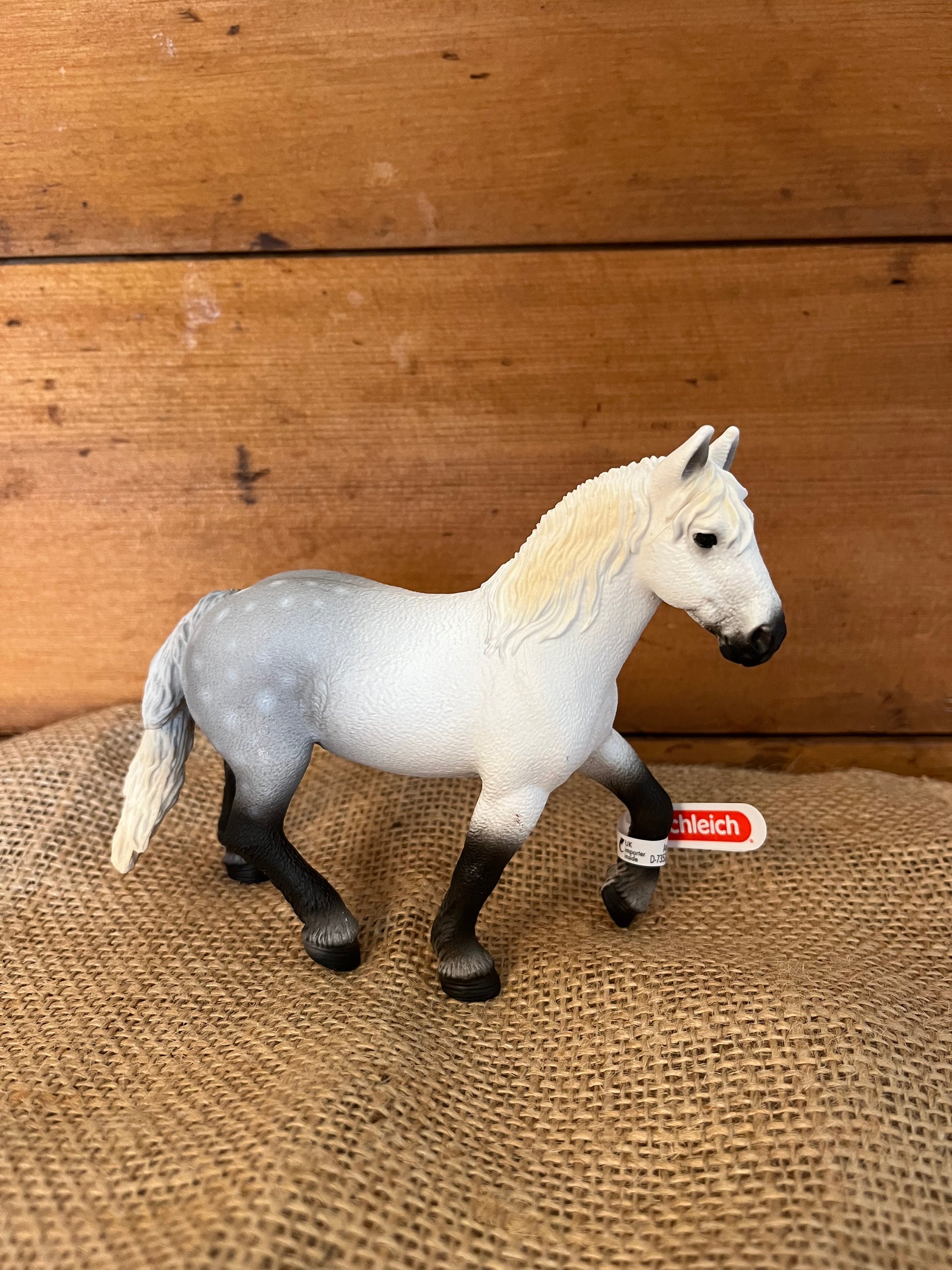 This is the Schleich PERCHERON DRAFT HORSE. A beautiful, large dappled grey draft horse originally bred in the Perche region of France. Percheron horses are very easy going, but very big!