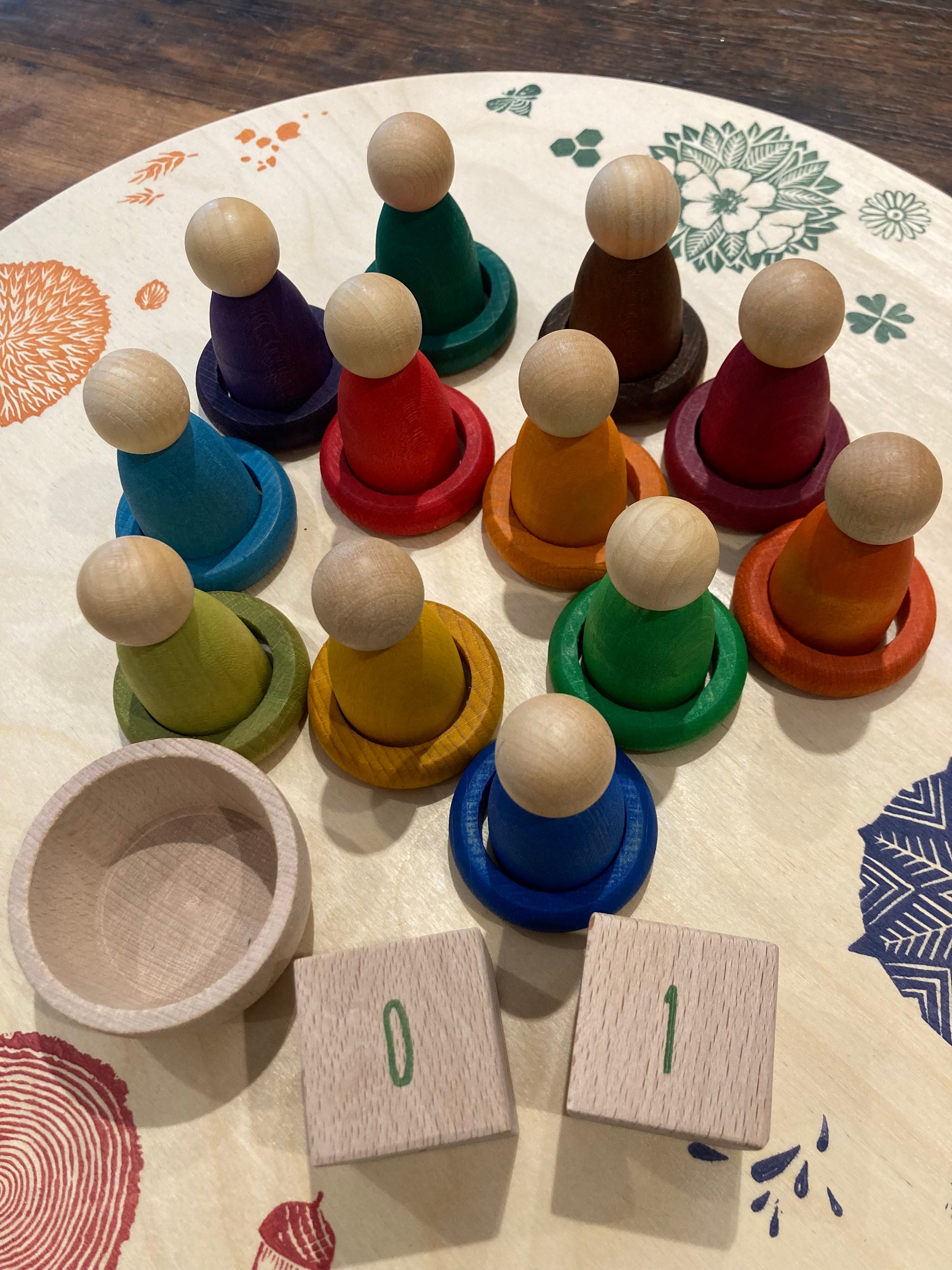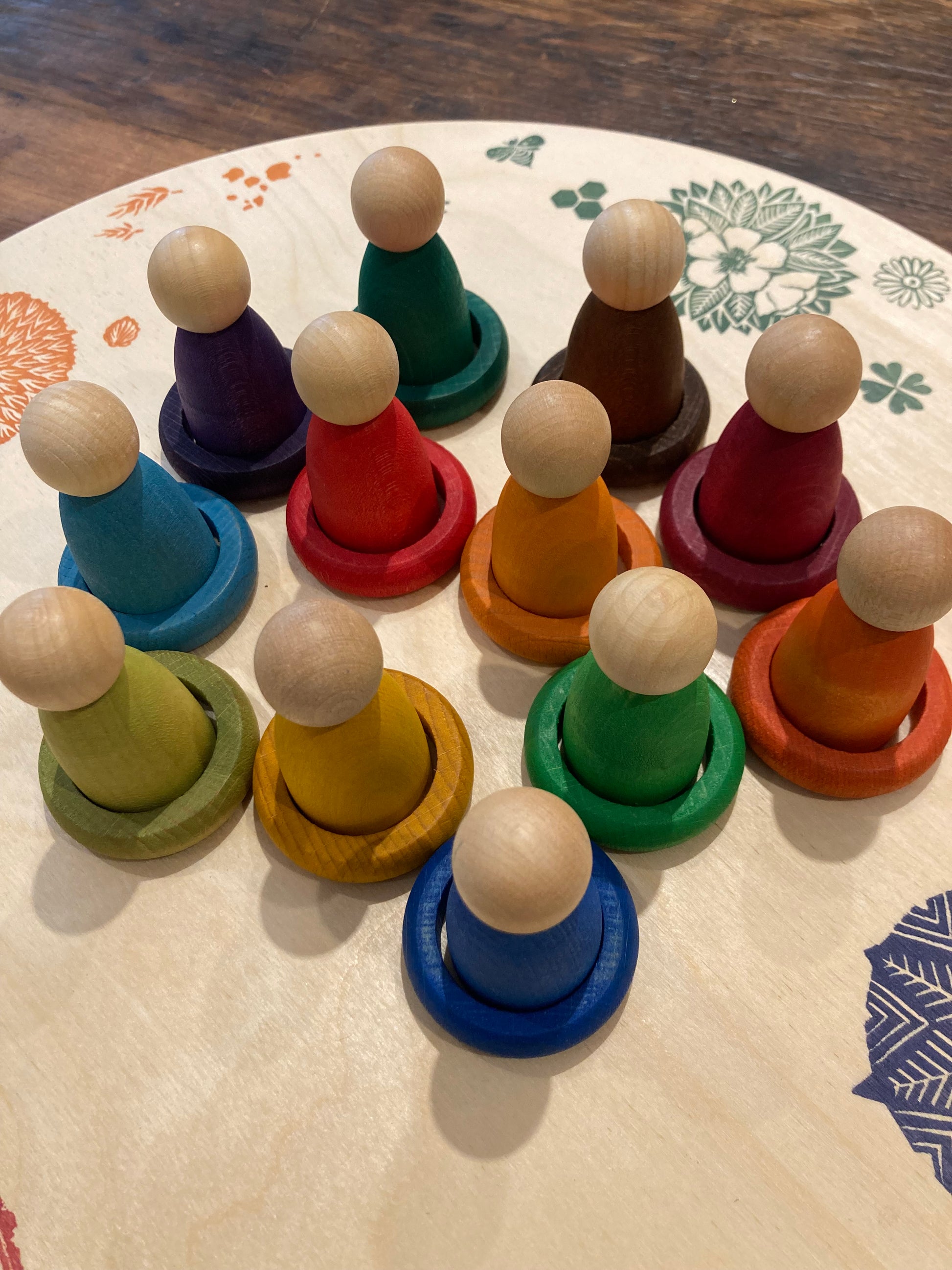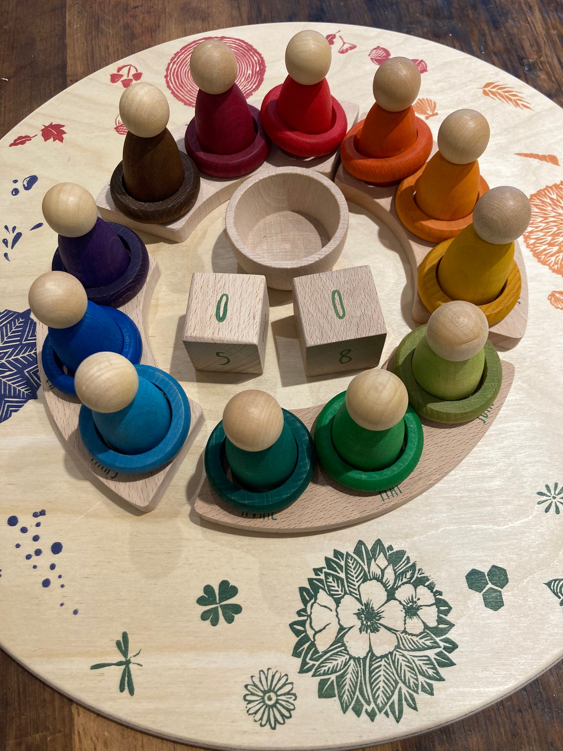This beautiful, handmade wooden calendar represents the circle, that has no beginning or end, an infinite circle that rebuilds itself. Arranged in the circle, the friendly Nins, painted in warm seasonal colours, invite children to reflect on ritual gatherings, perhaps 'round a bonfire, or in a Circle of Friends, to share stories and talk about life...our circular world, our solar system... the Earth orbiting around the Sun! This creates this inviting Perpetual Circular Calendar. Allowing Children to play and touch time!