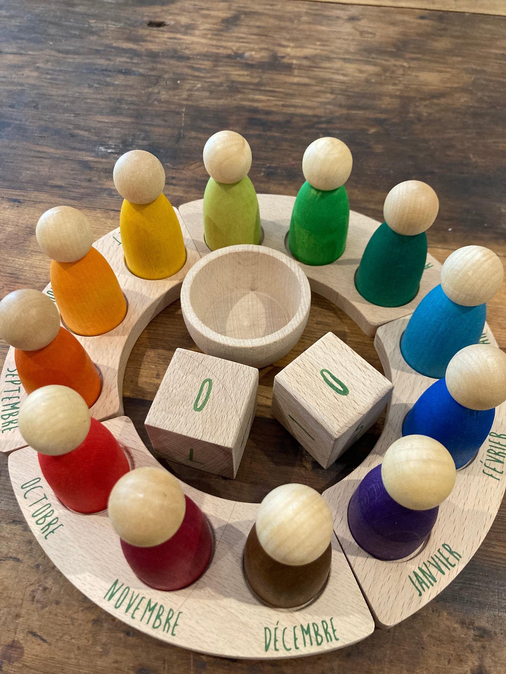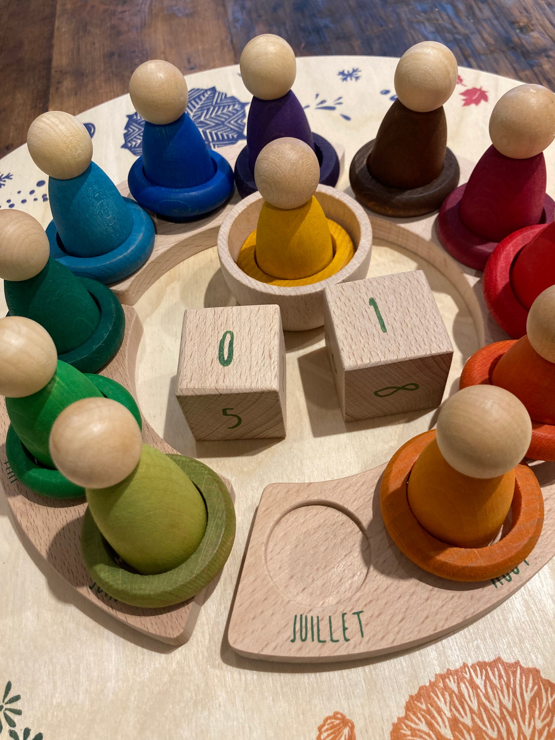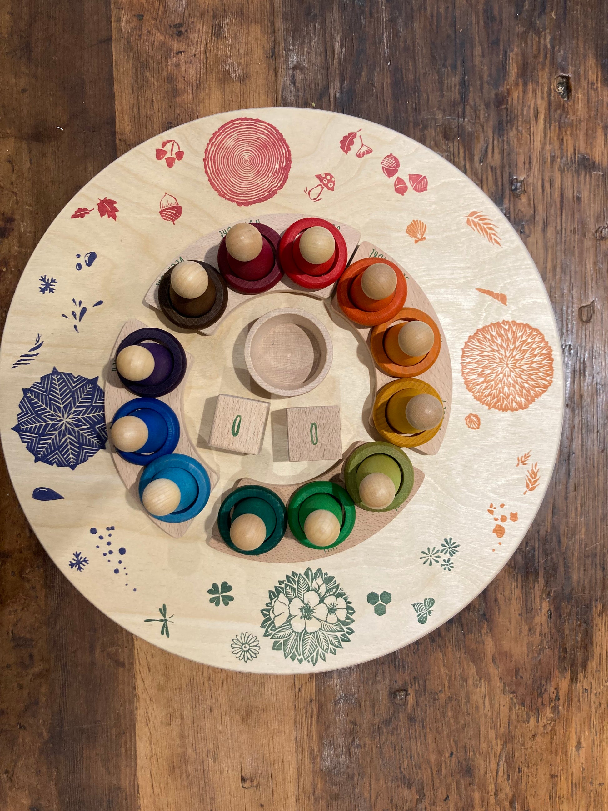 This is the absolutely lovely WOODEN PERPETUAL CIRCULAR CALENDAR IN FRENCH, complete with 12 WOODEN NINS and 12 WOODEN RINGS, in seasonal corresponding colours, all beautifully presented on the WOODEN FOUR SEASON PLATFORM. Includes the 2 large DATE MARKERS, and small WOODEN BOWL to hold seasonal treasures corresponding to the month, or the NIN of the MONTH!