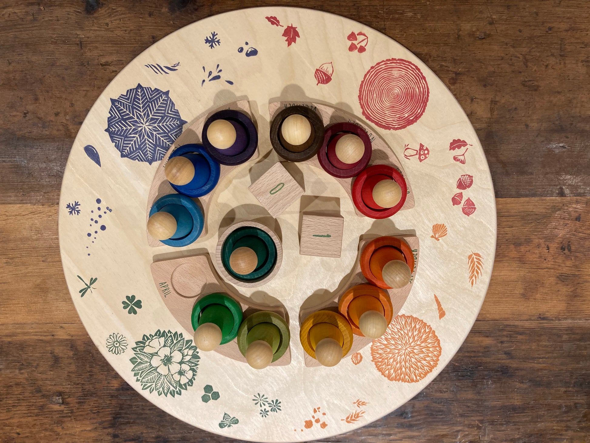 This is the absolutely lovely WOODEN PERPETUAL CIRCULAR CALENDAR IN ENGLISH, complete with 12 WOODEN NINS and 12 WOODEN RINGS, in seasonal corresponding colours, all beautifully presented on the WOODEN FOUR SEASON PLATFORM. Includes the 2 large DATE MARKERS, and small WOODEN BOWL to hold seasonal treasures corresponding to the month, or the NIN of the MONTH!