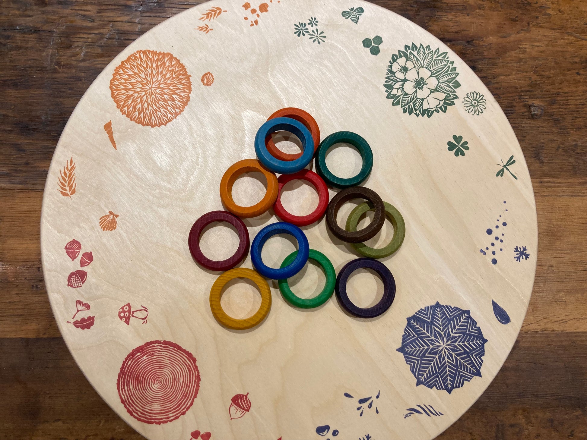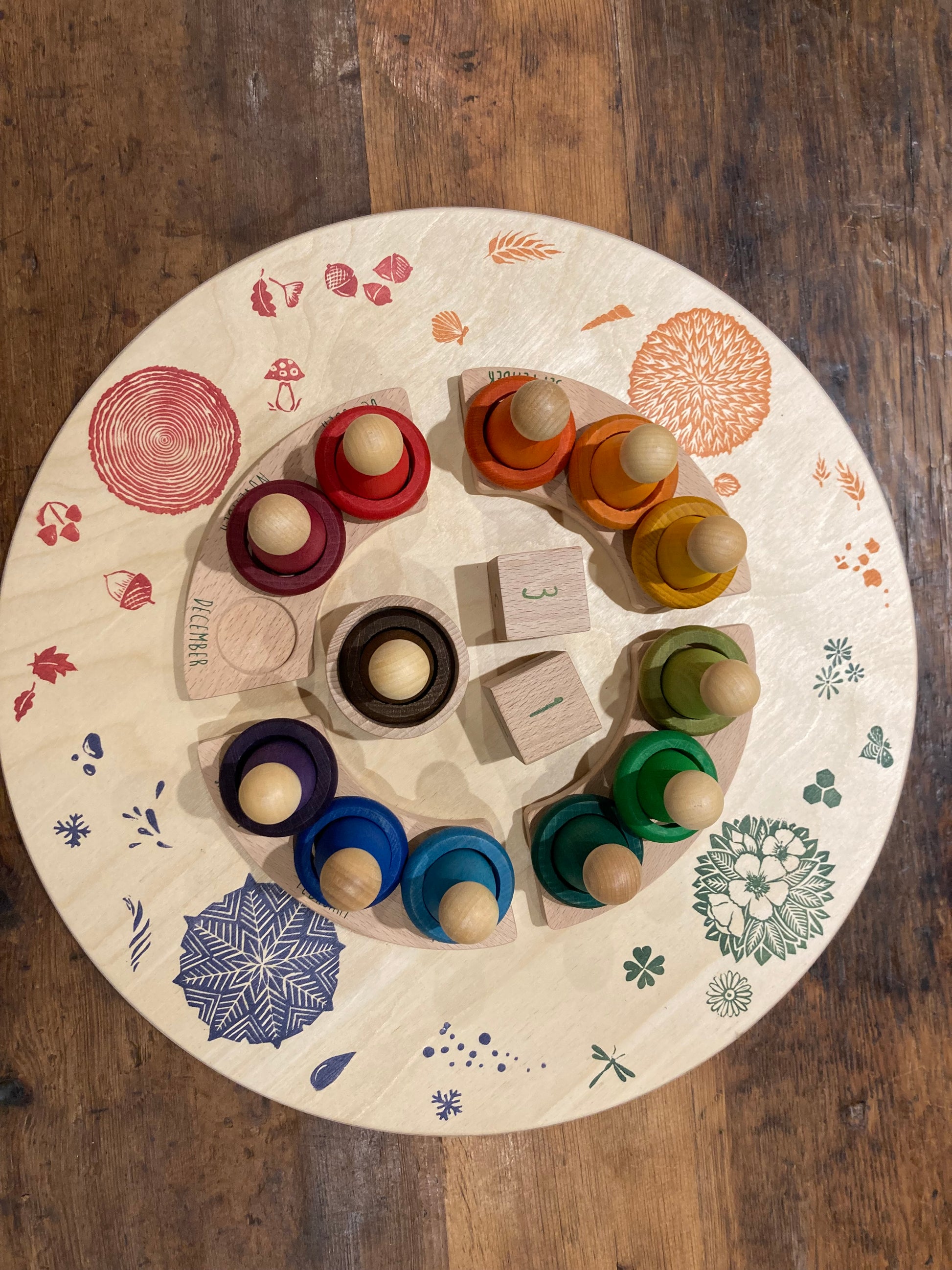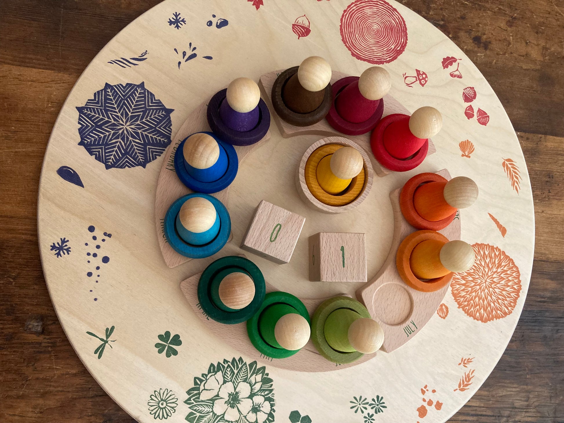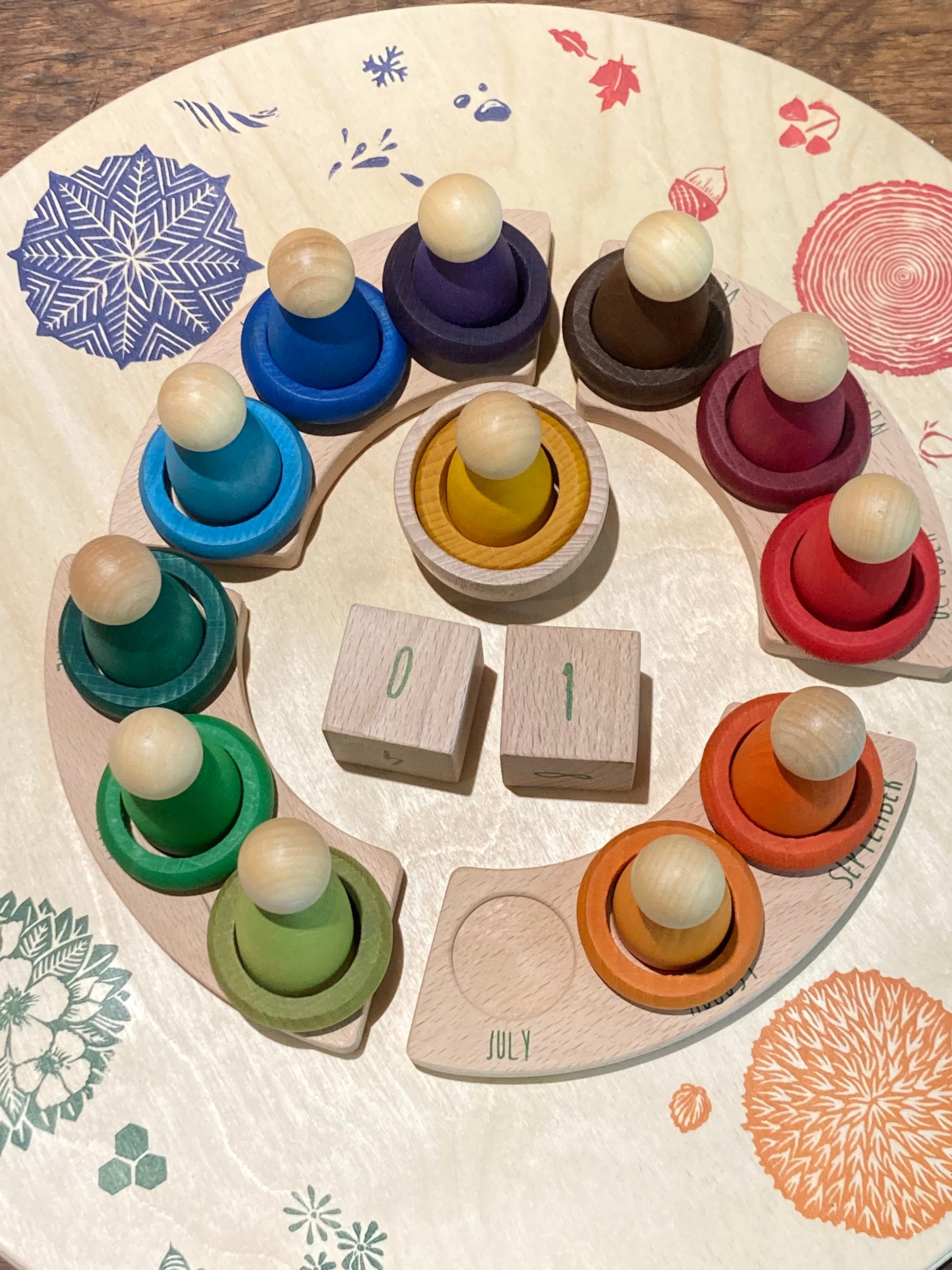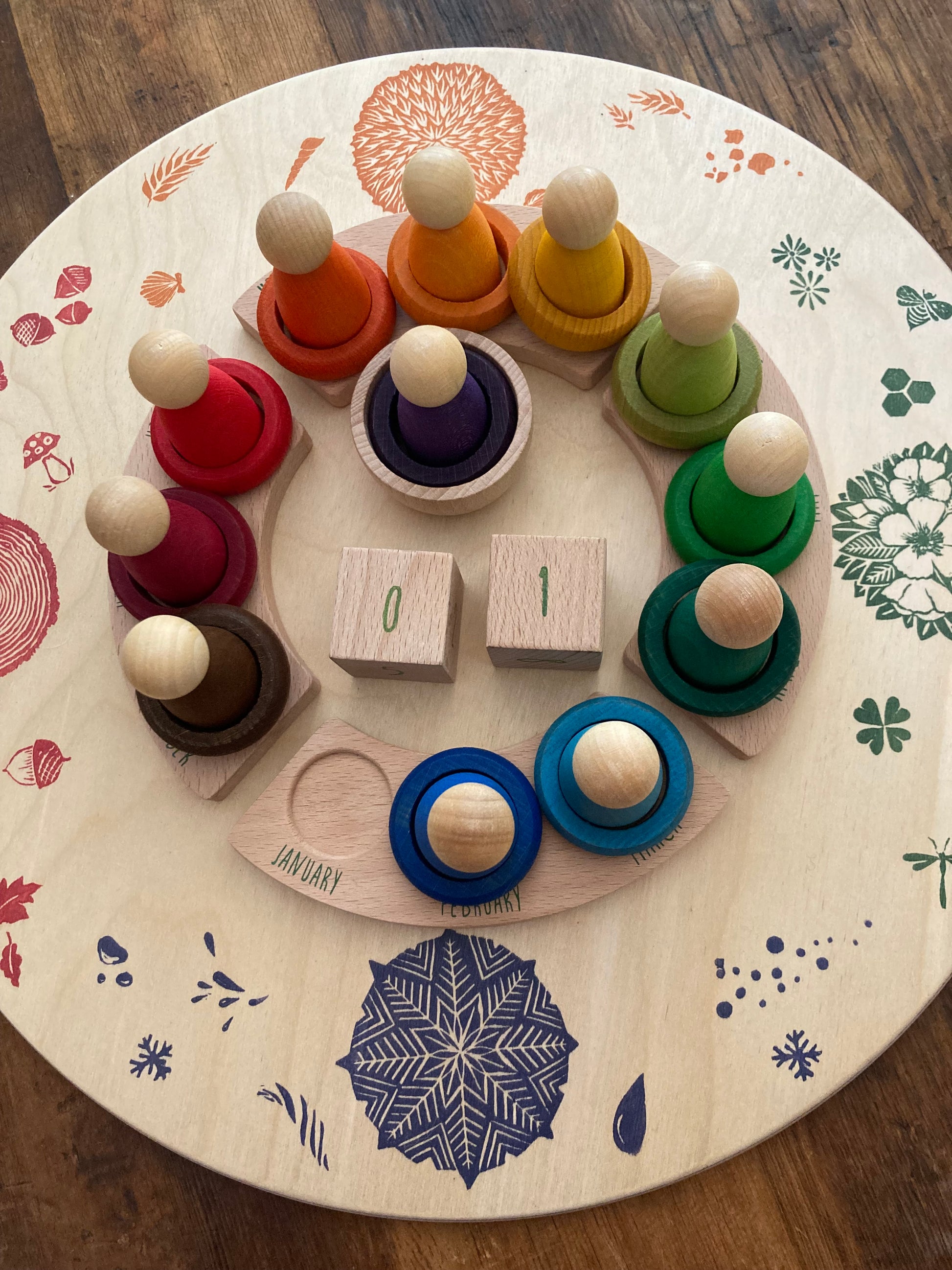 This beautiful, handmade wooden calendar represents the circle, that has no beginning or end, an infinite circle that rebuilds itself. Arranged in the circle, the friendly Nins, painted in warm seasonal colours, invite children to reflect on ritual gatherings, perhaps 'round a bonfire, or in a Circle of Friends, to share stories and talk about life...our circular world, our solar system... the Earth orbiting around the Sun! This creates this inviting Perpetual Circular Calendar. Allowing Children to play and touch time!