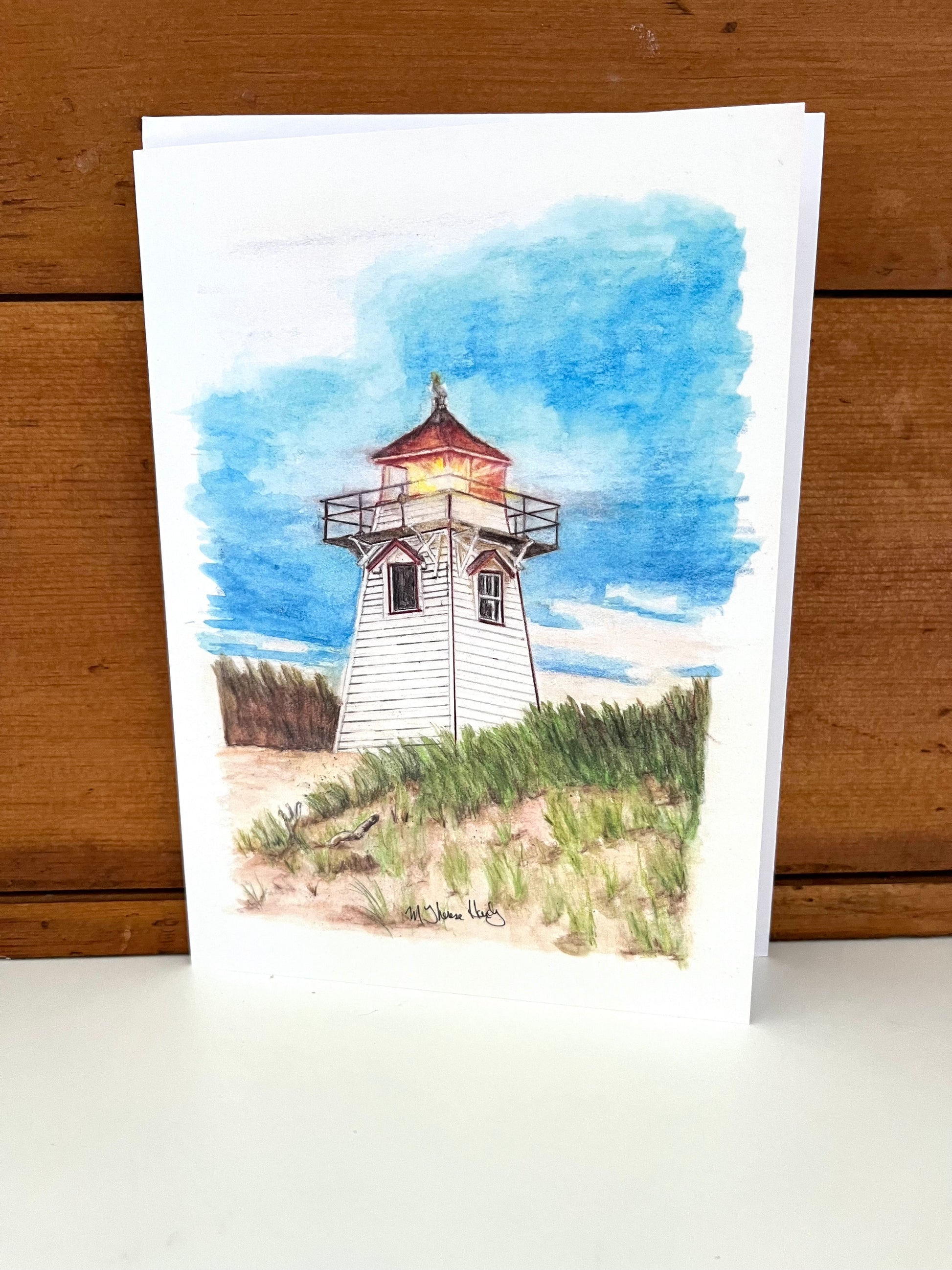 This is her painting PEI COVEHEAD LIGHTHOUSE. See all her lovely Art from the Heart greeting cards. Sold separately.