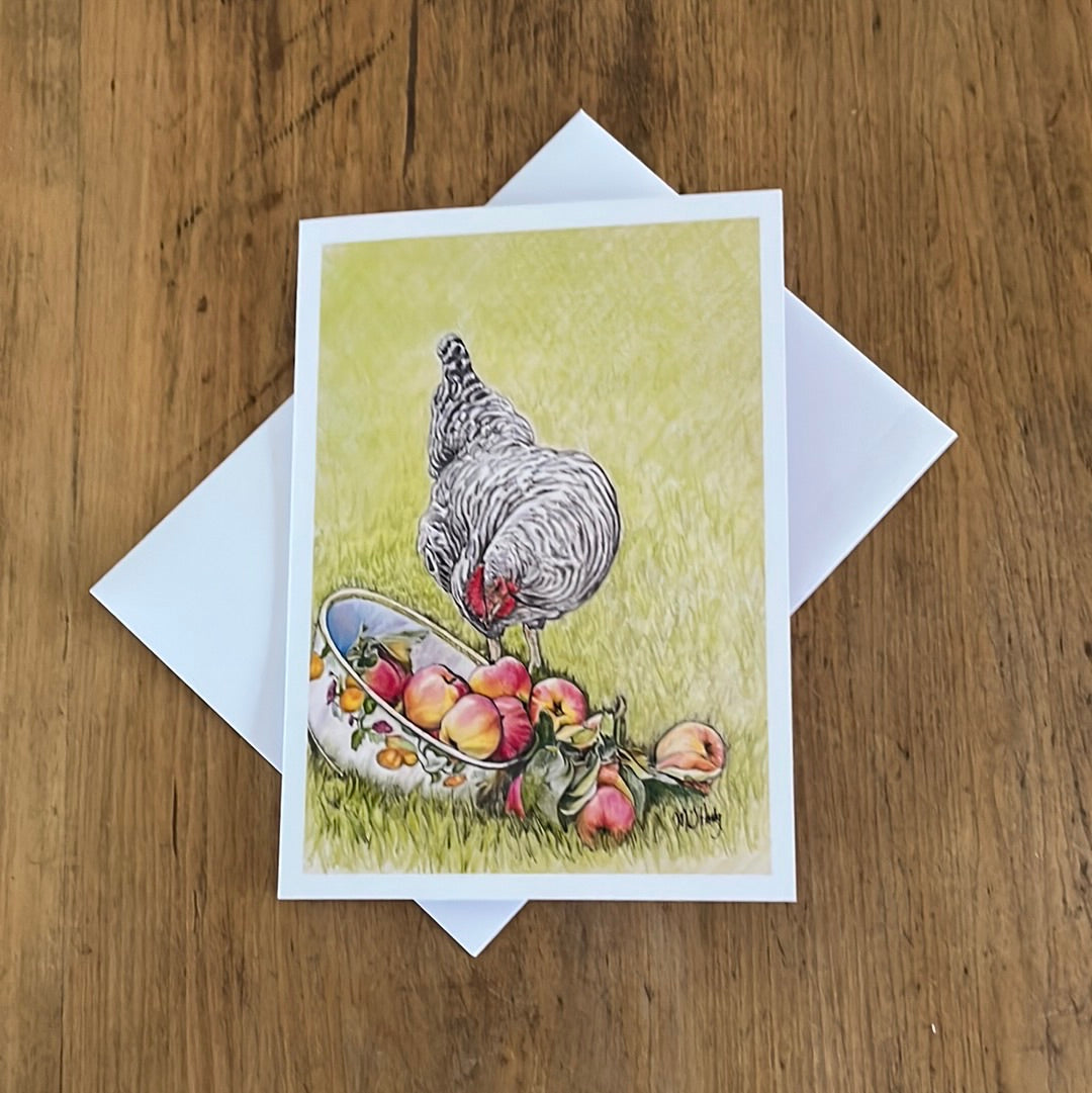 This is her painting CHICKEN AND APPLES. See all her lovely Art from the Heart greeting cards. Sold separately.