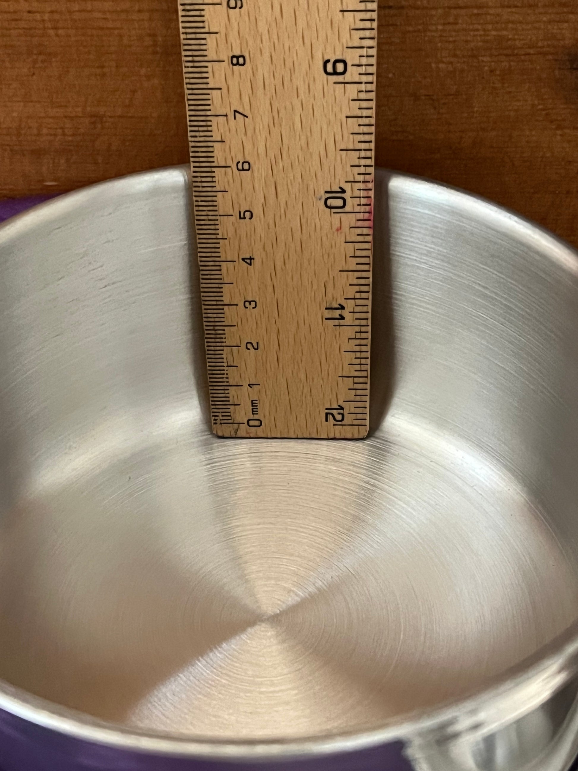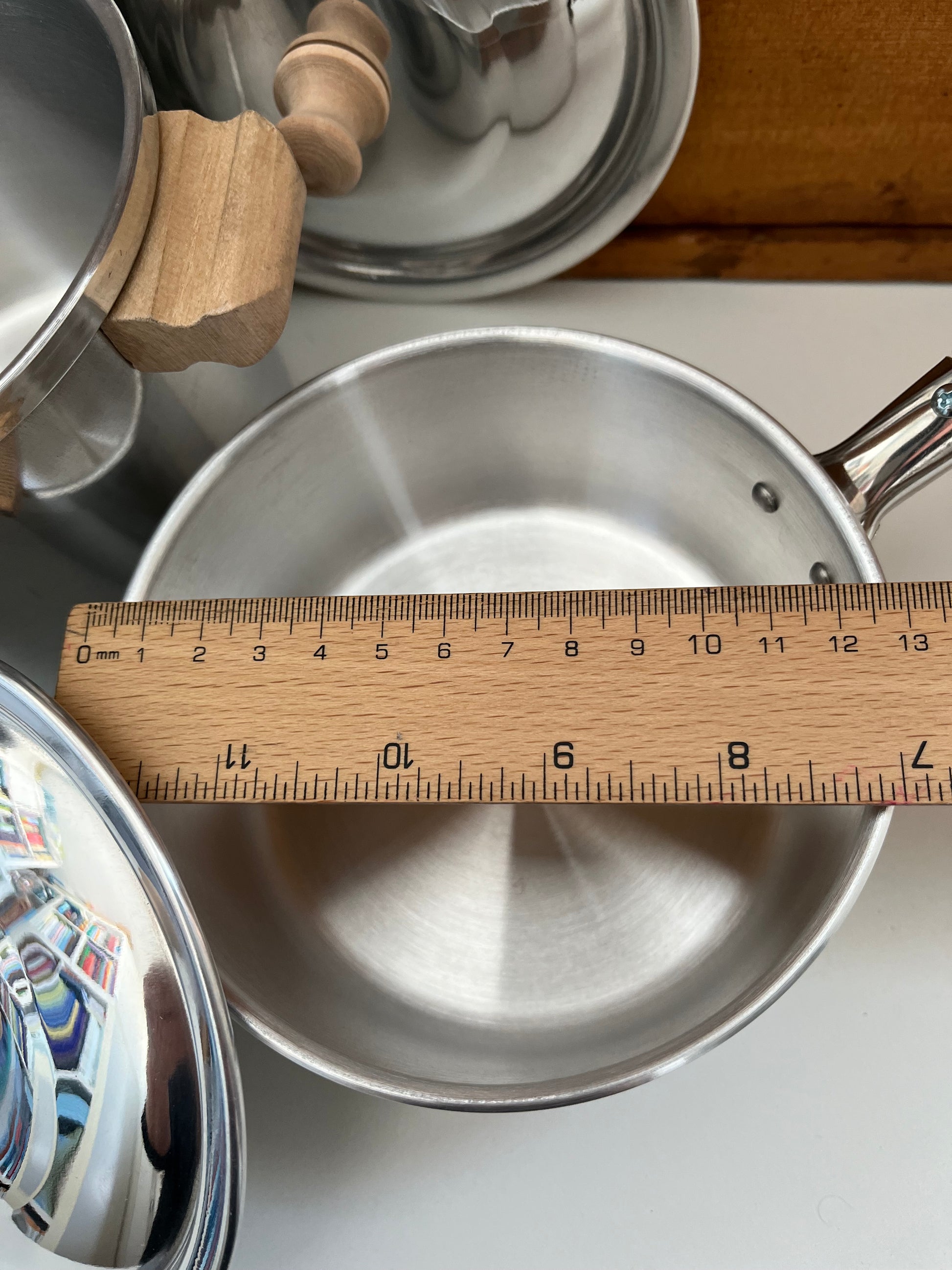 Sizes: ALL are 12 cm across (4,5inches). Large Stock Pot is 10cm deep (4inches) and Small Stock Pot is 6cm deep (2,25inches). Saucepan is also 6cm deep (2,25inches).