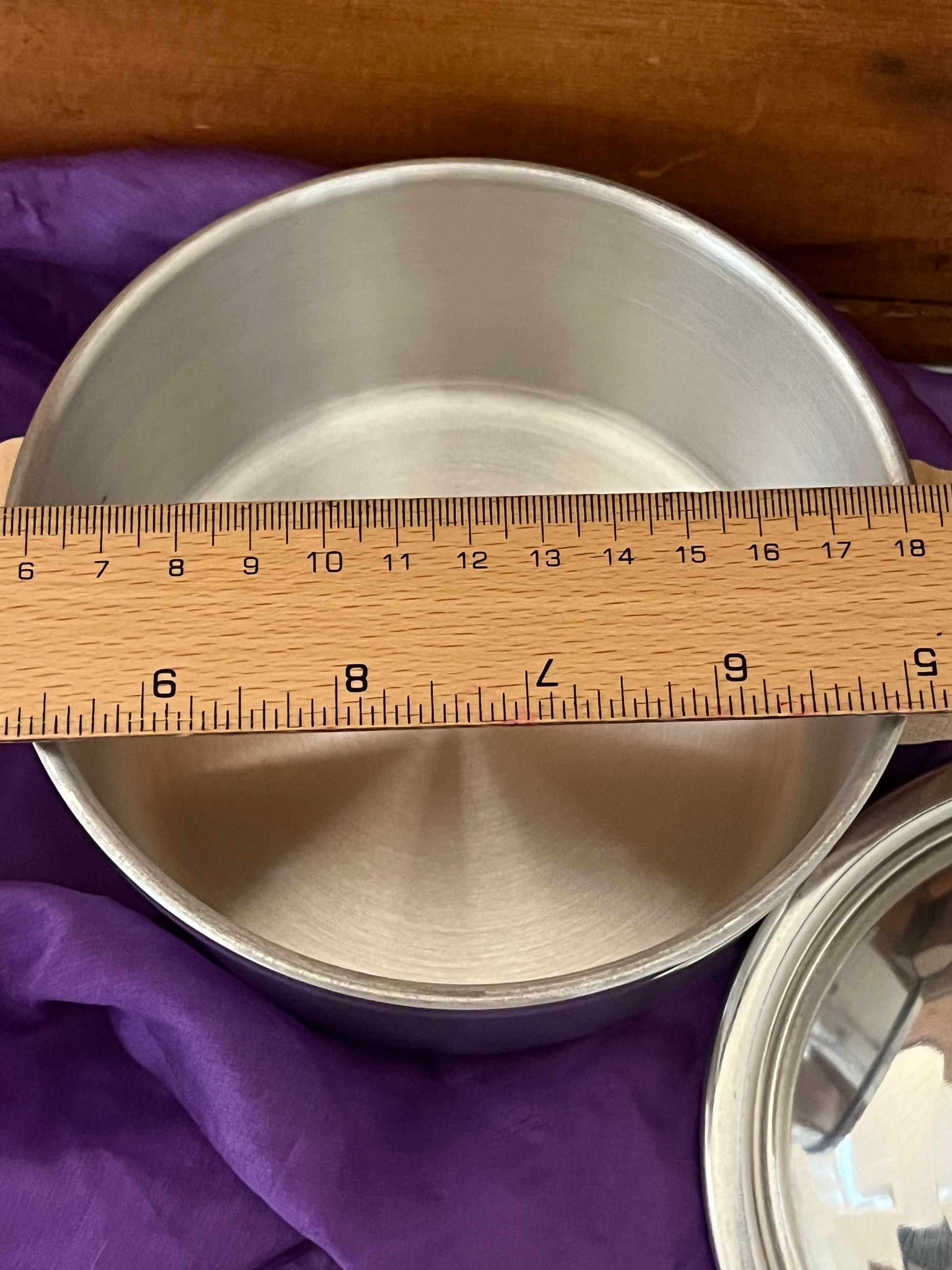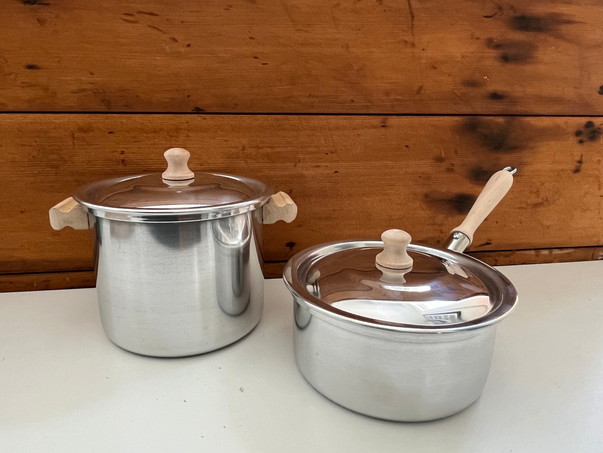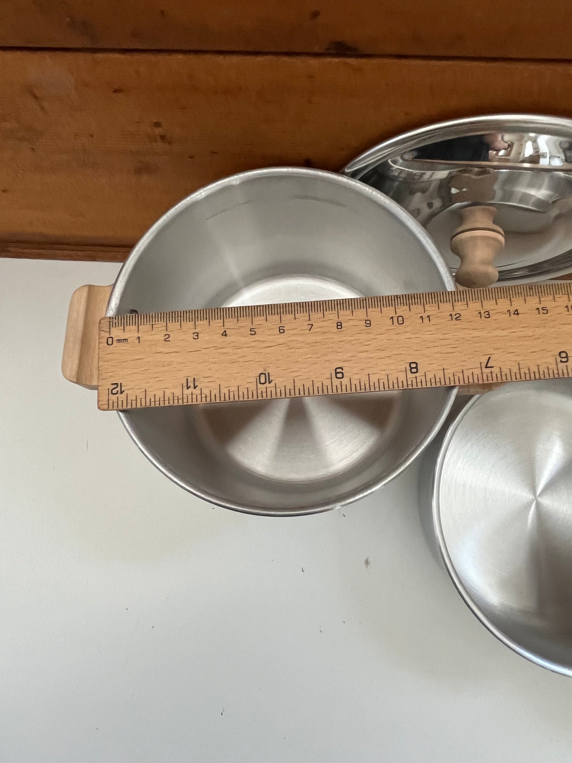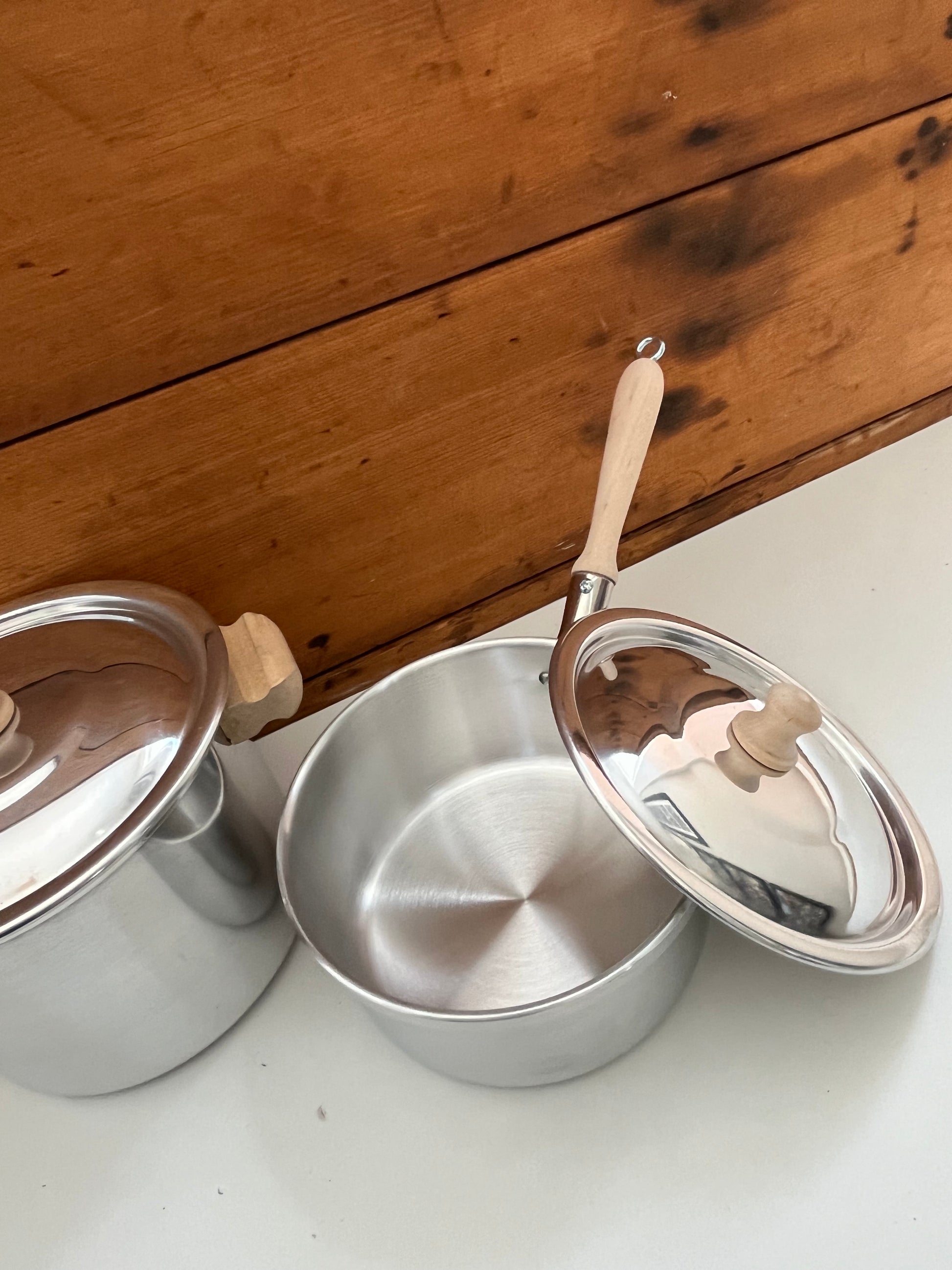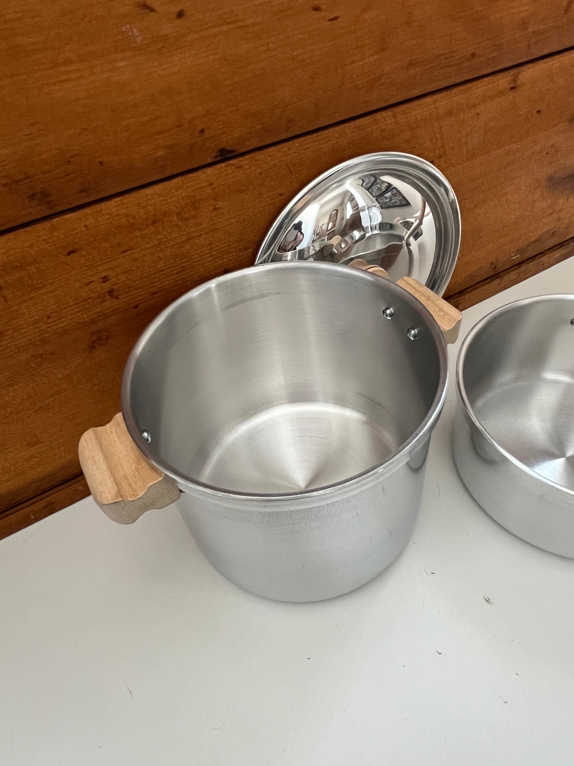 Bright shiny, lightweight, durable ALUMINIUM COOKING POTS, with LIDS and WOODEN HANDLES! All lids have a wooden knob, to easily lift lid during cooking!