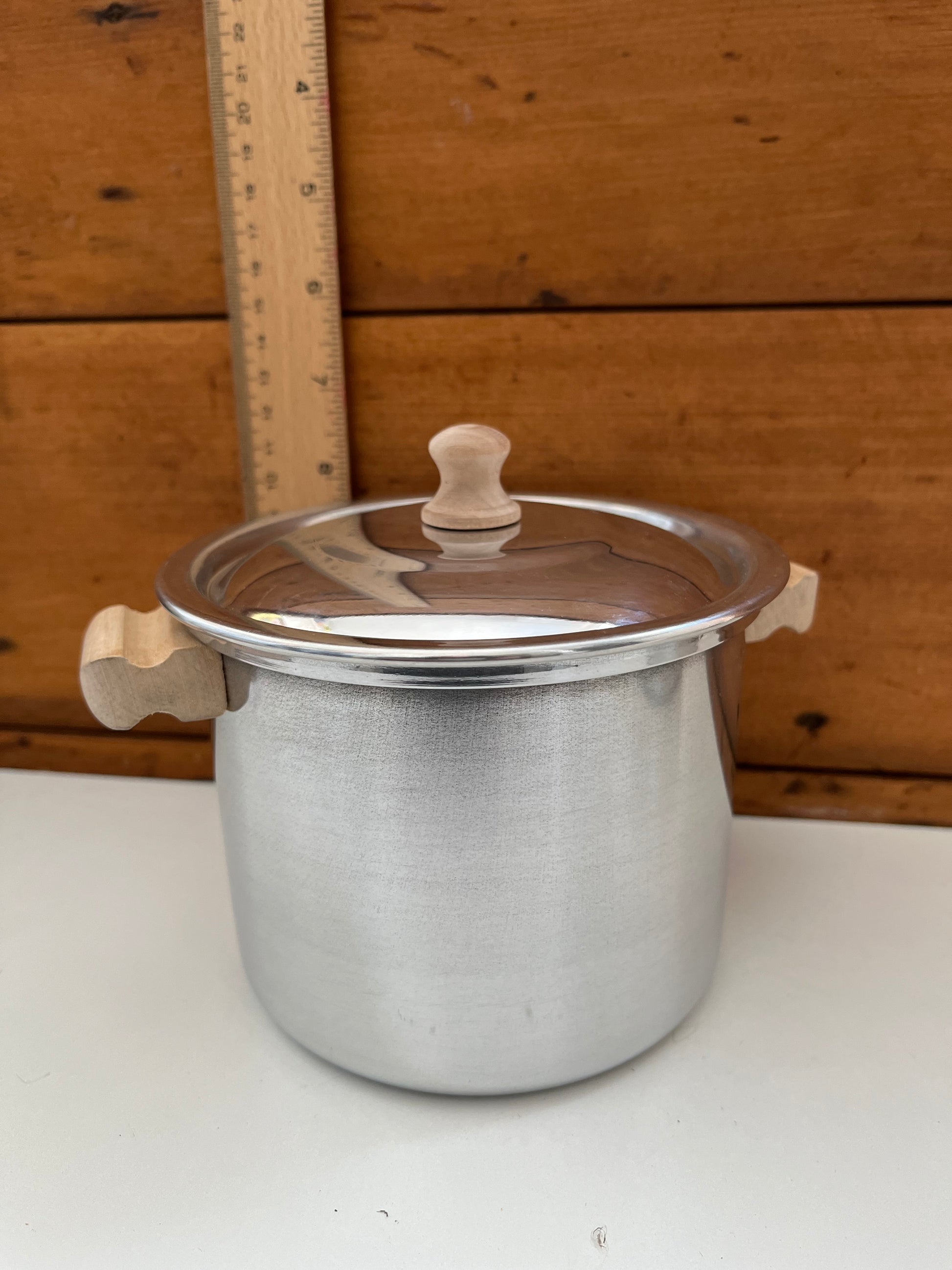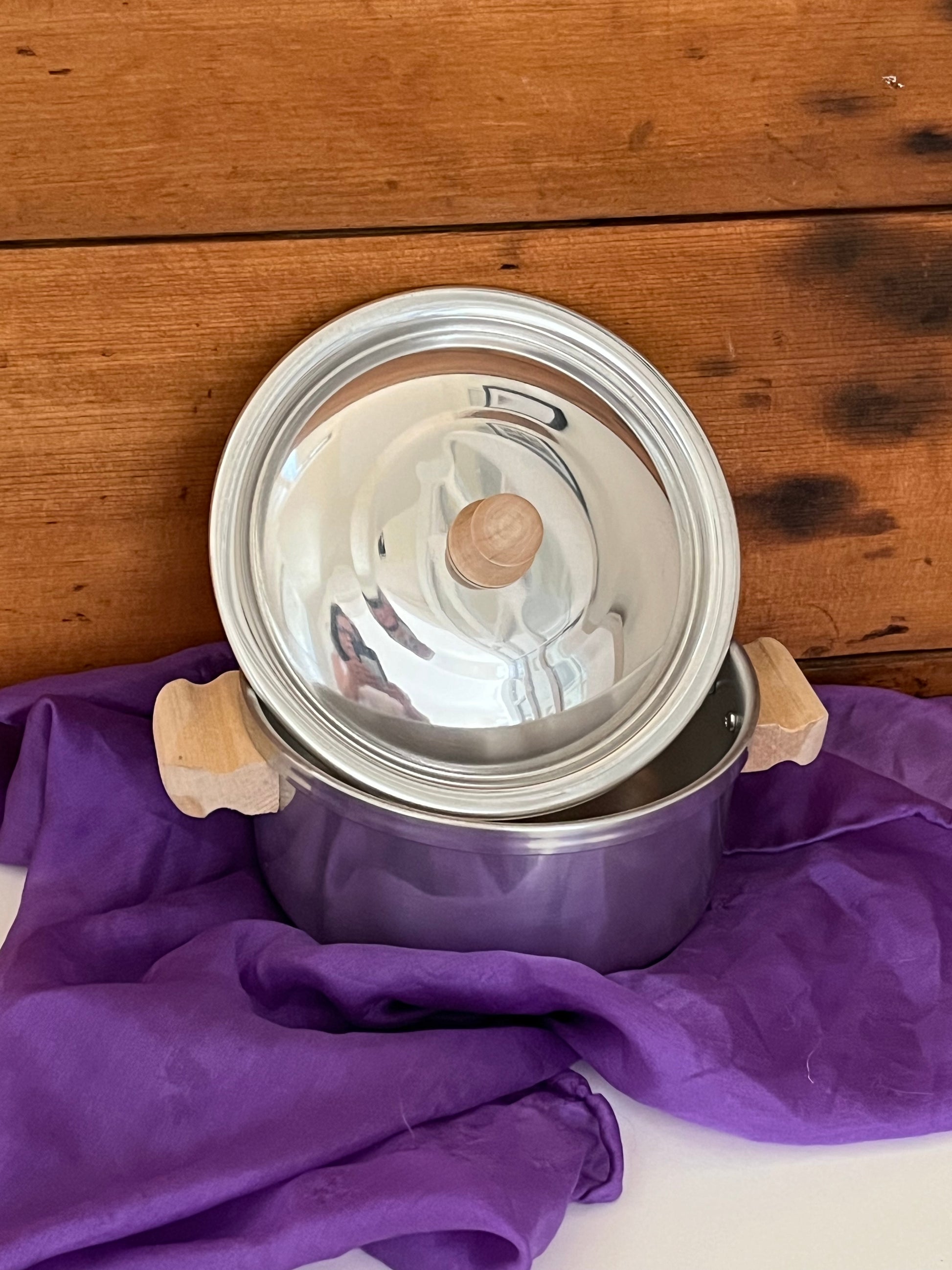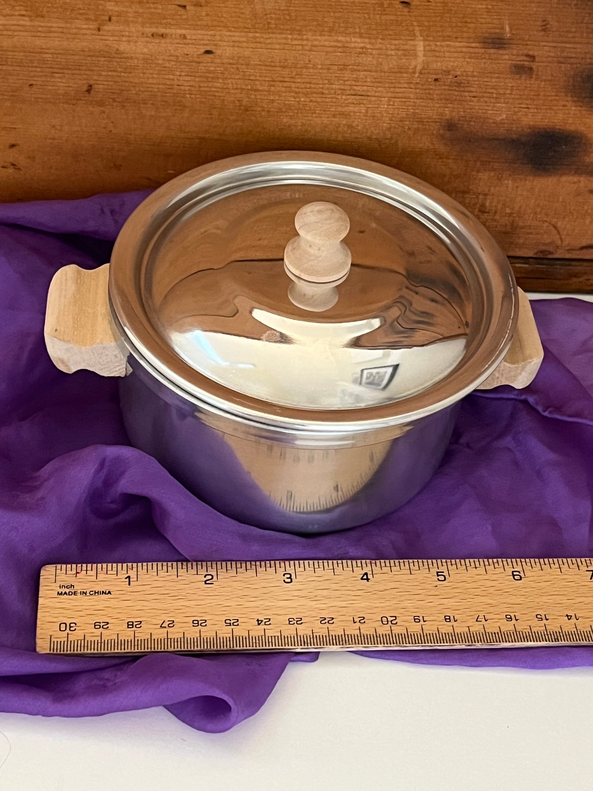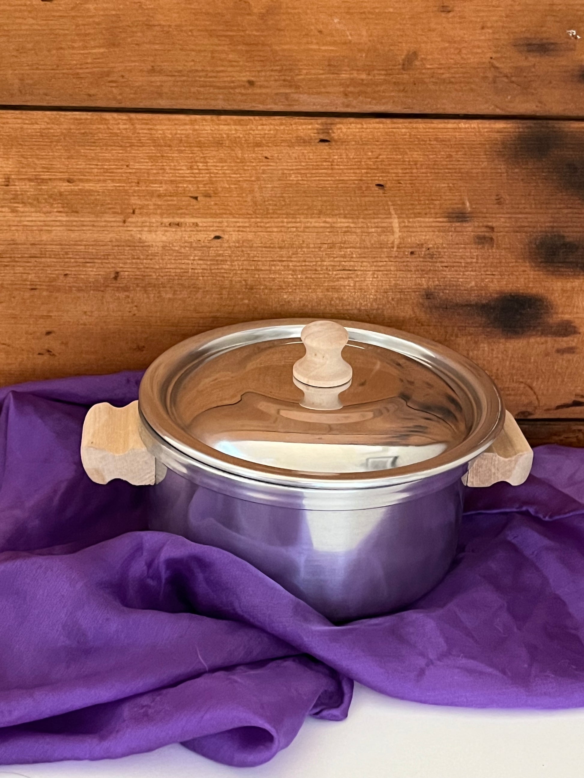 - SMALL STOCK POT, with LID and 2 side WOODEN HANDLES