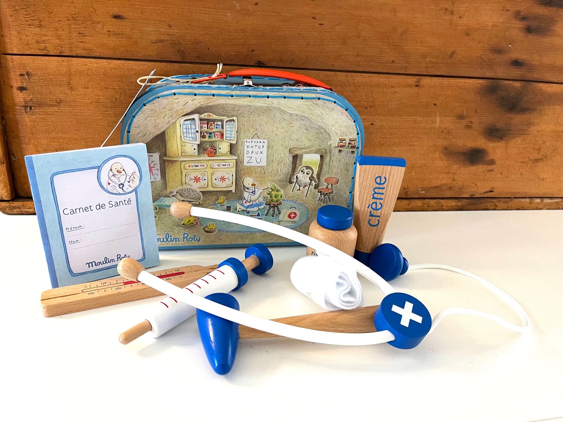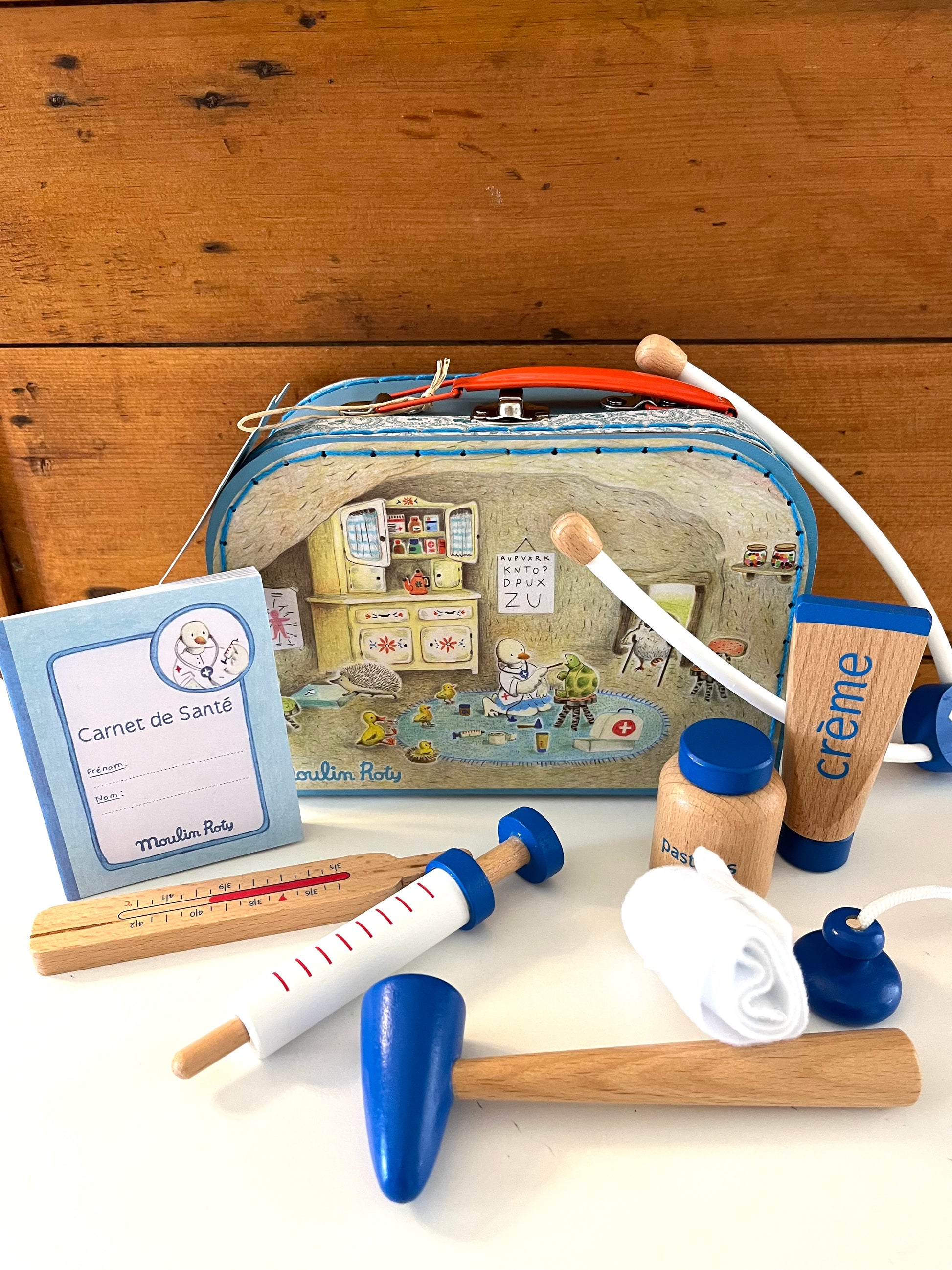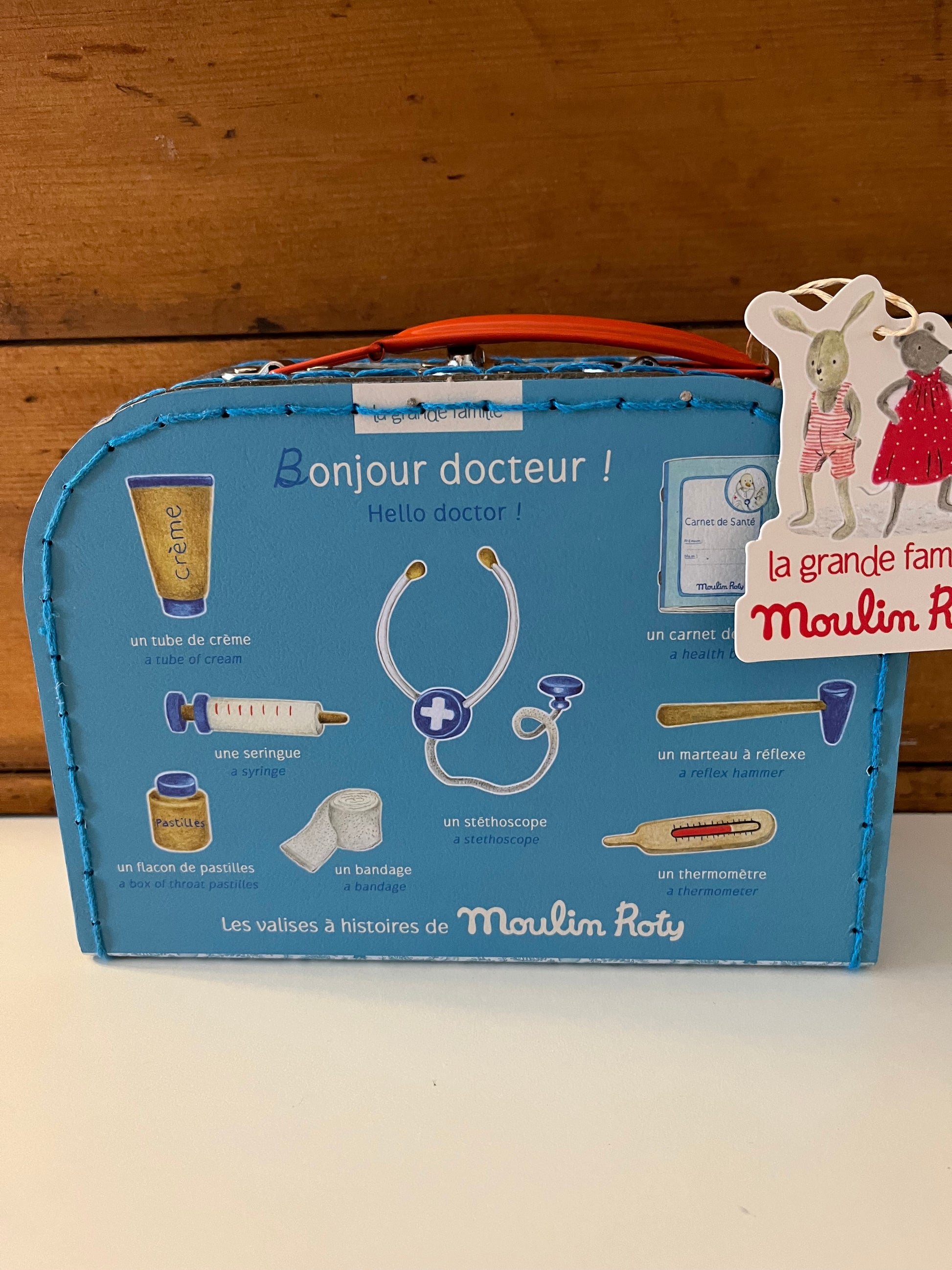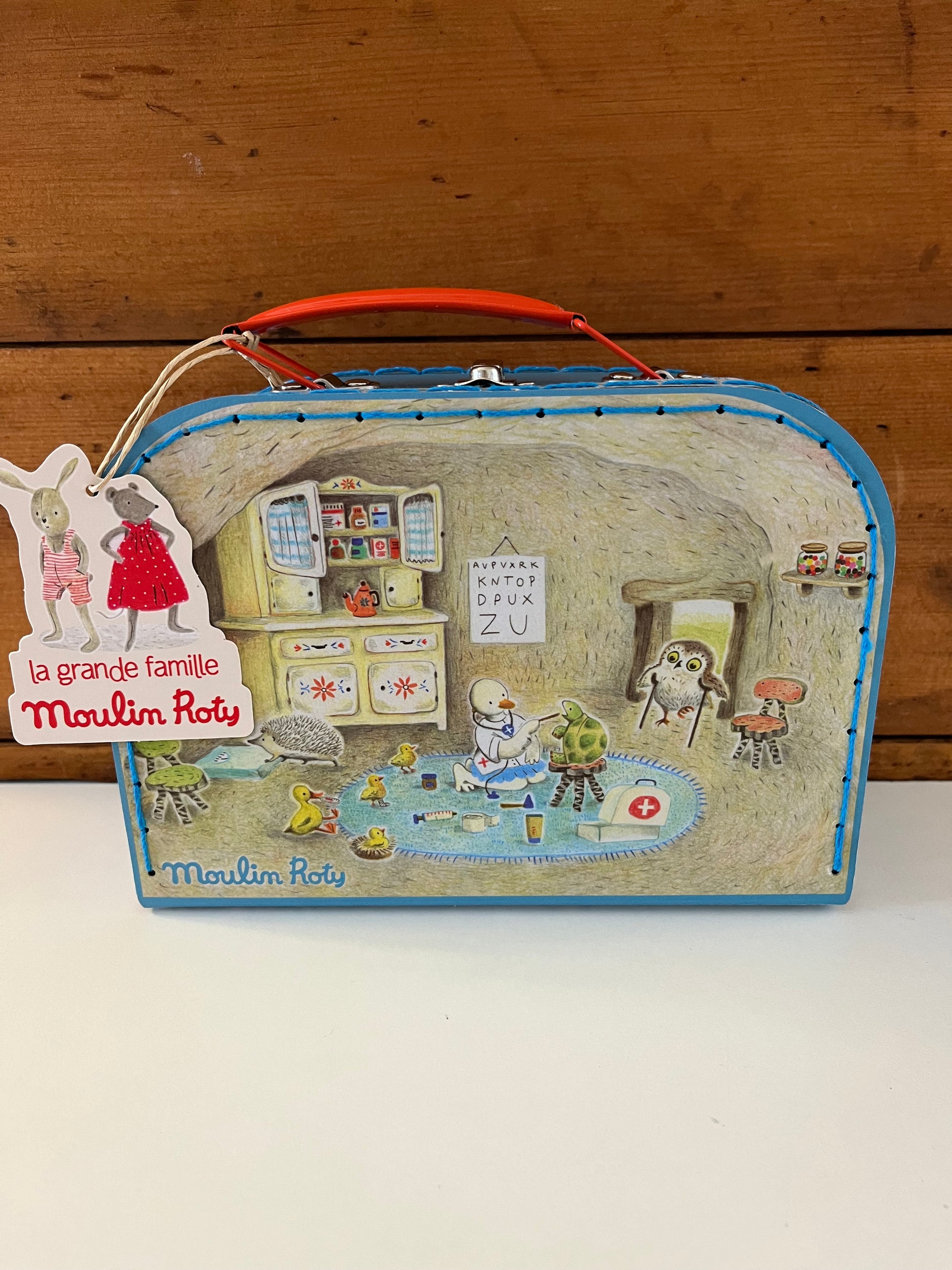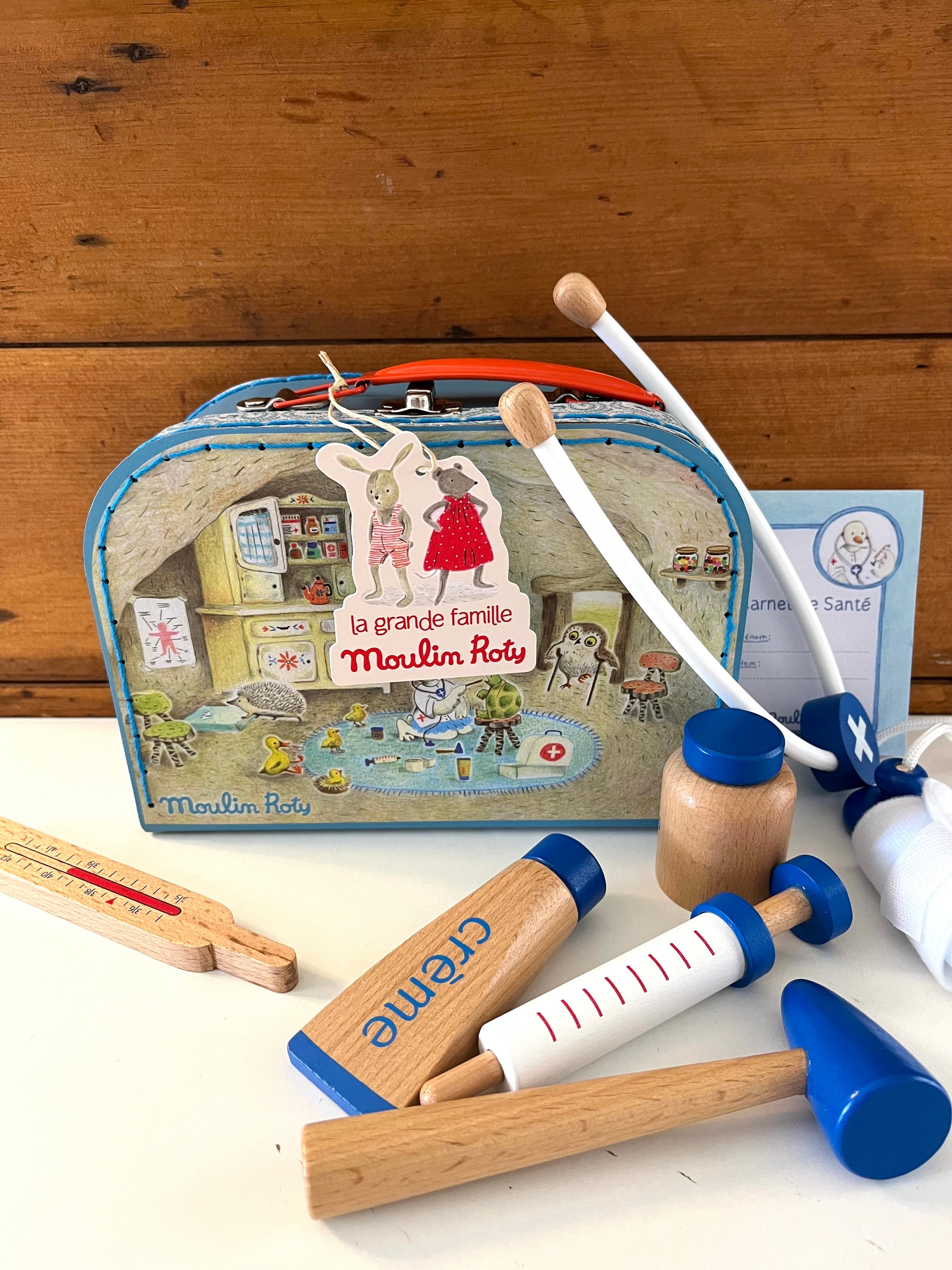 A sturdy cardboard suitcase with a metal handle and latch, this is the DOCTOR KIT by Moulin Roty, France. Encouraging imaginative play with beautiful toys for lucky children!